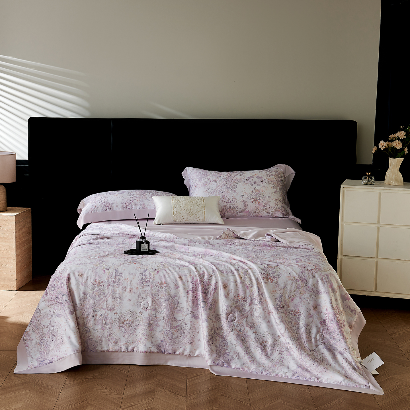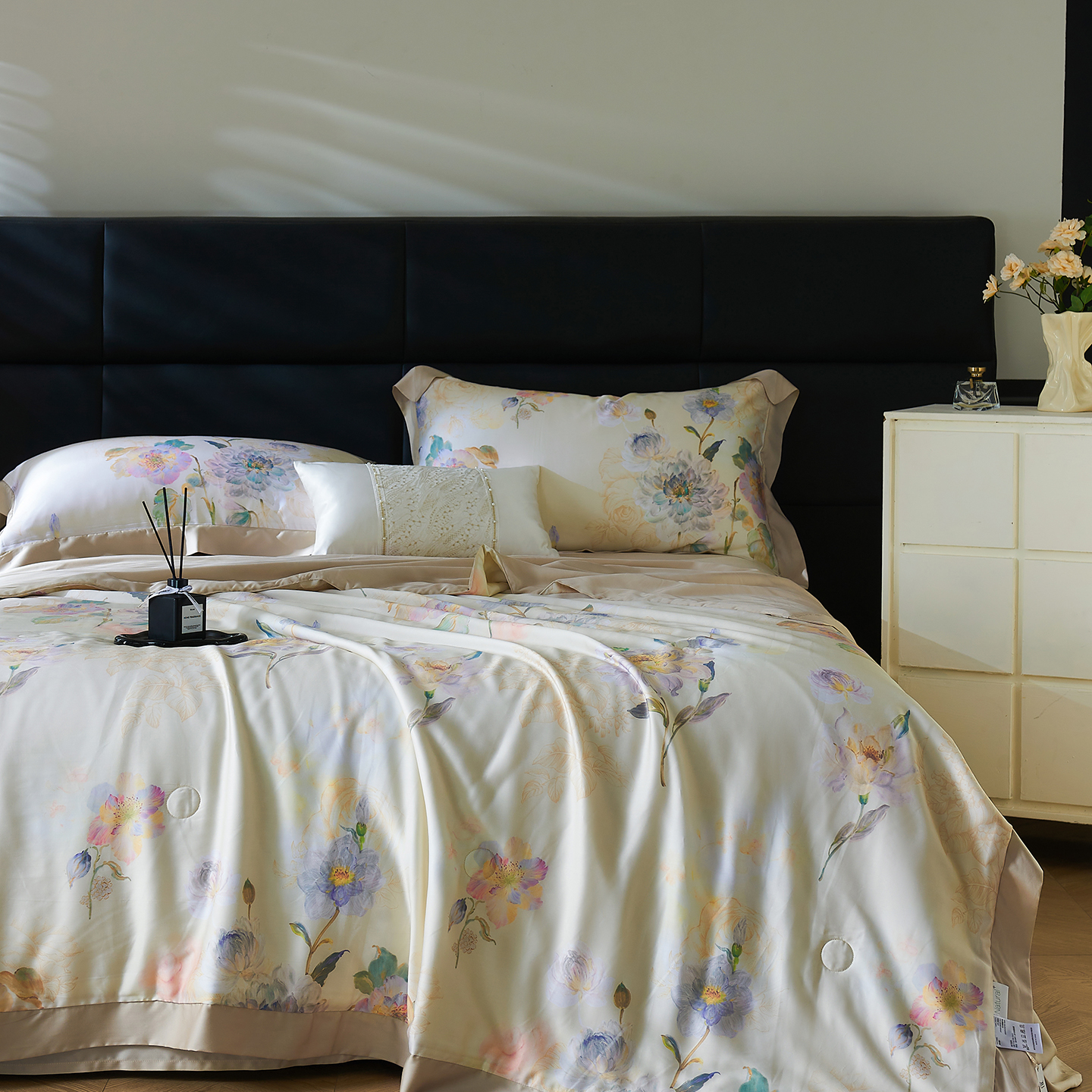 久典家居 2026新款20%桑蚕丝+80%聚酯纤维宽边印花夏被四件套 沐雨