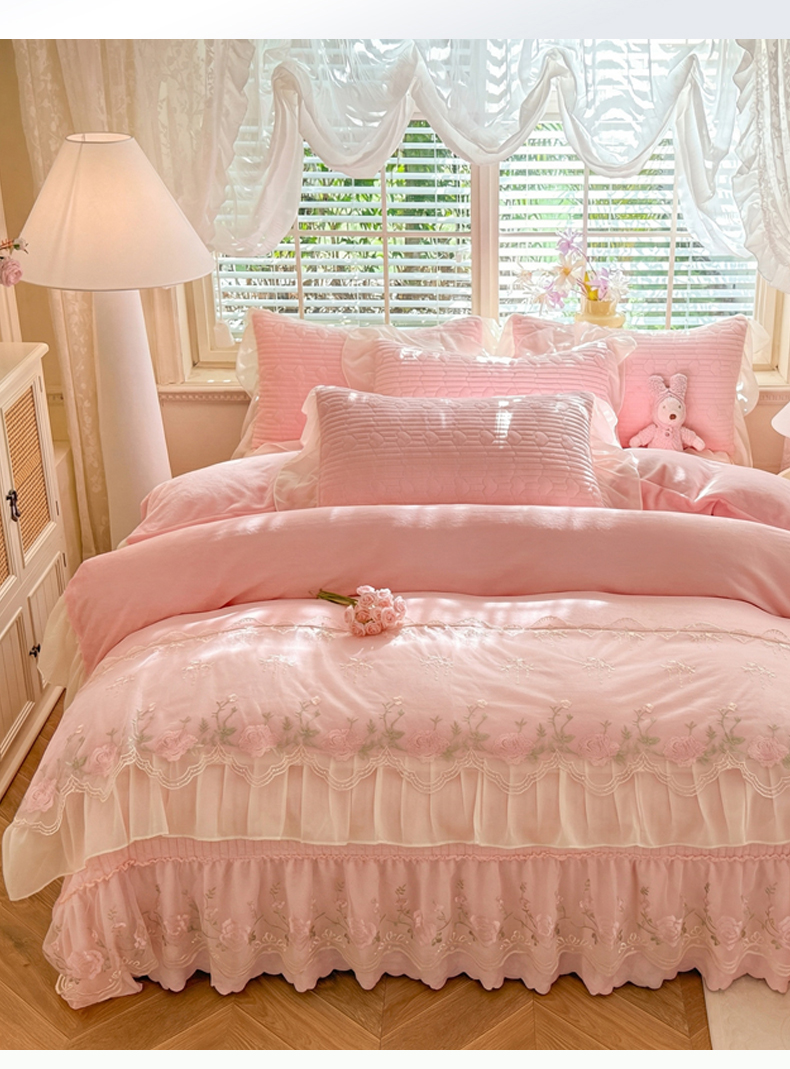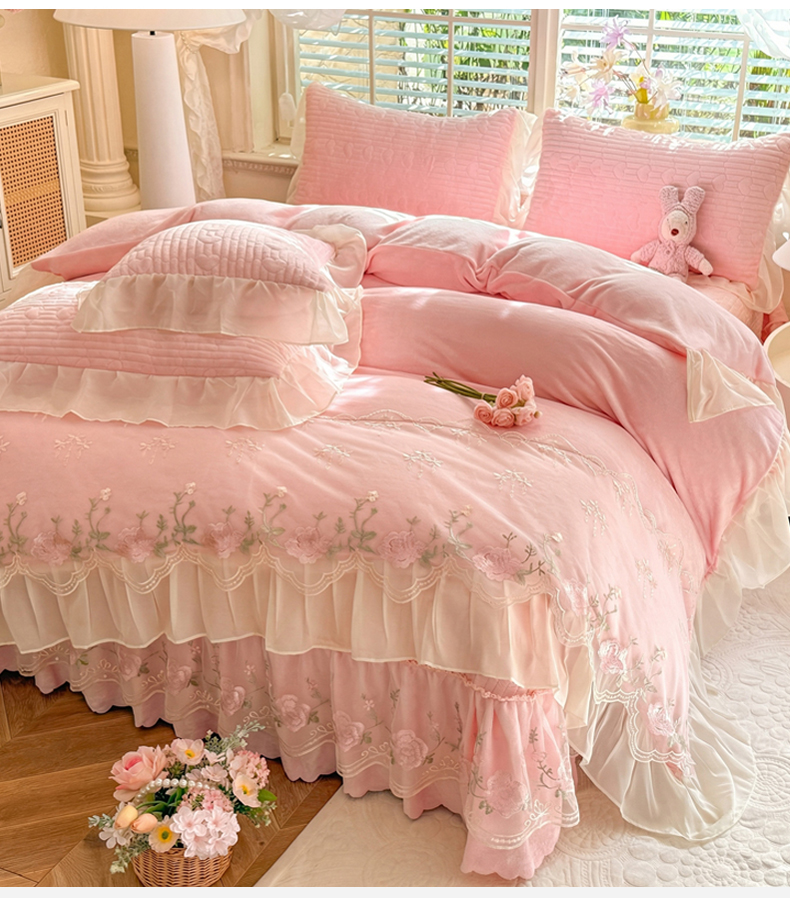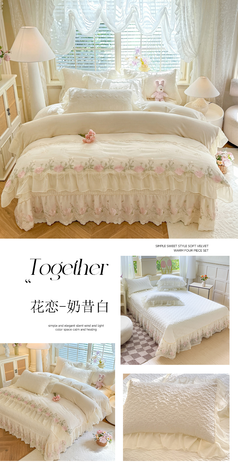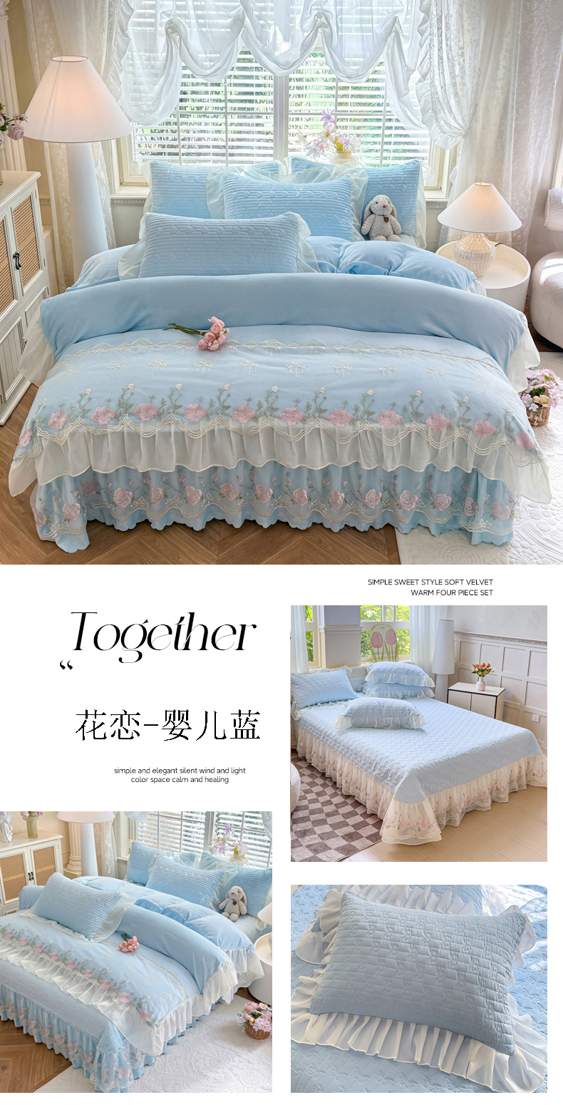 (总)苏米娜家纺SUMINA 2025新款230g高克重韩版立体盘花牛奶蚕丝绒绣花四件套床裙款被套-洛丽塔系列,洛丽塔-嫩黄 ,洛丽塔-香芋紫,洛丽塔-珍珠粉, 洛丽塔-婴儿蓝