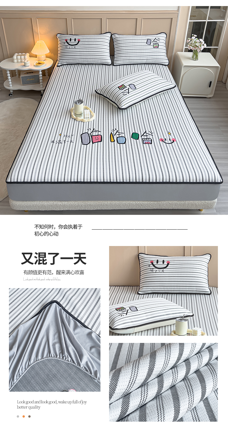 炫拼家纺 2026新款A类凉豆豆提花条纹卡通刺绣床笠席 条纹-小怪兽糖糖
