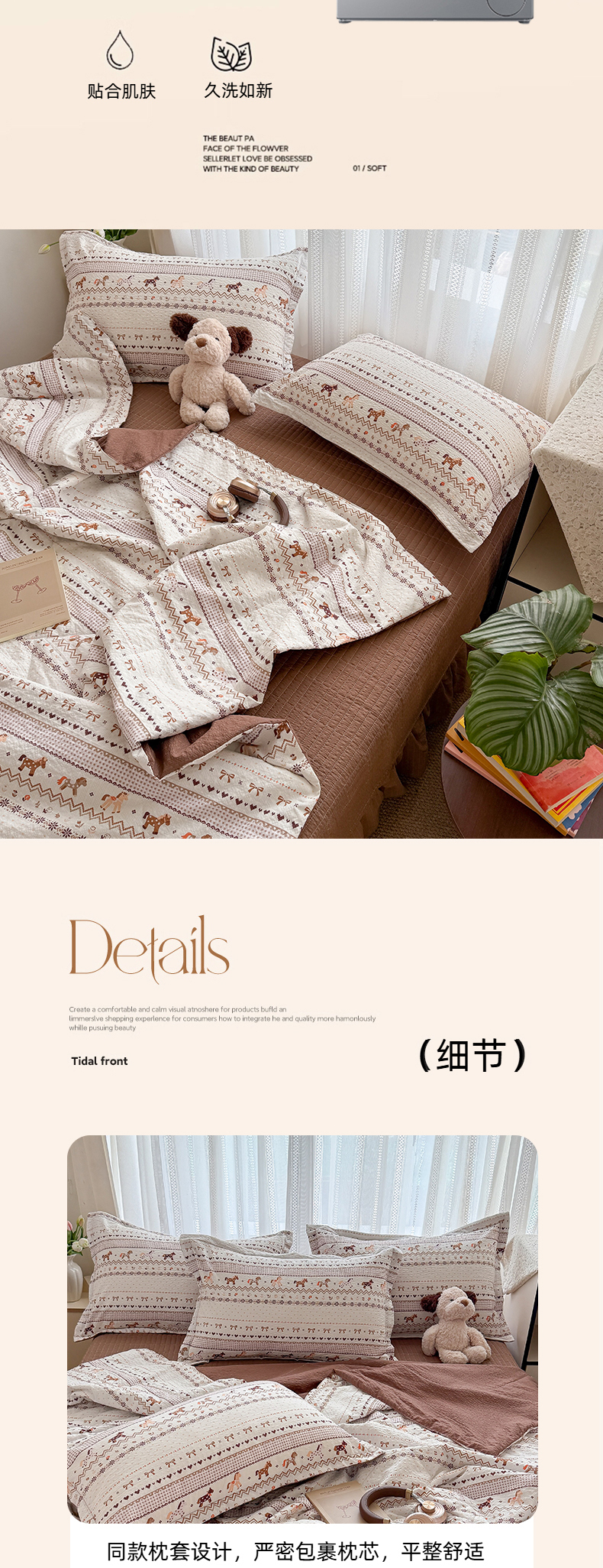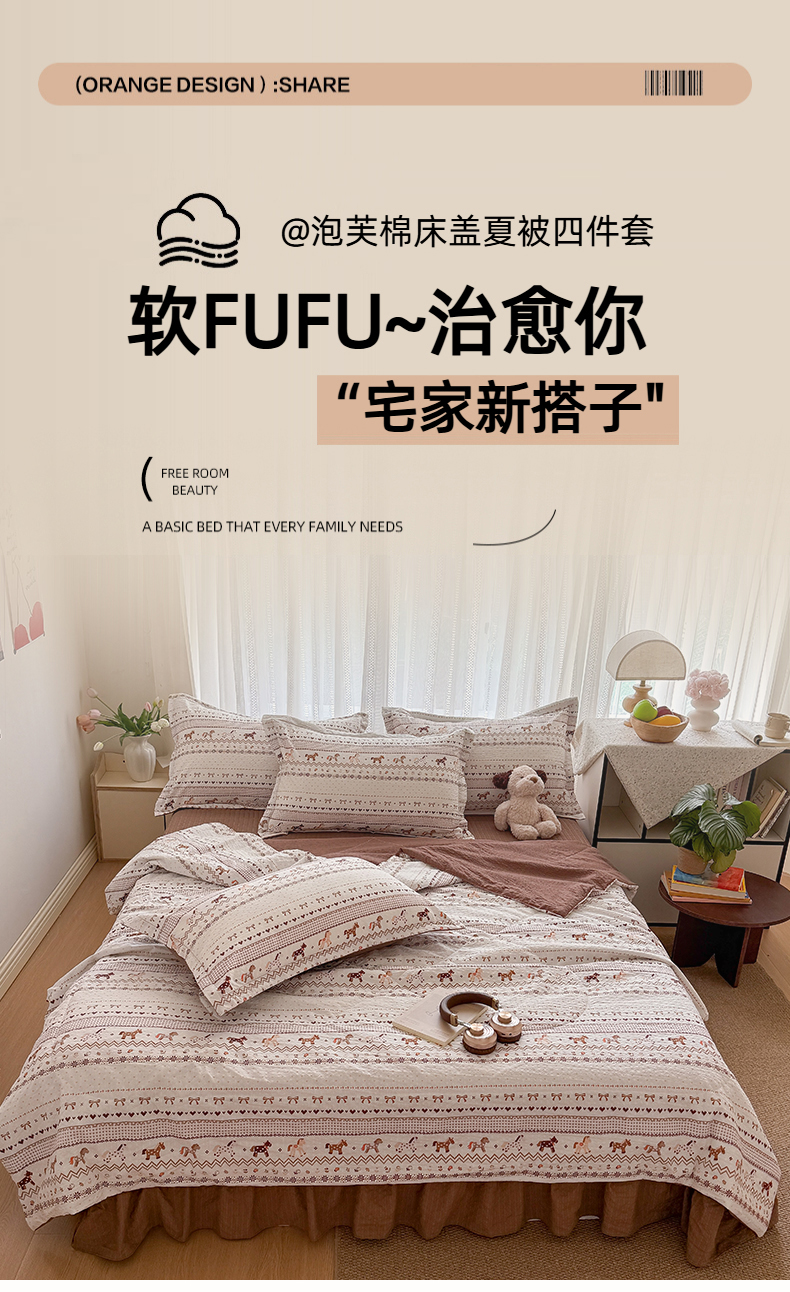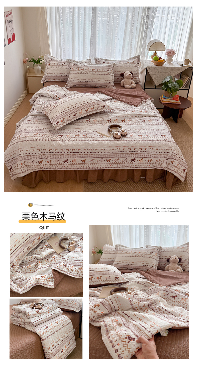 商品名称:梵希雅 2026新款云感泡芙棉泡芙纱床盖夏被四件套 栗色木马纹