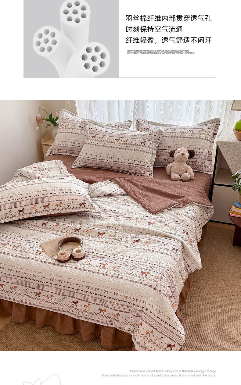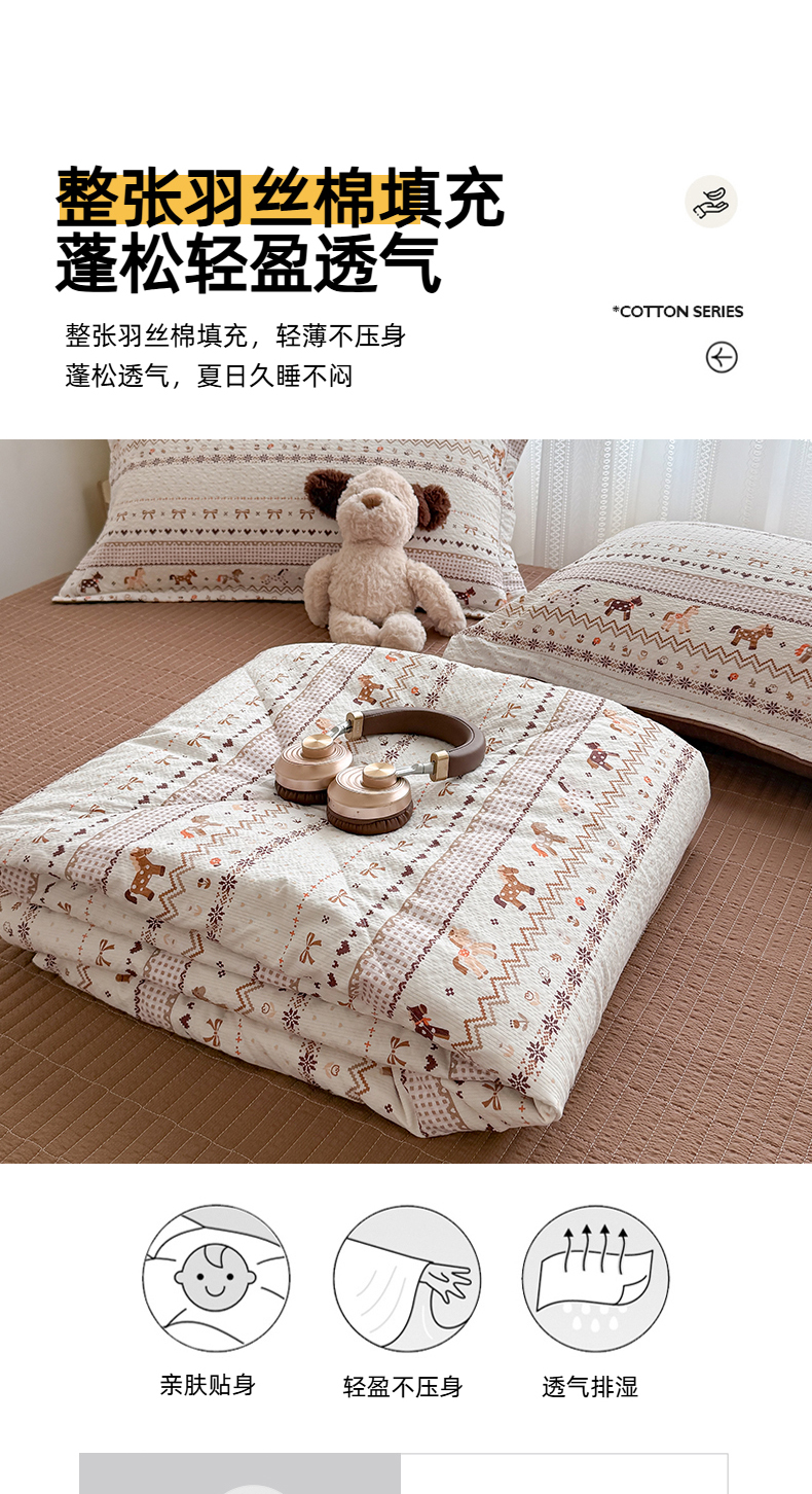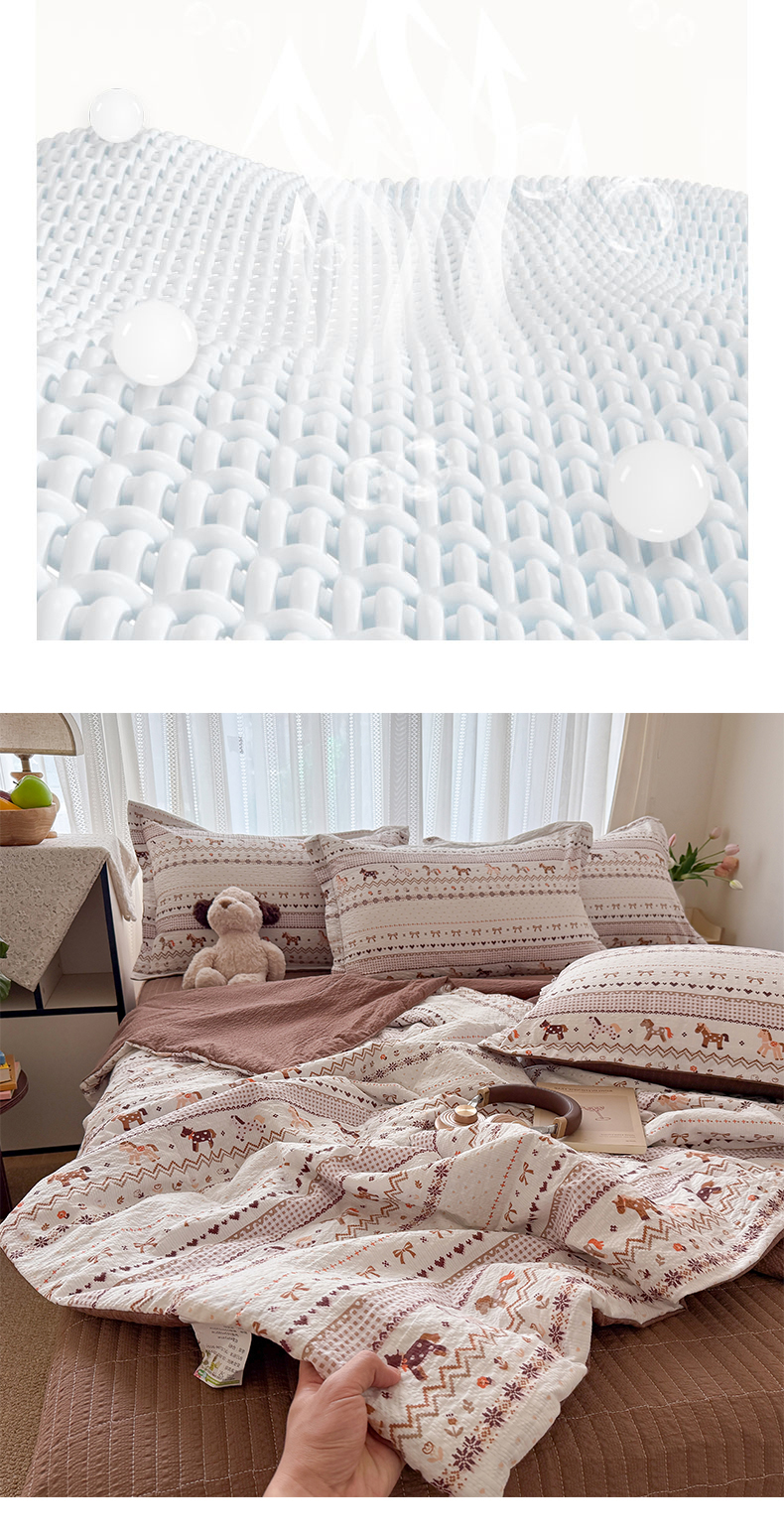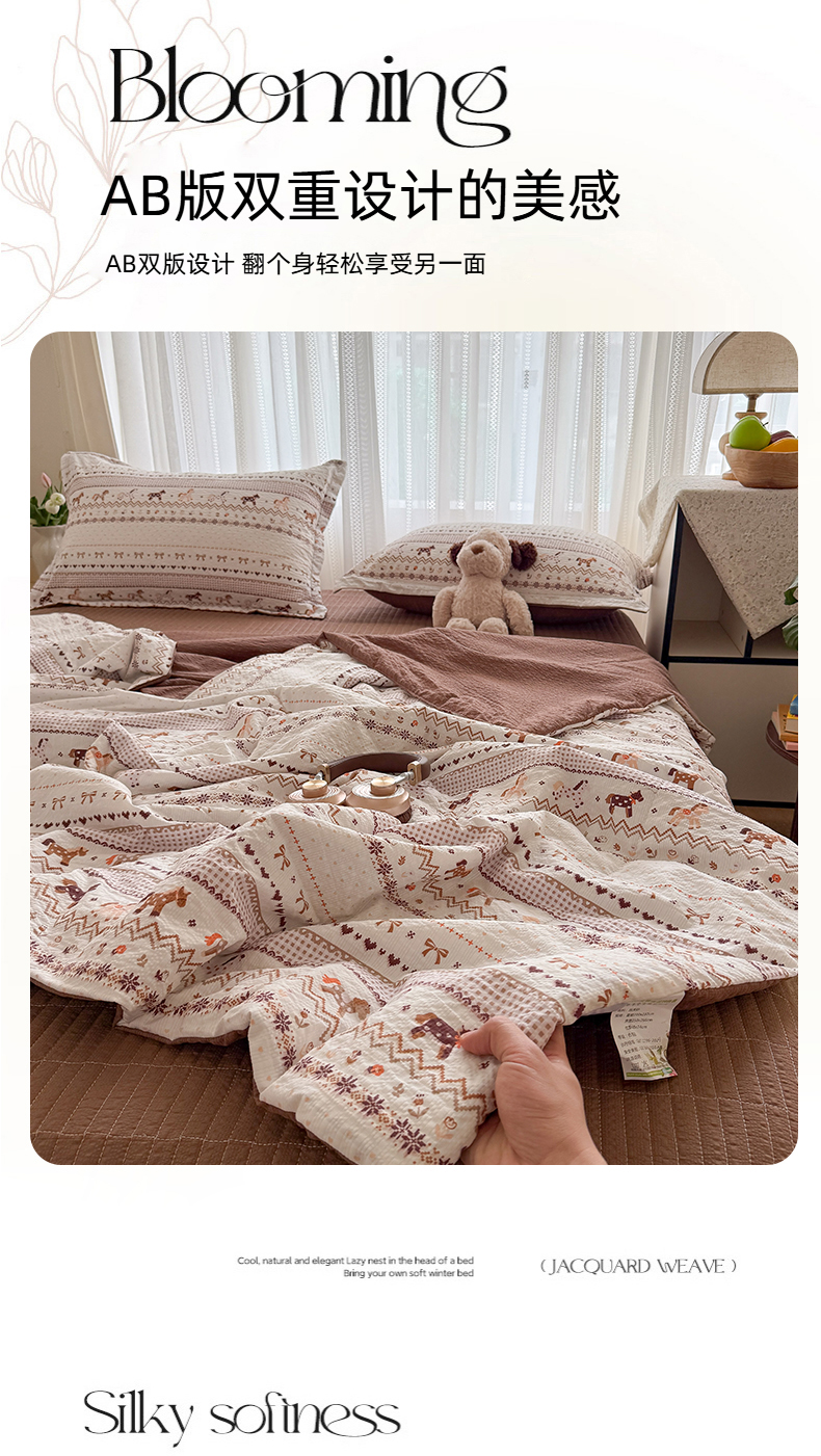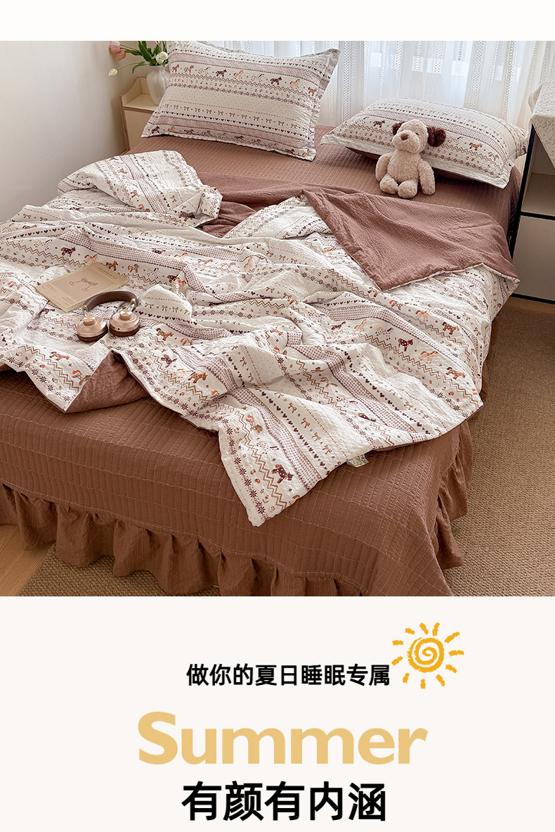(总)梵希雅 2026新款A类贝壳秀费尔岛风泡芙棉夏被空调被四件套,红棕萌犬-夏被,焦糖木马-夏被,甜粉摇马-夏被,雾蓝自由马-夏被,棕蓝麋鹿-夏被