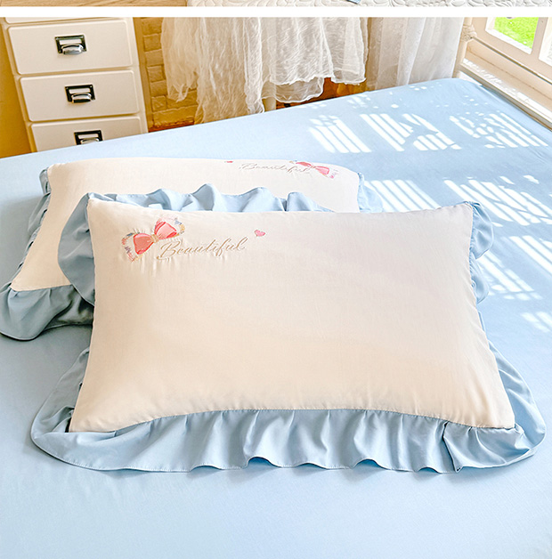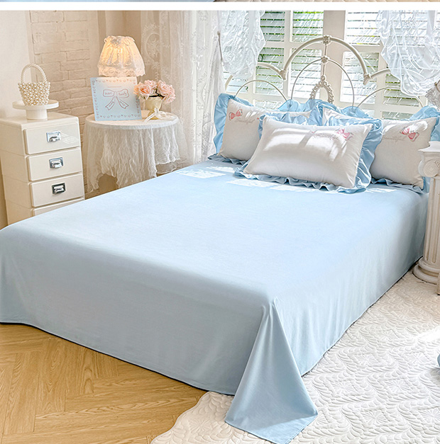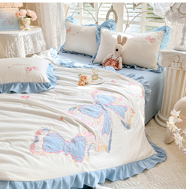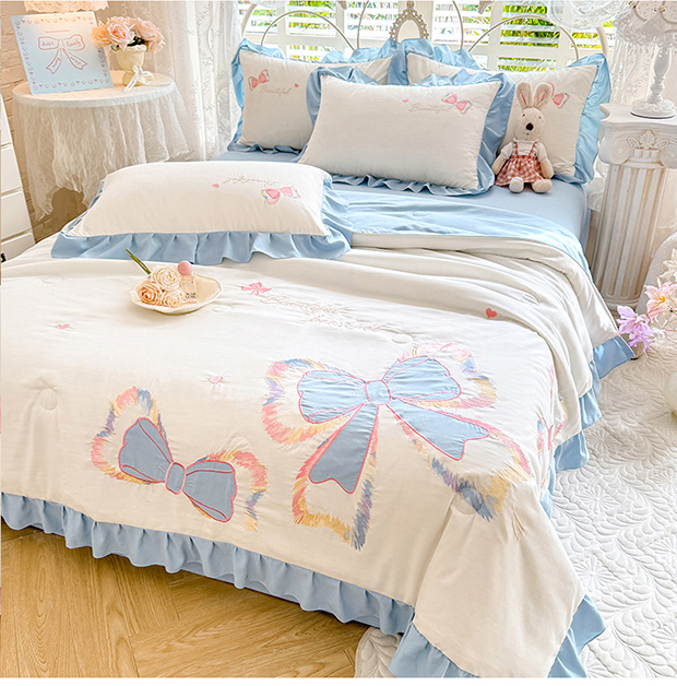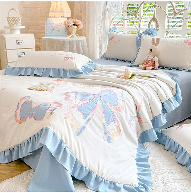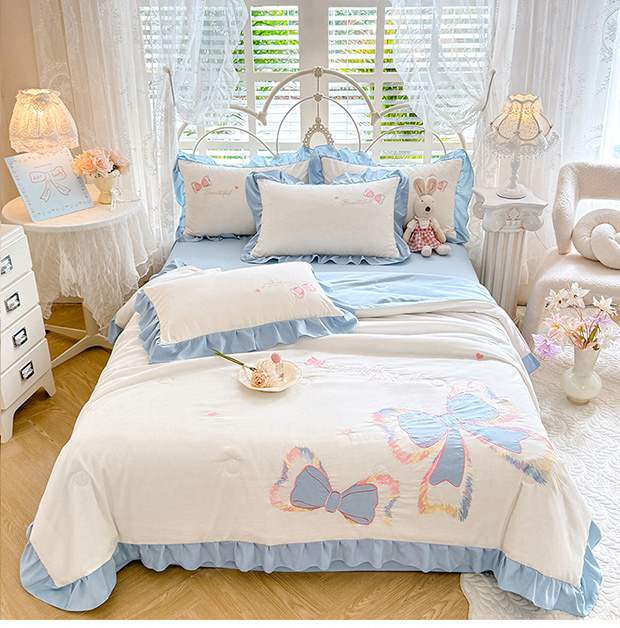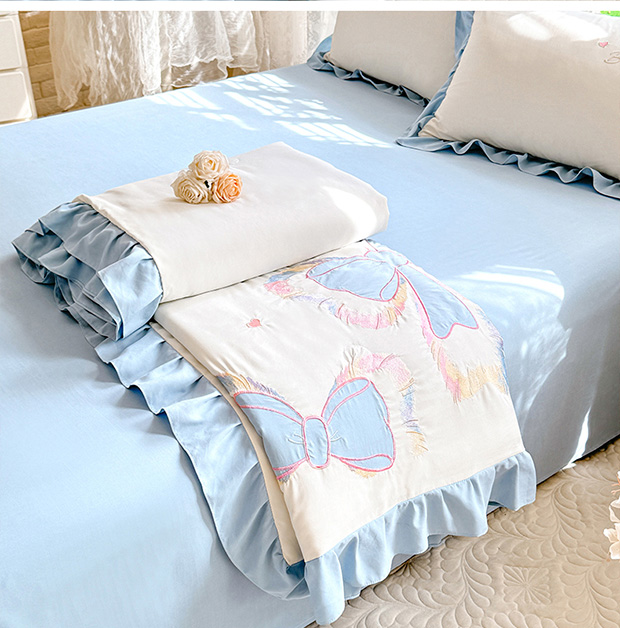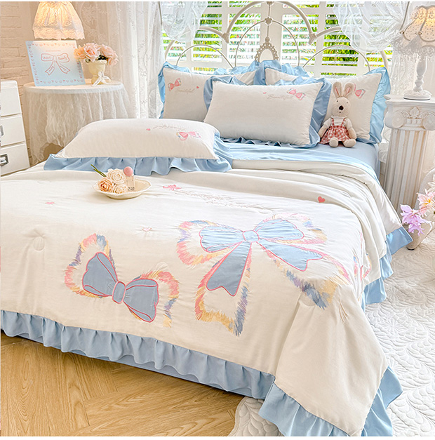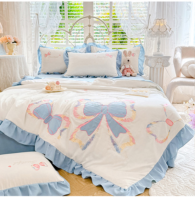 绒棉世家 2026新款水洗棉贴布绣专版夏被四件套 邂逅蝴蝶结蓝