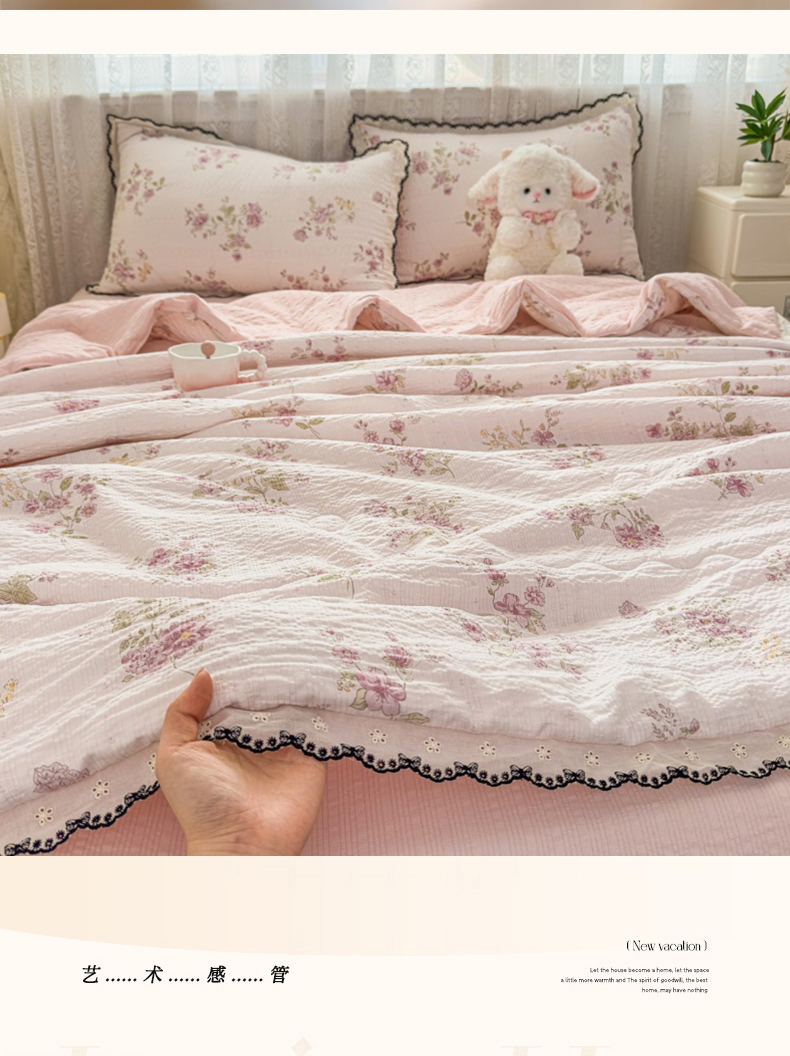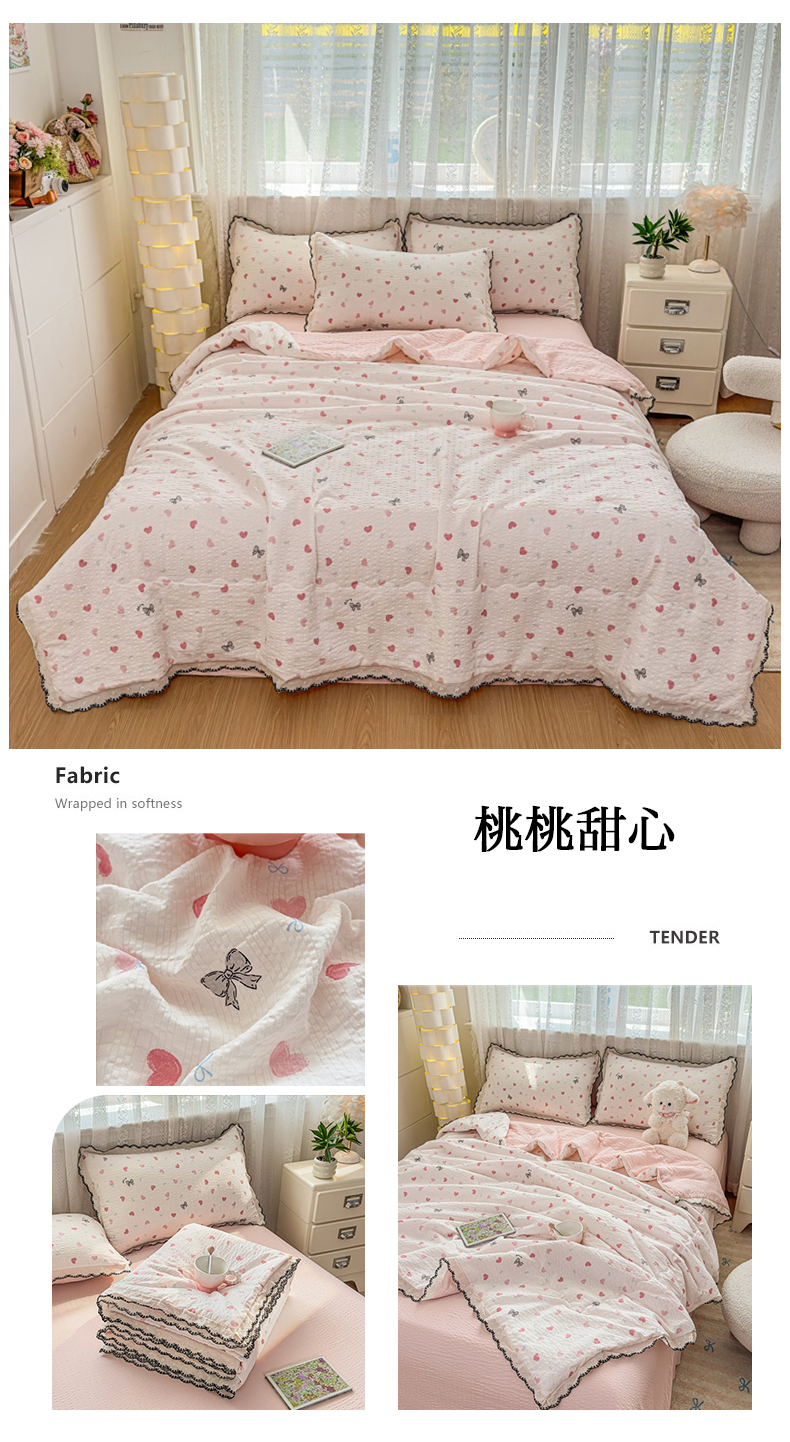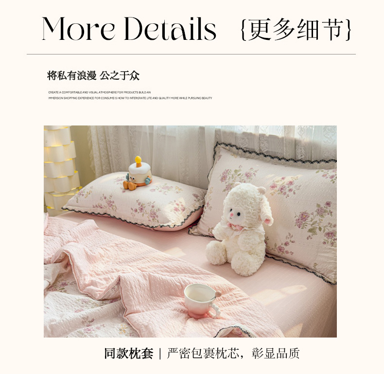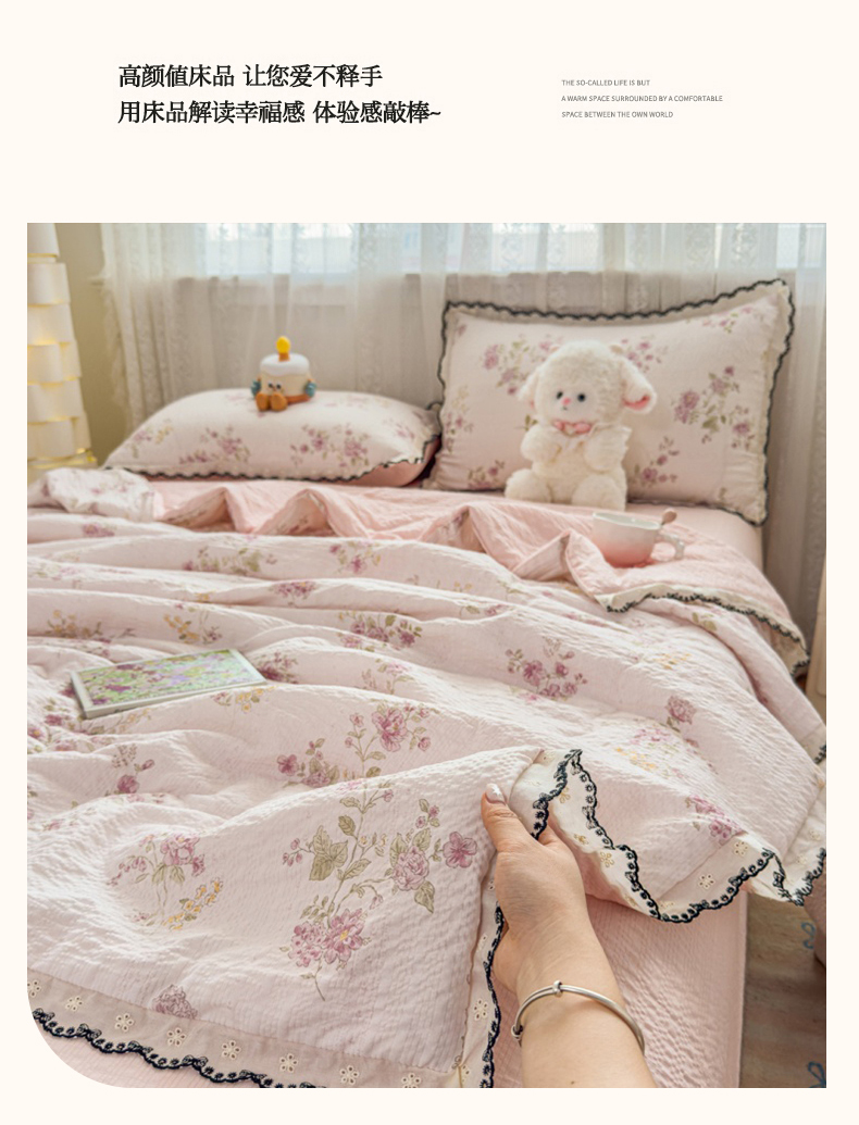(总)赫本家纺 2026新款全棉镂空花边云感印花双层纱夏被四件套,粉雾轻蔷薇,海盐蝴蝶结,灰糖花房,灰糖心事,焦糖奶芙,绿野精灵,暖茶花园,青雾花野,晴朗紫,软萌小马,桃桃甜心,雾蓝格小兔