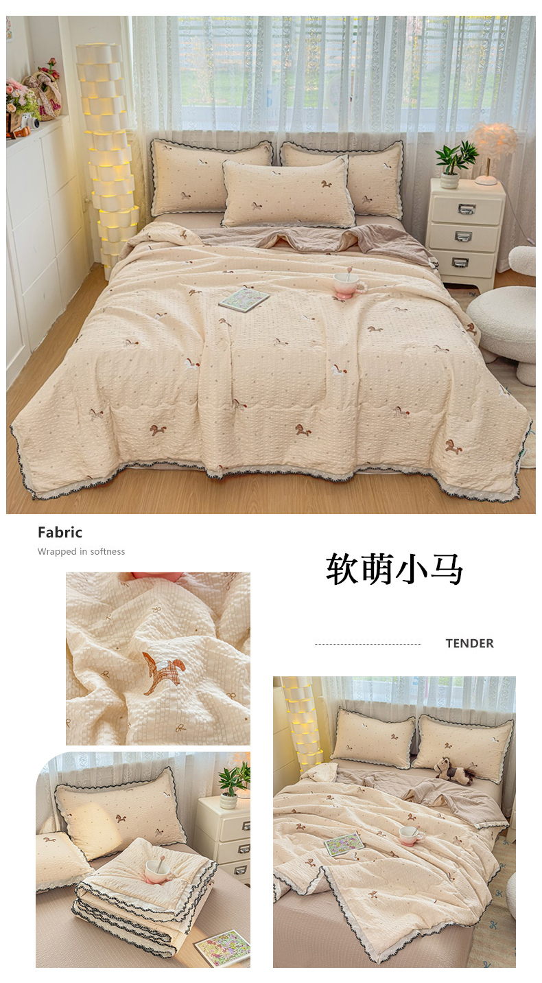 商品名称:赫本家纺 2026新款全棉镂空花边云感印花双层纱夏被四件套 软萌小马