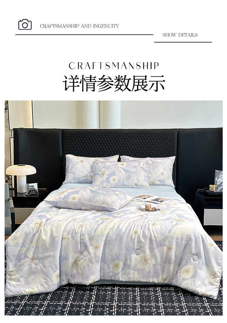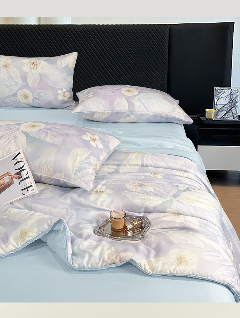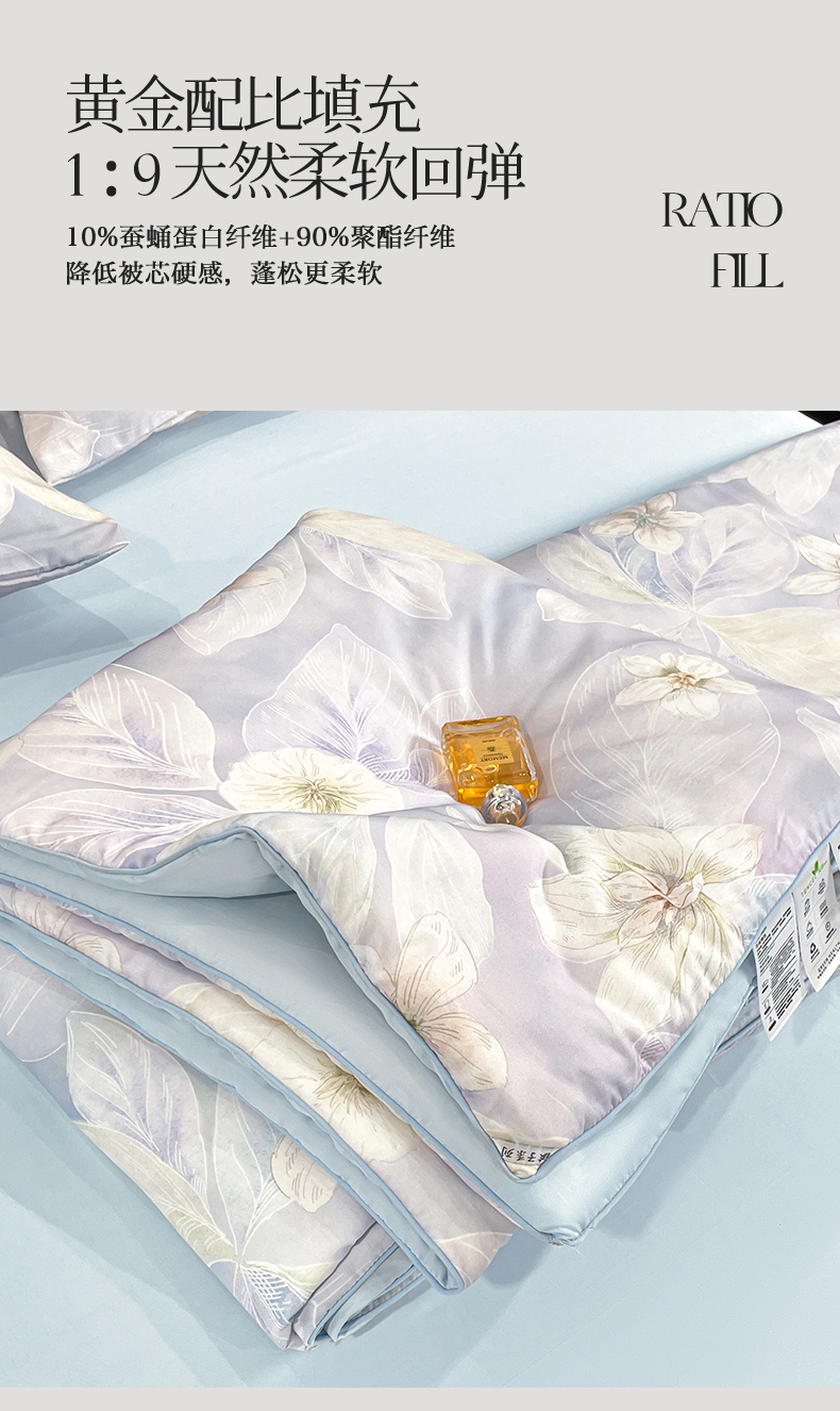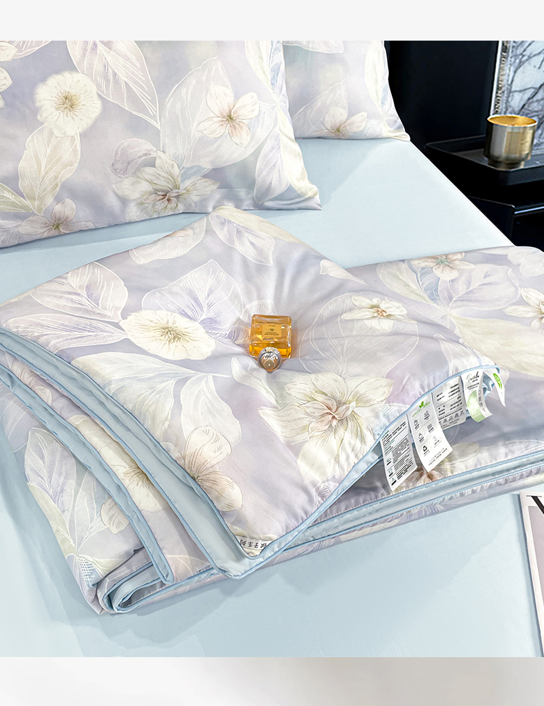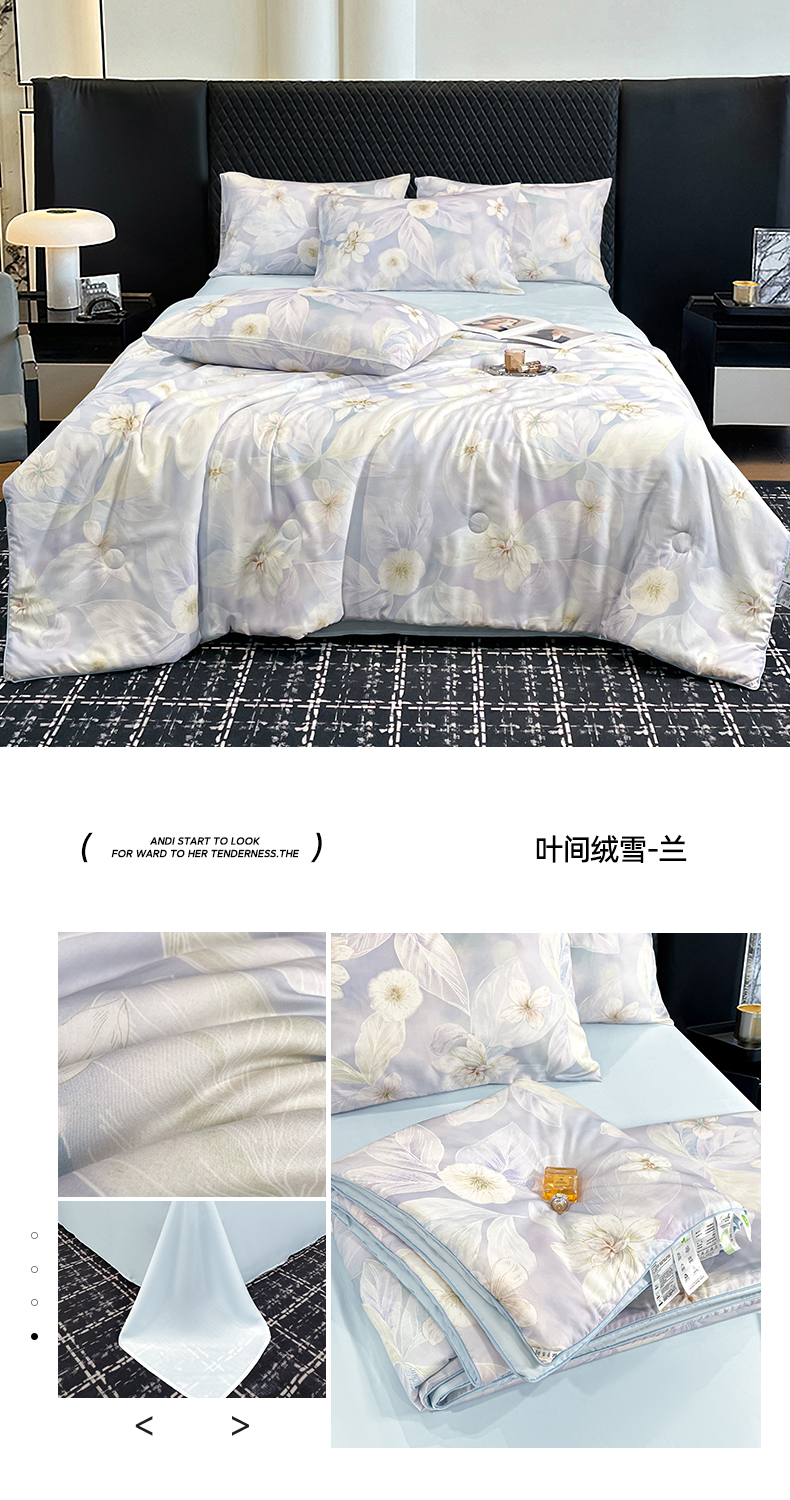 • 91家纺网 家纺一手货源 找家纺 尊妙被业 2026春夏新款莱赛尔天丝夏被蚕蛹蛋白夏被夏凉被空调被四件套-印花款 叶间绒雪-兰