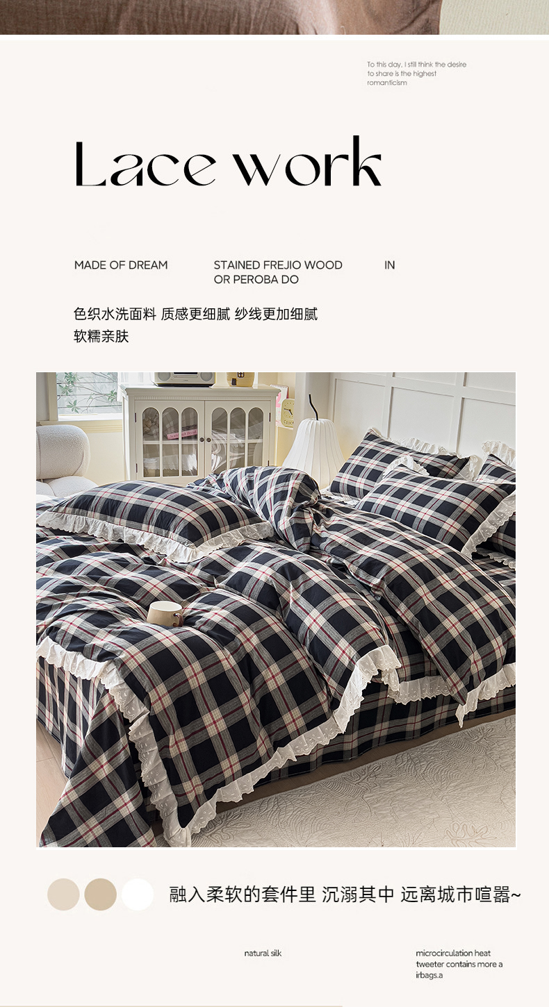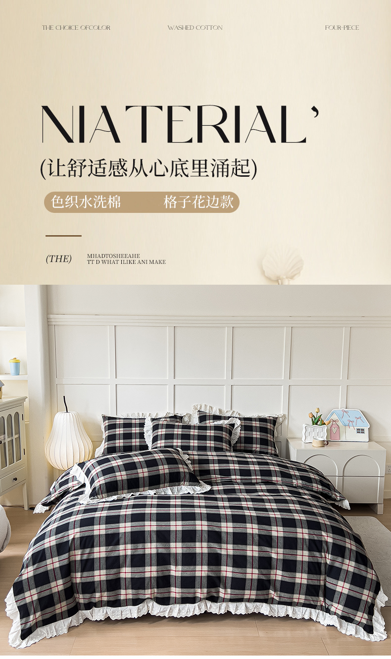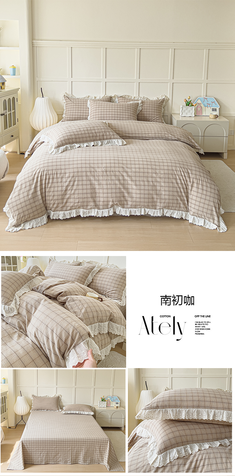 (总)花香四季家纺 2026全棉色织水洗棉法式公主风花边床单款床笠款四件套,初见咖,高智黑,米兰红,南初咖,云漫黑