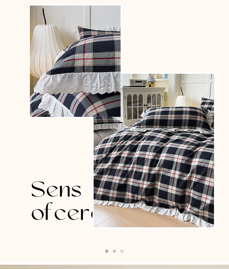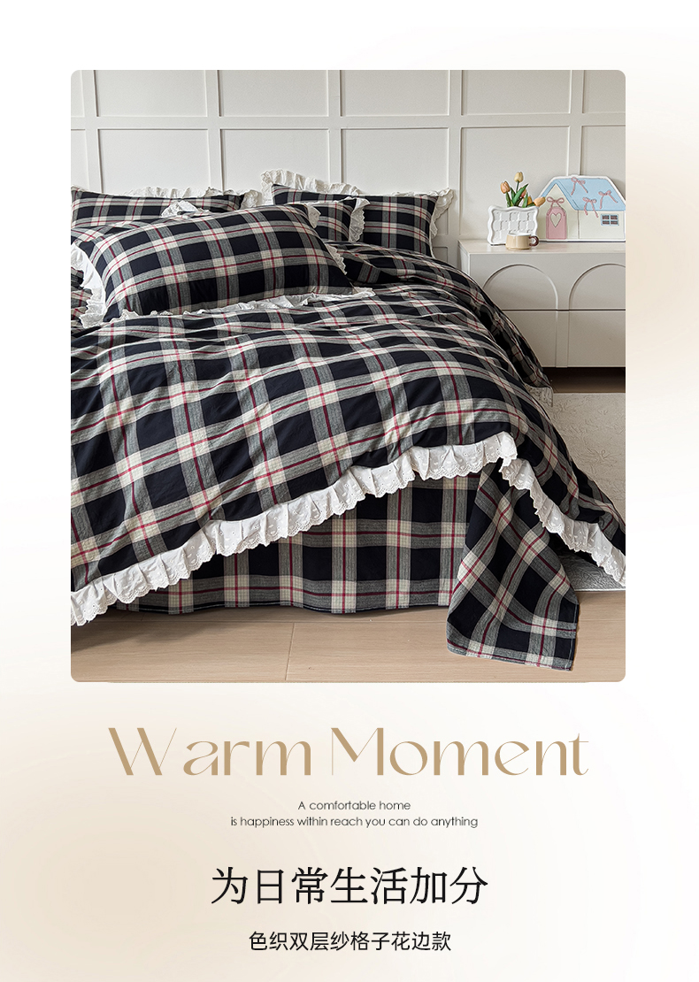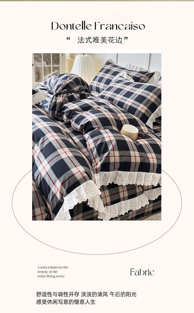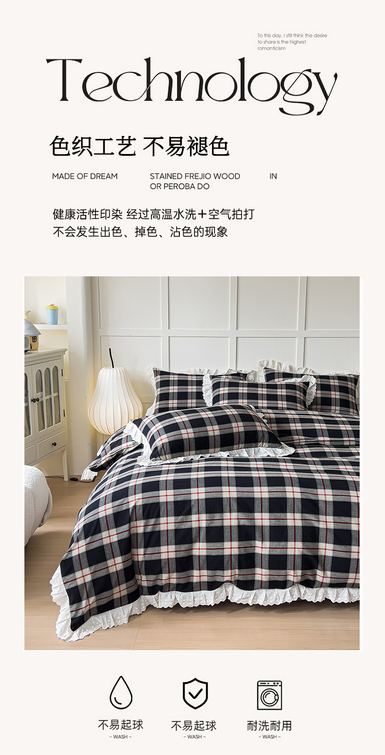 (总)花香四季家纺 2026全棉色织水洗棉法式公主风花边床单款床笠款四件套,初见咖,高智黑,米兰红,南初咖,云漫黑