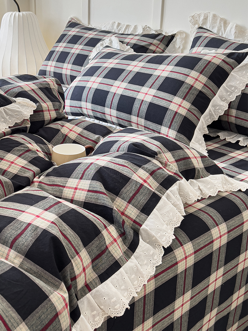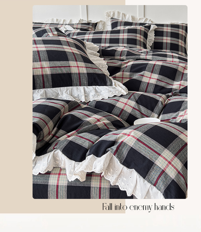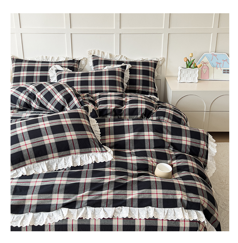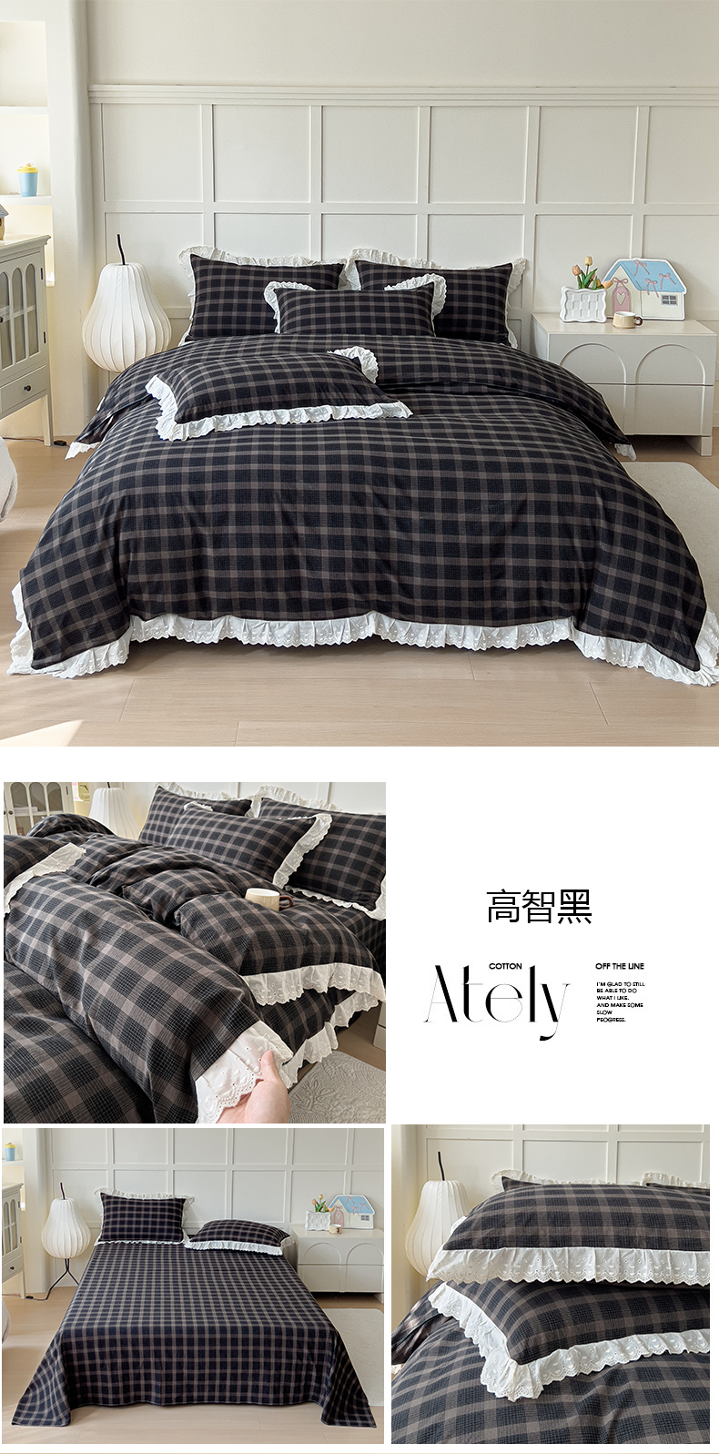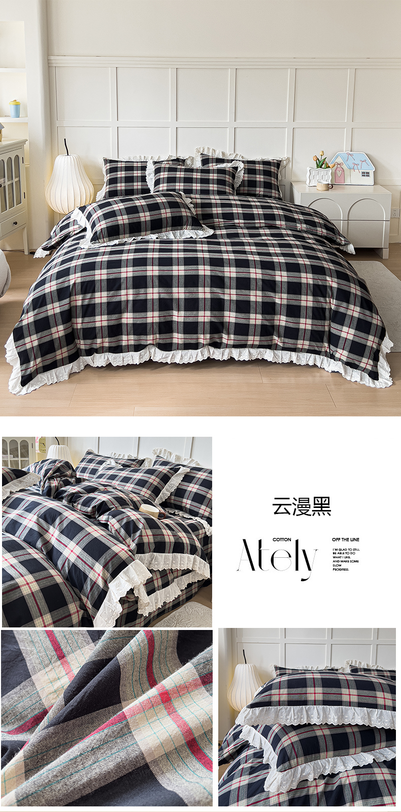 花香四季家纺 2026全棉色织水洗棉法式公主风花边床单款床笠款四件套 云漫黑