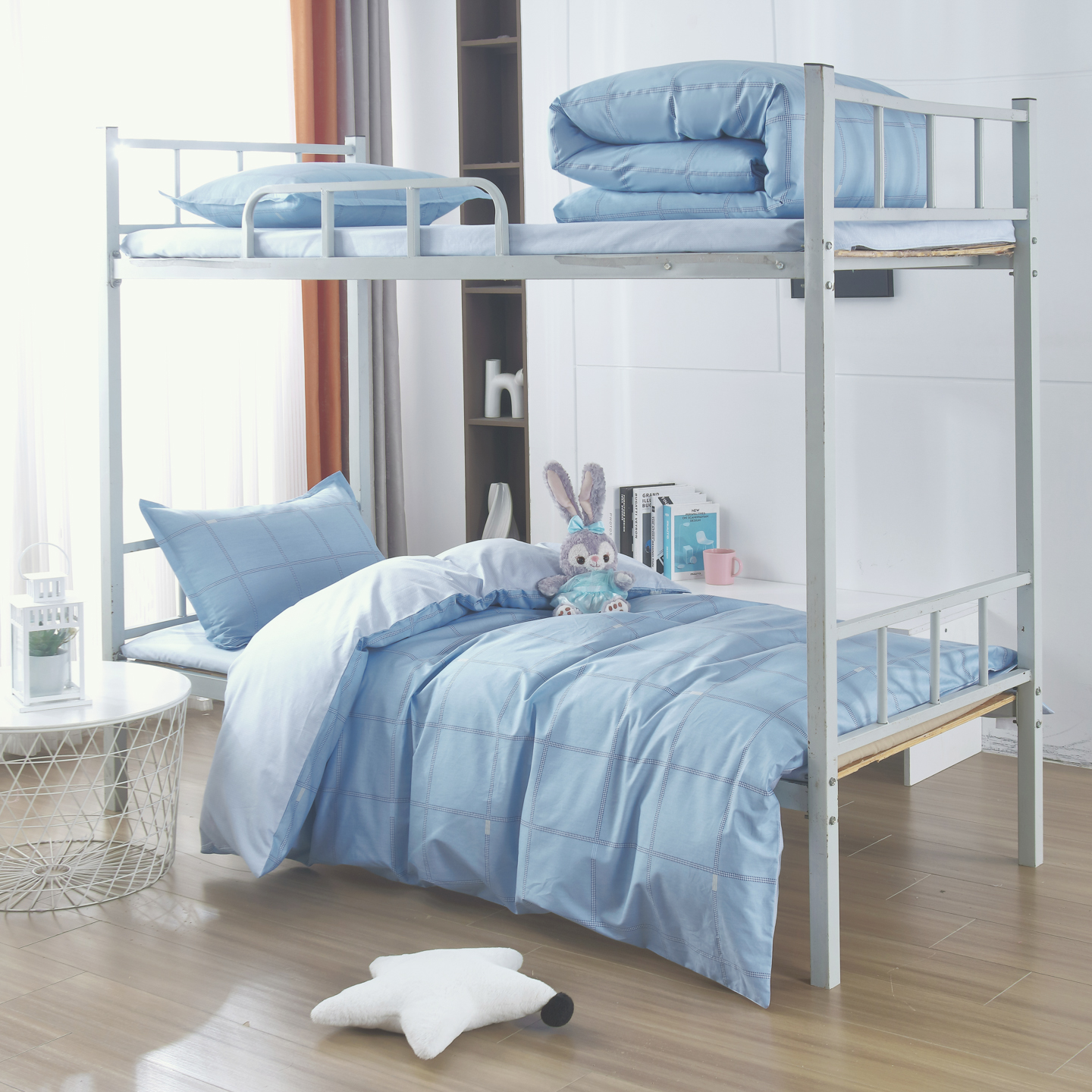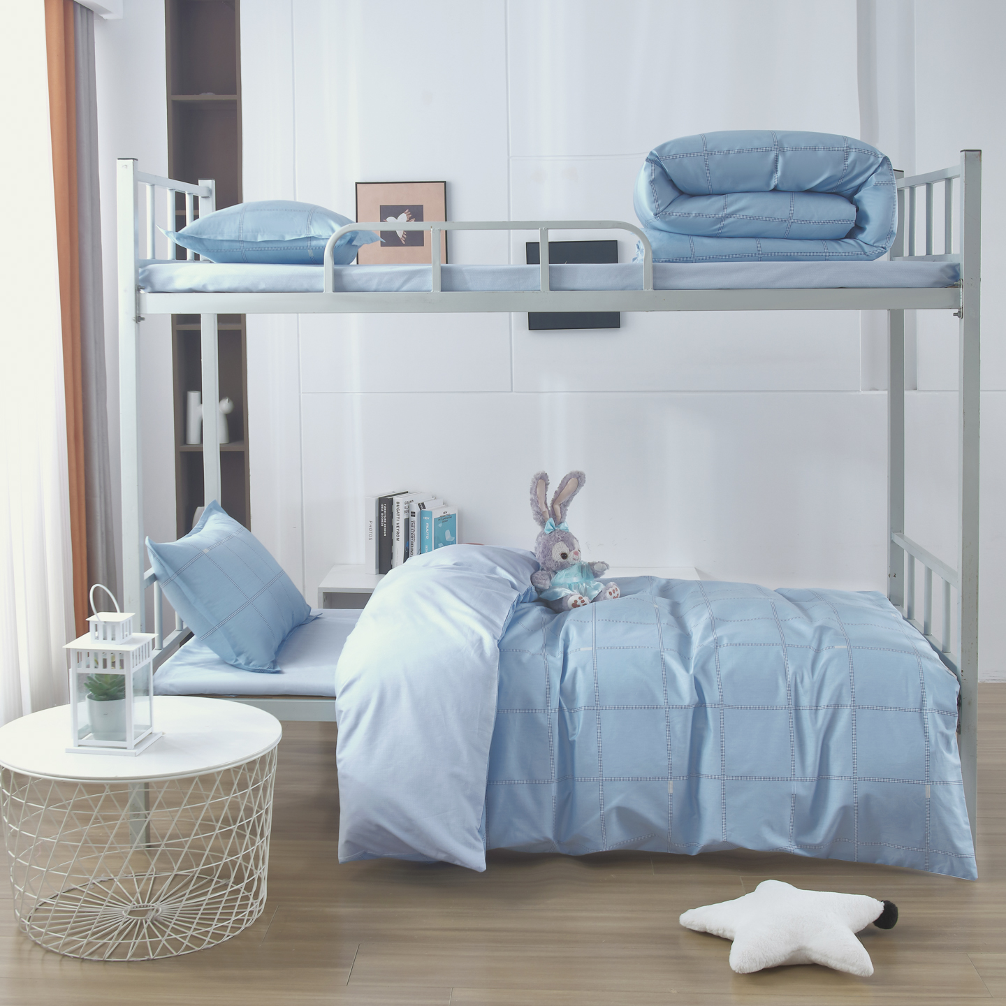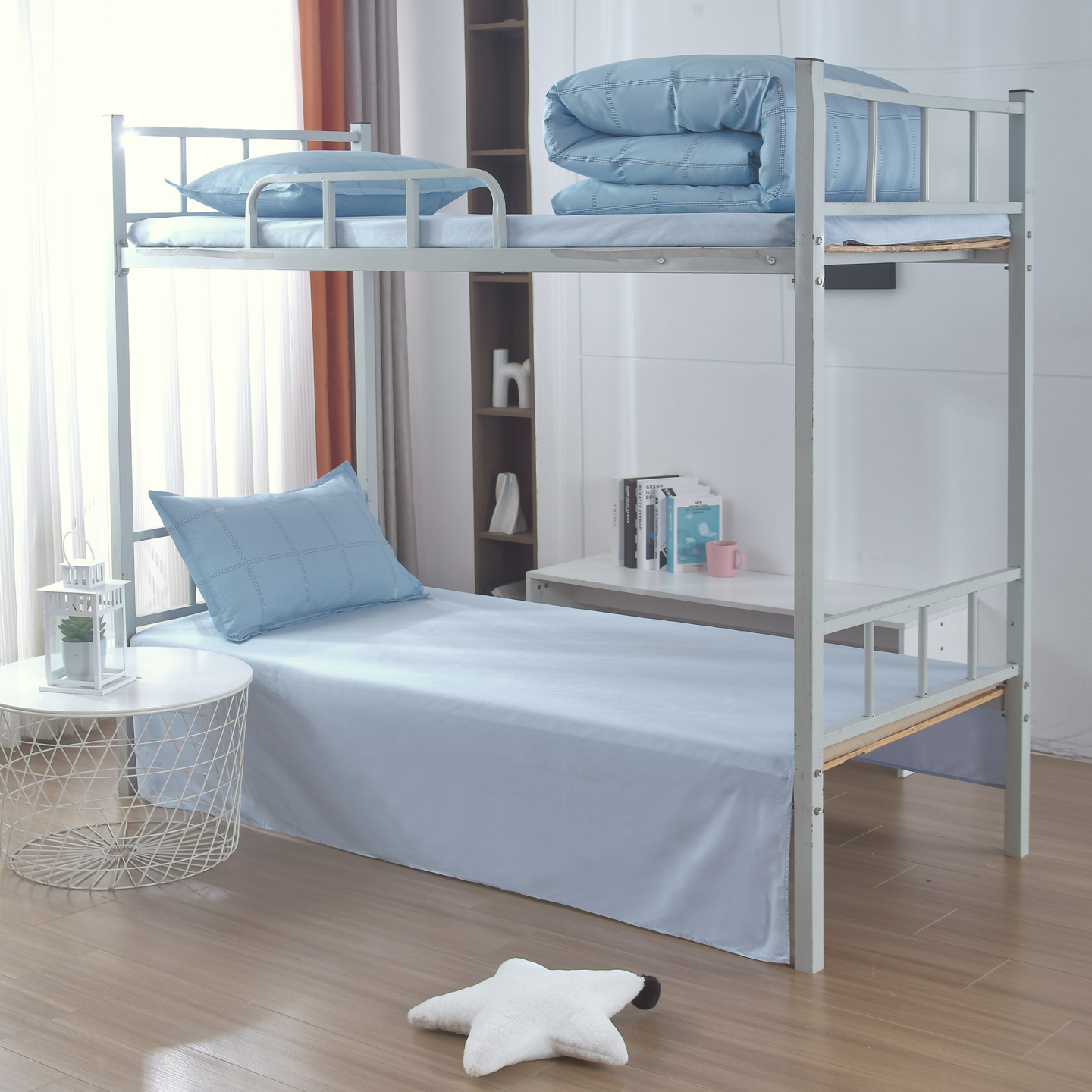 • 91家纺网 家纺一手货源 找家纺 (总)雅绅阁 2024新款学生宿舍医疗专用涤棉三六件套,白色缎条,蓝条