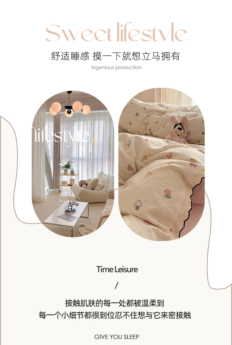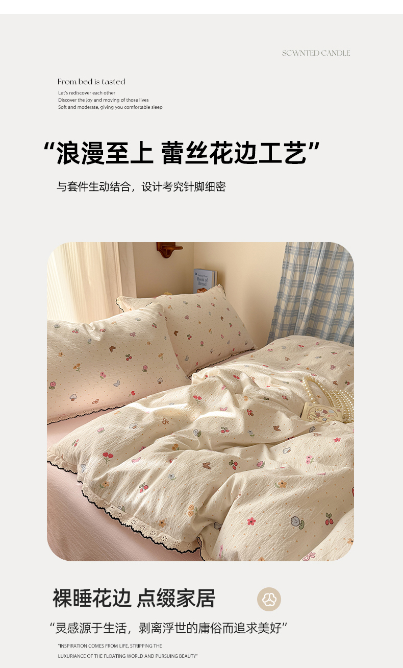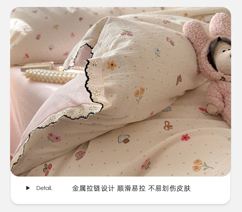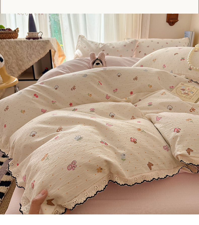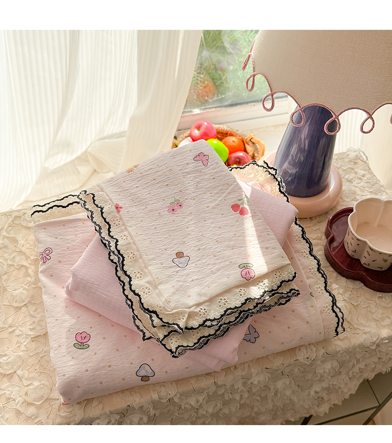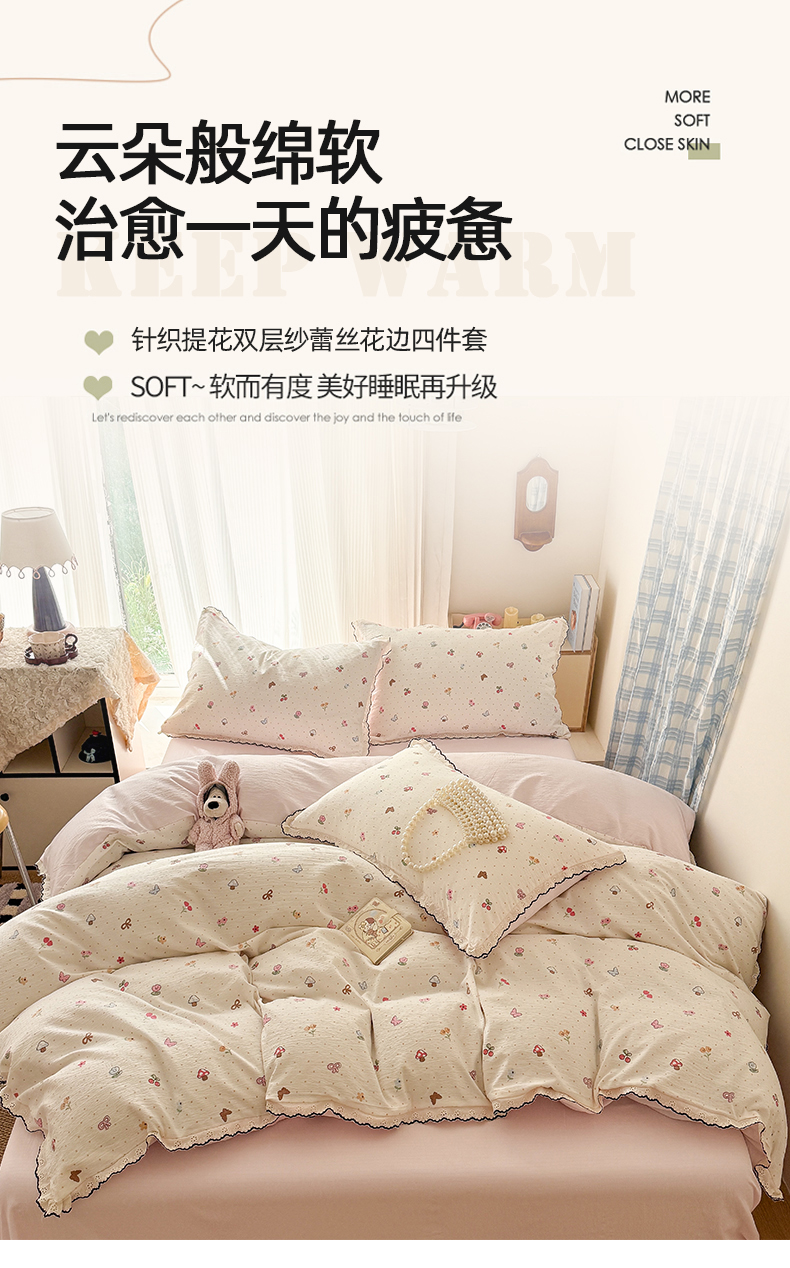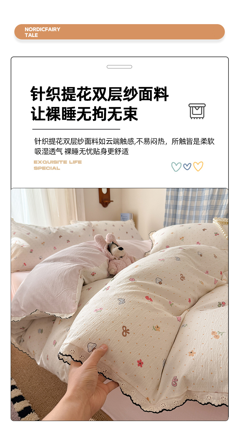 商品名称:温眠家纺 2026新款针织提花双层纱全棉蕾丝花边四件套 夏之物语