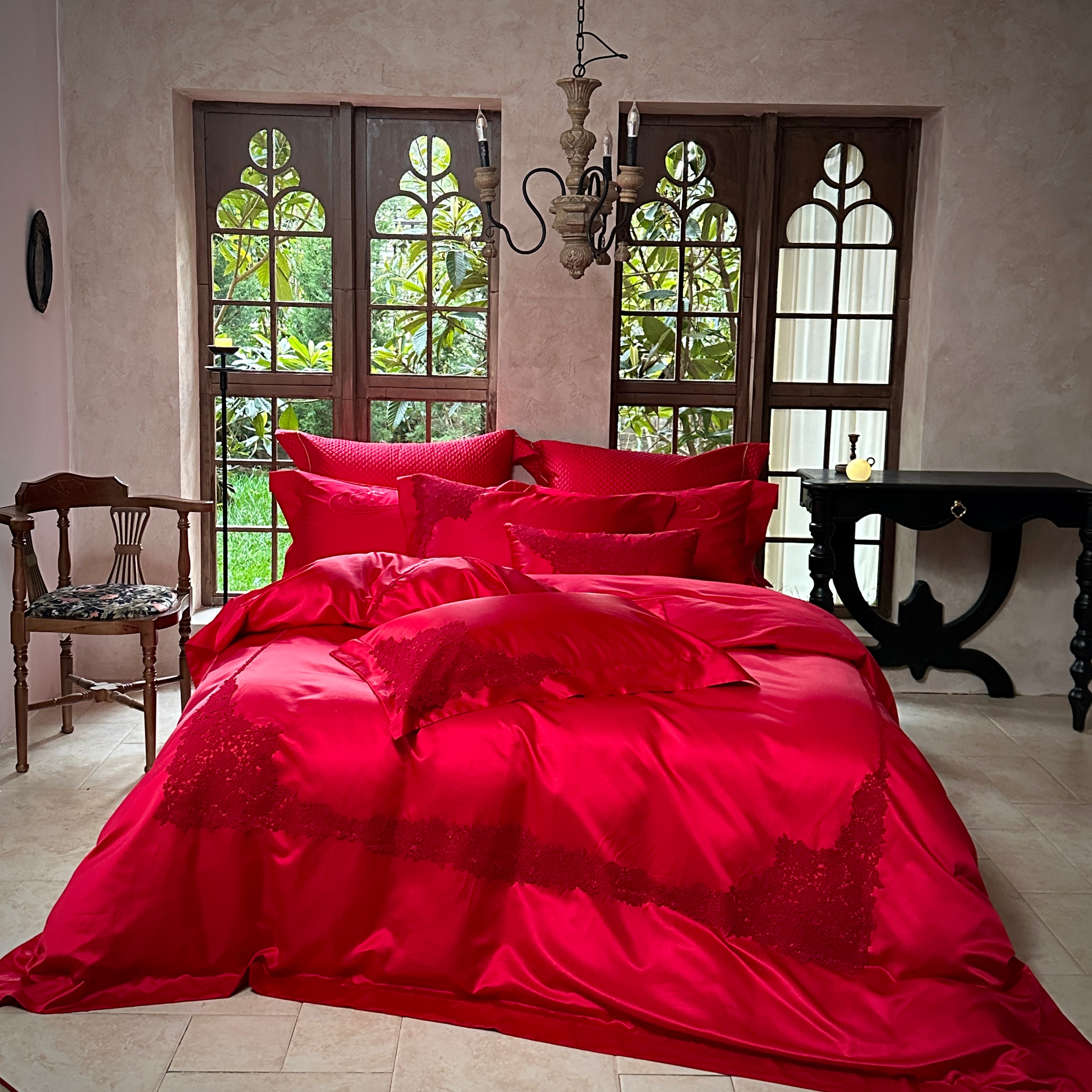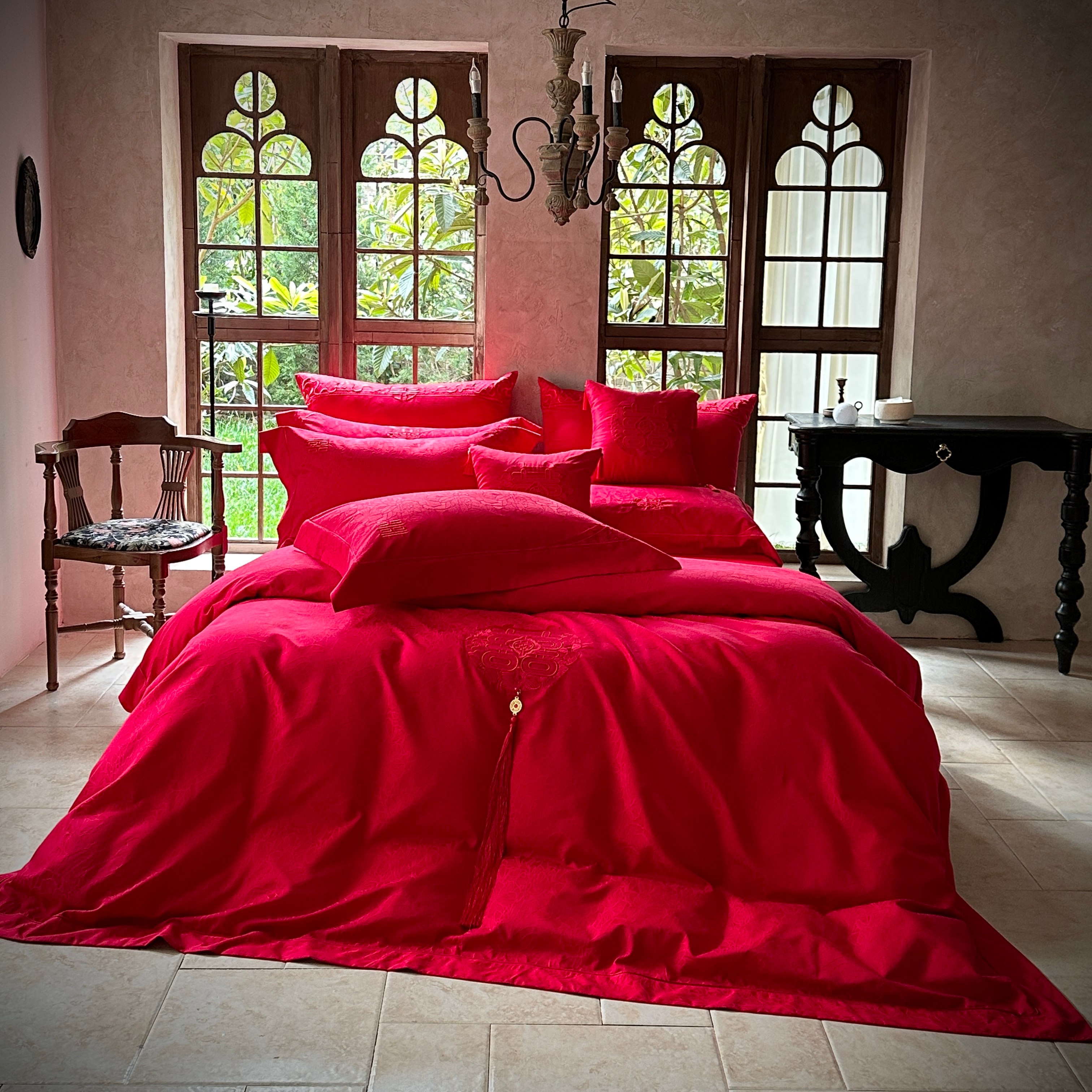 当前位置: 91家纺网 > 商品网购 > 床品套件 > 四件套 > 婚庆四件套 > 佳汐蓝家纺 2026新款高精密缎面蕾丝贴布绣法式浪漫邂逅中式喜庆四件套 情意浓浓