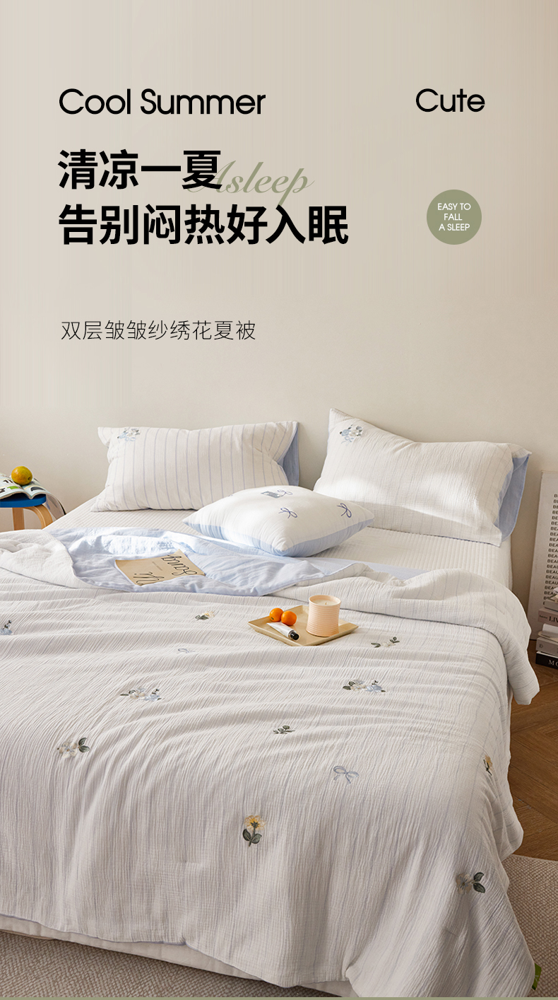 当前位置: 91家纺网 > 商品网购 > 被子 > 夏被 > 沐珩家纺 2026新款40s双层皱皱纱绣花夏被泡芙纱系列 皱皱纱-蓝条小花