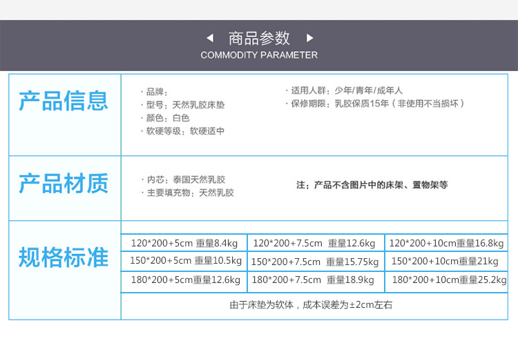[{"sp_id":11,"sp_name":"\u989c\u8272\u5206\u7c7b","sp_format":2,"sp_list":[{"sp_value_id":649,"sp_value_name":"120*200+5","sp_value_image":{"id":999,"path":"http:\/\/www.91jf.com\/template\/default\/images\/nophoto.gif"},"sp_value_video":{"id":0,"img":"","path":"","time":0,"download_num":0,"play_num":0},"price":"445.00","storage":100,"weight":"8.400","is_check_weight":0,"plus_price":"","sp_sort":11810354},{"sp_value_id":58,"sp_value_name":"120*200+7.5","sp_value_image":{"id":999,"path":"http:\/\/www.91jf.com\/template\/default\/images\/nophoto.gif"},"sp_value_video":{"id":0,"img":"","path":"","time":0,"download_num":0,"play_num":0},"price":"605.00","storage":100,"weight":"12.600","is_check_weight":0,"plus_price":"","sp_sort":11810355},{"sp_value_id":651,"sp_value_name":"120*200+10","sp_value_image":{"id":999,"path":"http:\/\/www.91jf.com\/template\/default\/images\/nophoto.gif"},"sp_value_video":{"id":0,"img":"","path":"","time":0,"download_num":0,"play_num":0},"price":"760.00","storage":100,"weight":"16.800","is_check_weight":0,"plus_price":"","sp_sort":11810356},{"sp_value_id":51,"sp_value_name":"150*200+5","sp_value_image":{"id":999,"path":"http:\/\/www.91jf.com\/template\/default\/images\/nophoto.gif"},"sp_value_video":{"id":0,"img":"","path":"","time":0,"download_num":0,"play_num":0},"price":"525.00","storage":100,"weight":"10.500","is_check_weight":0,"plus_price":"","sp_sort":11810357},{"sp_value_id":55,"sp_value_name":"150*200+7.5","sp_value_image":{"id":999,"path":"http:\/\/www.91jf.com\/template\/default\/images\/nophoto.gif"},"sp_value_video":{"id":0,"img":"","path":"","time":0,"download_num":0,"play_num":0},"price":"720.00","storage":100,"weight":"15.750","is_check_weight":0,"plus_price":"","sp_sort":11810358},{"sp_value_id":653,"sp_value_name":"150*200+10","sp_value_image":{"id":999,"path":"http:\/\/www.91jf.com\/template\/default\/images\/nophoto.gif"},"sp_value_video":{"id":0,"img":"","path":"","time":0,"download_num":0,"play_num":0},"price":"910.00","storage":100,"weight":"21.000","is_check_weight":0,"plus_price":"","sp_sort":11810359},{"sp_value_id":655,"sp_value_name":"180*200+5","sp_value_image":{"id":999,"path":"http:\/\/www.91jf.com\/template\/default\/images\/nophoto.gif"},"sp_value_video":{"id":0,"img":"","path":"","time":0,"download_num":0,"play_num":0},"price":"605.00","storage":100,"weight":"12.600","is_check_weight":0,"plus_price":"","sp_sort":11810360},{"sp_value_id":70,"sp_value_name":"180*200+7.5","sp_value_image":{"id":999,"path":"http:\/\/www.91jf.com\/template\/default\/images\/nophoto.gif"},"sp_value_video":{"id":0,"img":"","path":"","time":0,"download_num":0,"play_num":0},"price":"835.00","storage":99,"weight":"23.100","is_check_weight":0,"plus_price":"","sp_sort":11810361},{"sp_value_id":640,"sp_value_name":"180*200+10","sp_value_image":{"id":999,"path":"http:\/\/www.91jf.com\/template\/default\/images\/nophoto.gif"},"sp_value_video":{"id":0,"img":"","path":"","time":0,"download_num":0,"play_num":0},"price":"1065.00","storage":100,"weight":"25.200","is_check_weight":0,"plus_price":"","sp_sort":11810362}]},{"sp_id":25,"sp_name":"\u9002\u7528\u5e8a\u5c3a\u5bf8","sp_format":1,"sp_list":[{"sp_value_id":236,"sp_value_name":"\u5176\u5b83","sp_value_image":{"id":0,"path":""},"sp_value_video":{"id":0,"img":"","path":"","time":0,"download_num":0,"play_num":0},"price":"445.00","storage":100,"weight":"8.400","is_check_weight":0,"plus_price":"","sp_sort":11810354}]}]