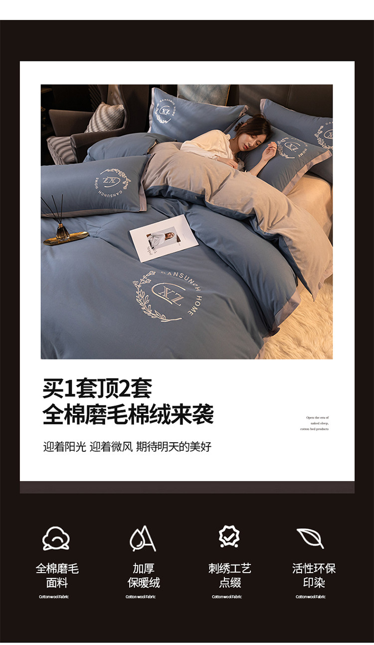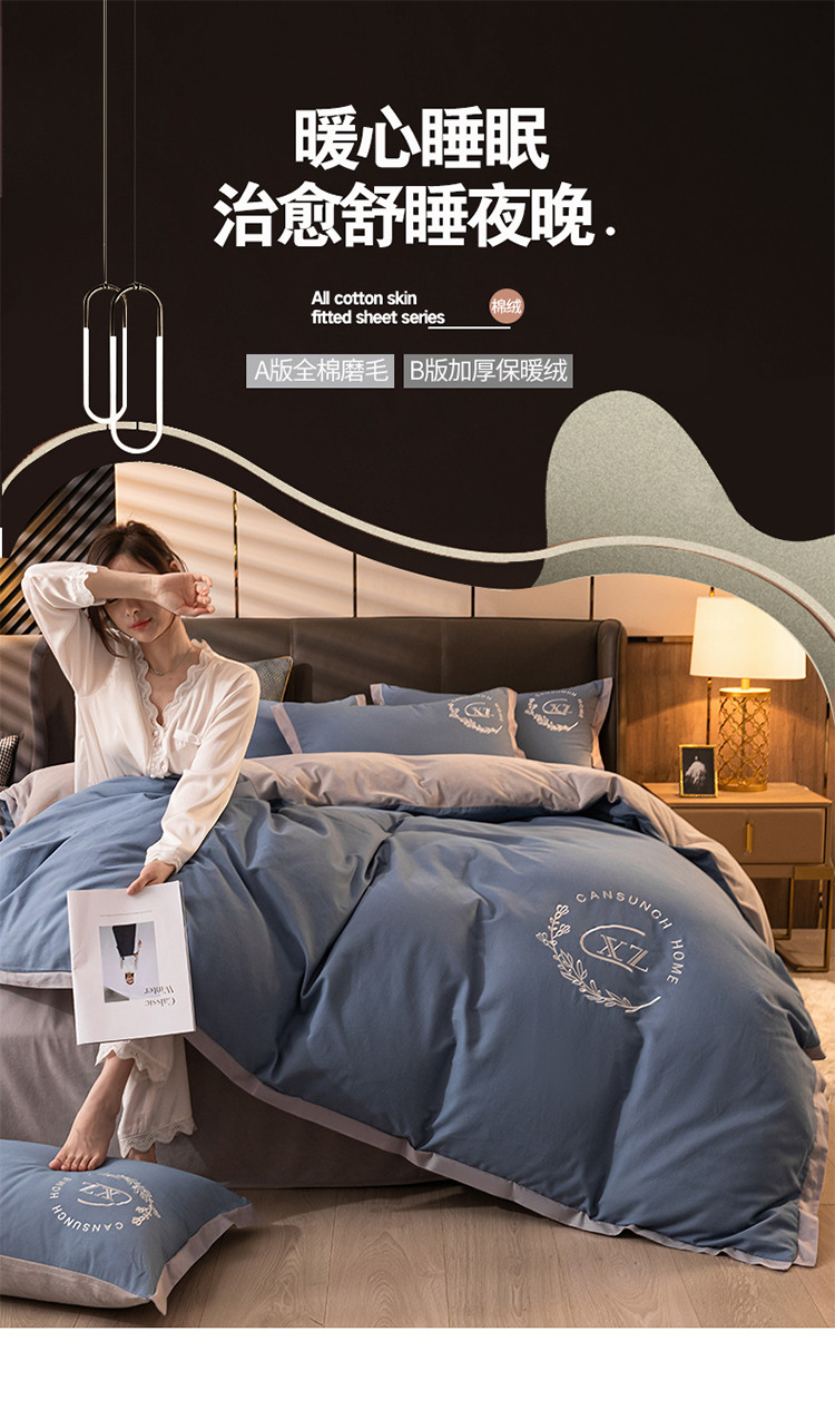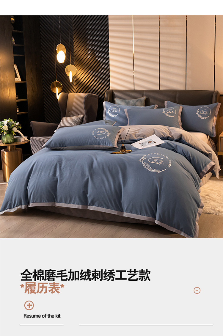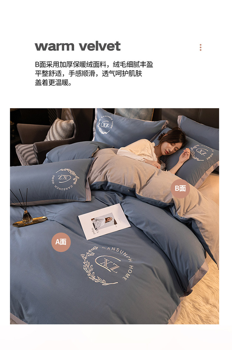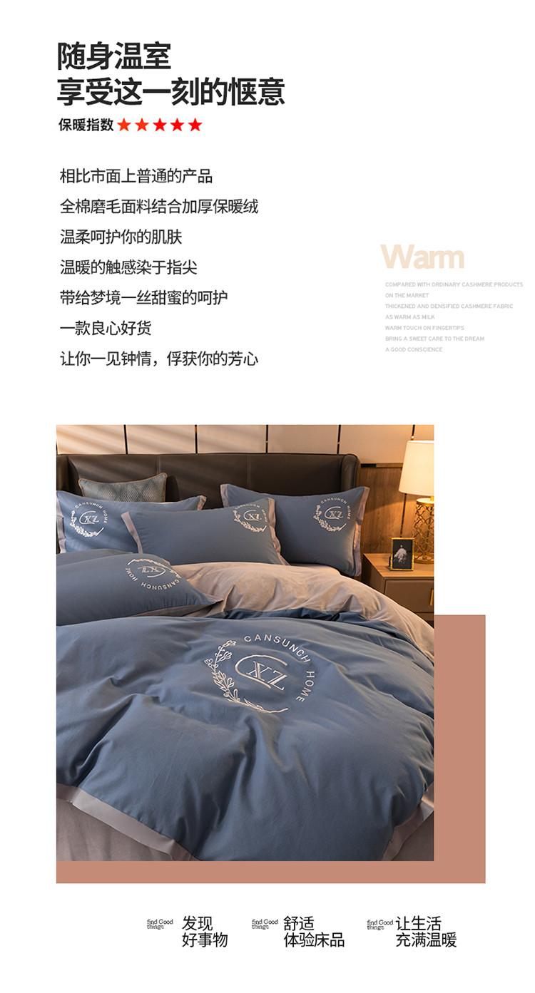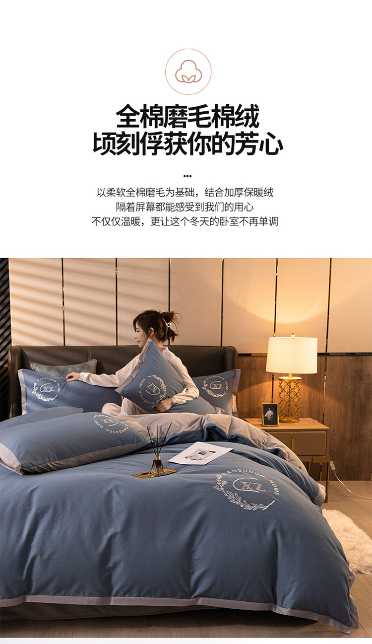 商品名称:蓝米卡夫 2024冬季升级款保暖全棉磨毛牛奶绒刺绣四件套 风暴蓝