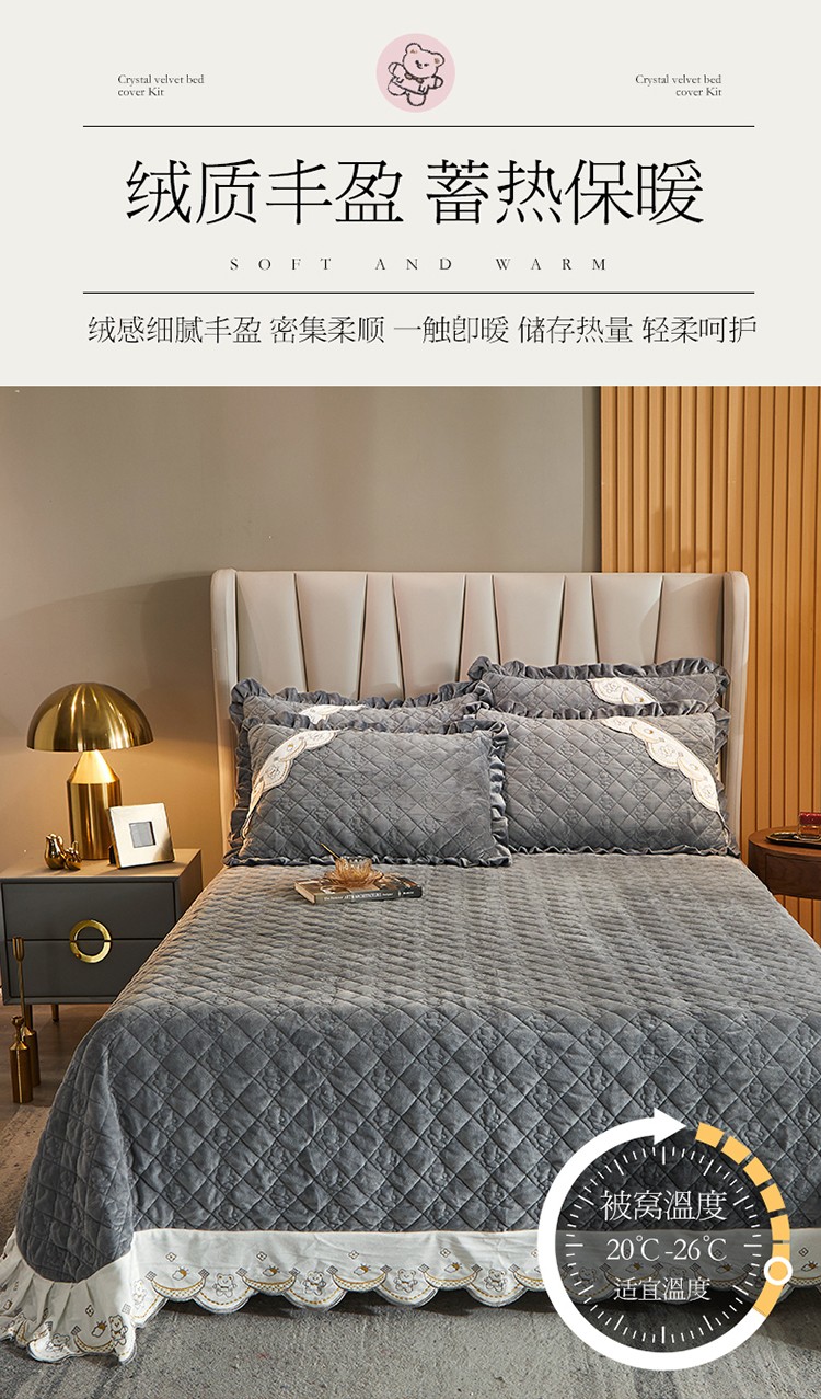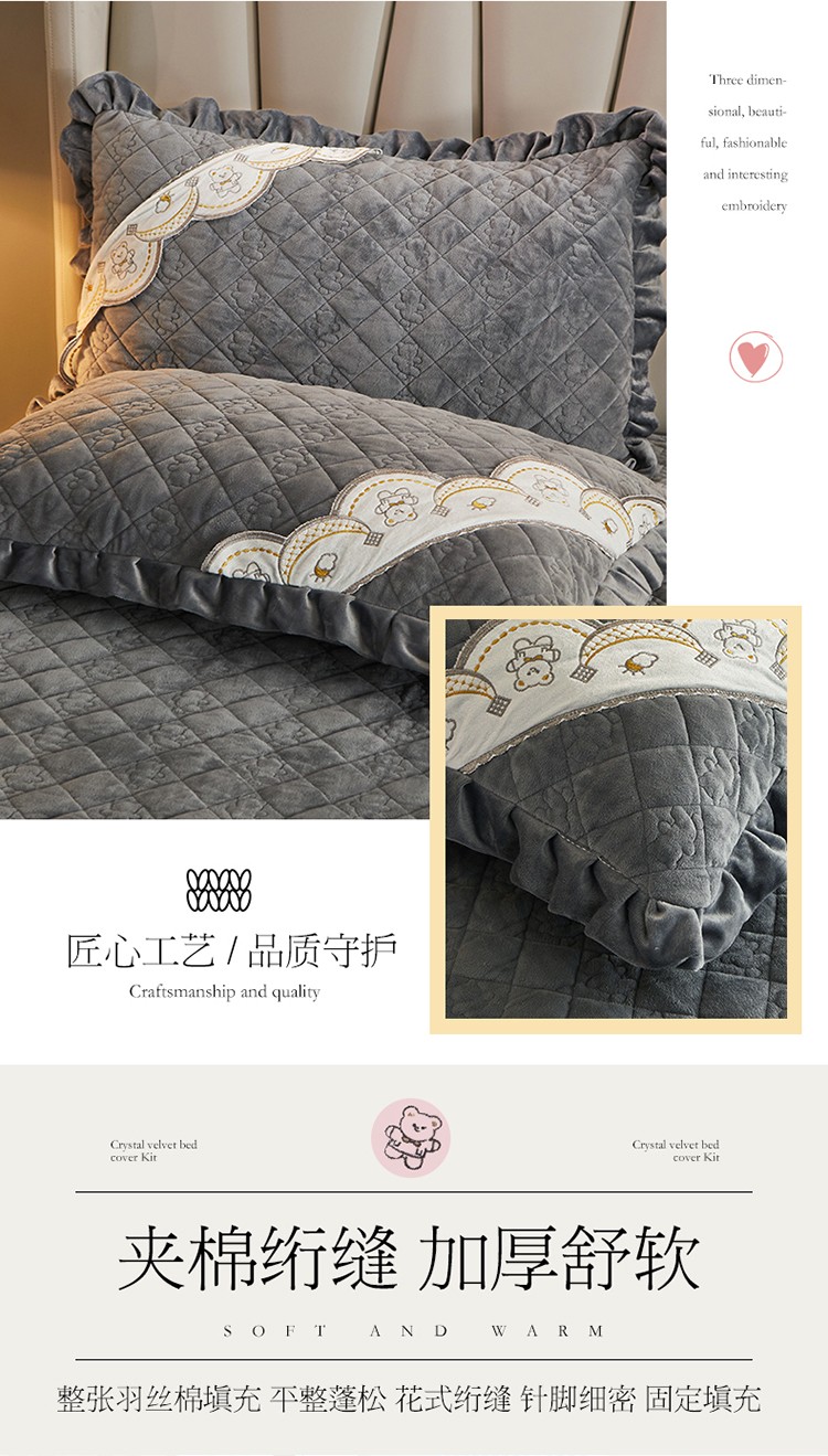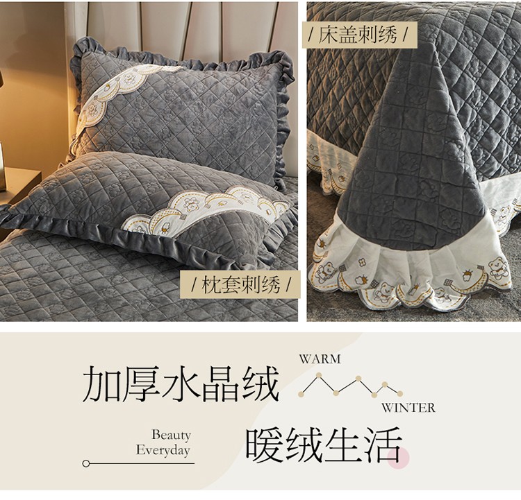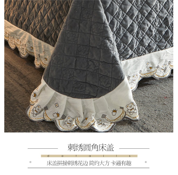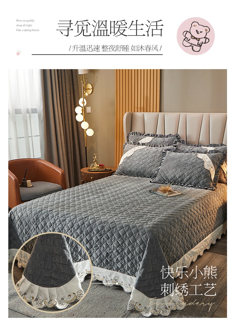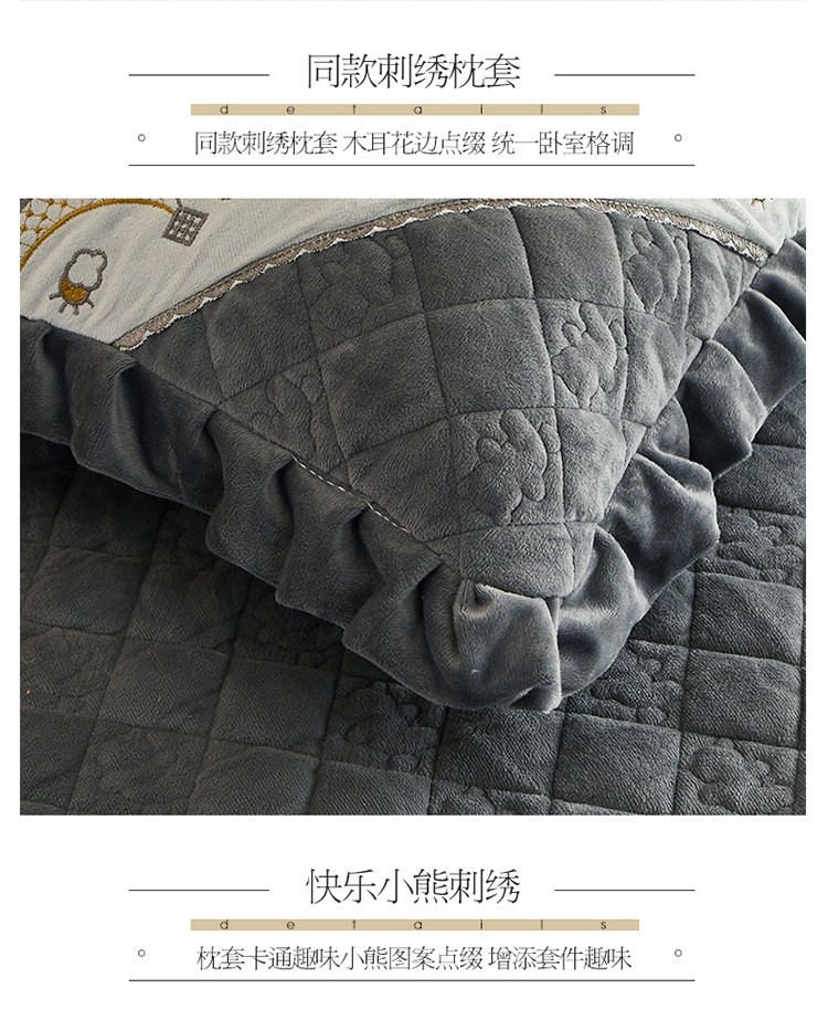 商品名称:宜凡家纺 2021新款水晶绒夹棉绗缝床盖三件套快乐小熊-海灰