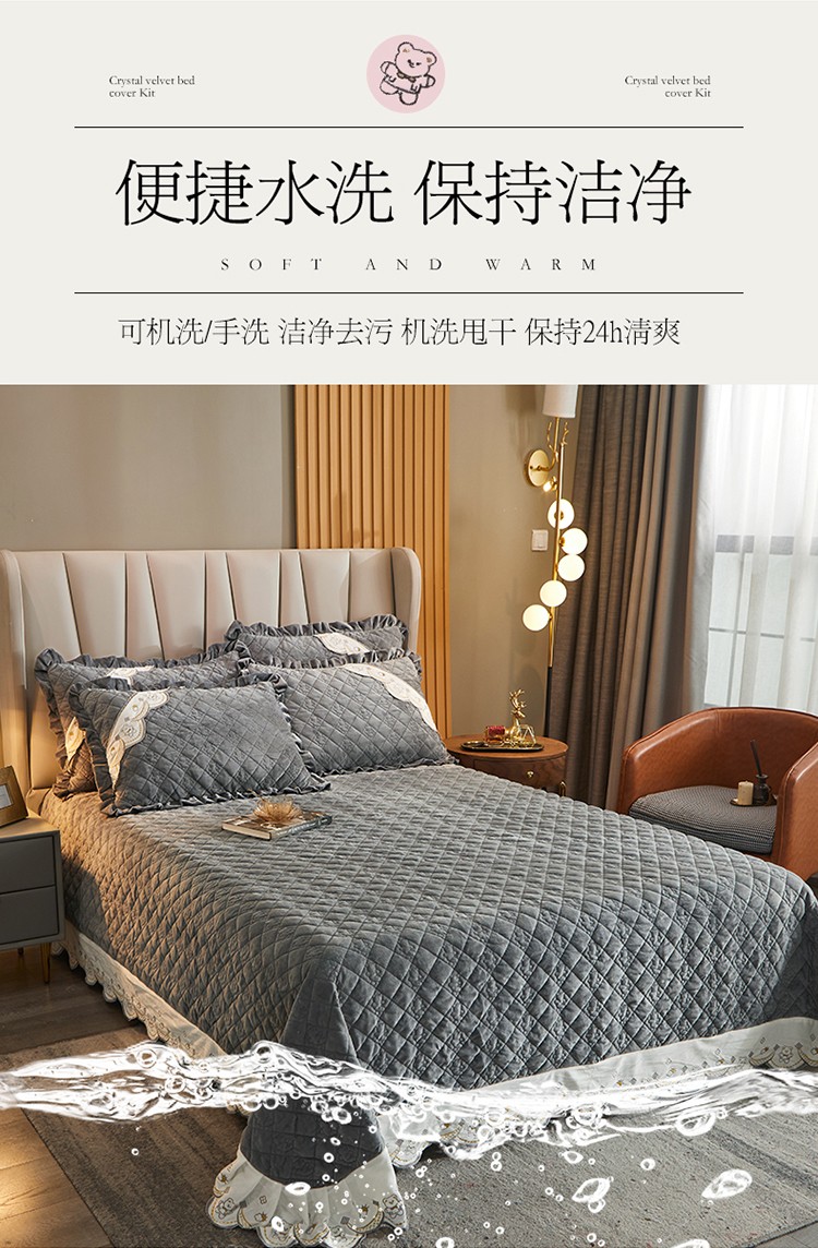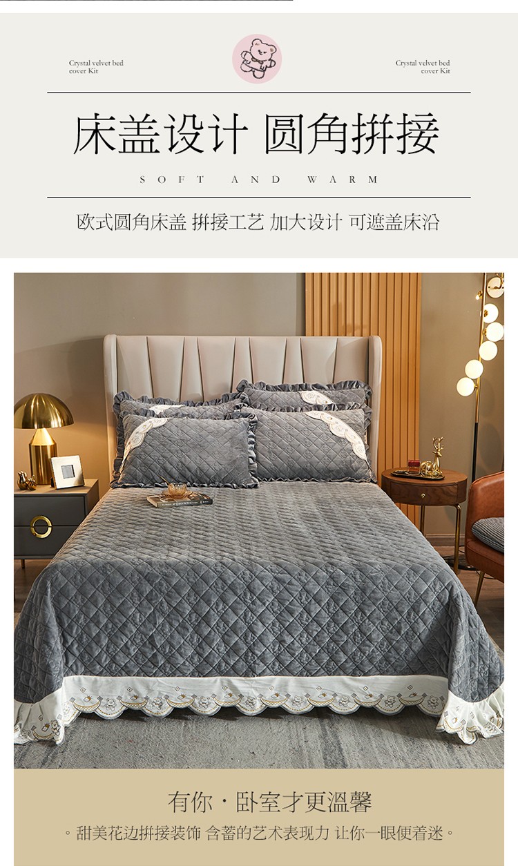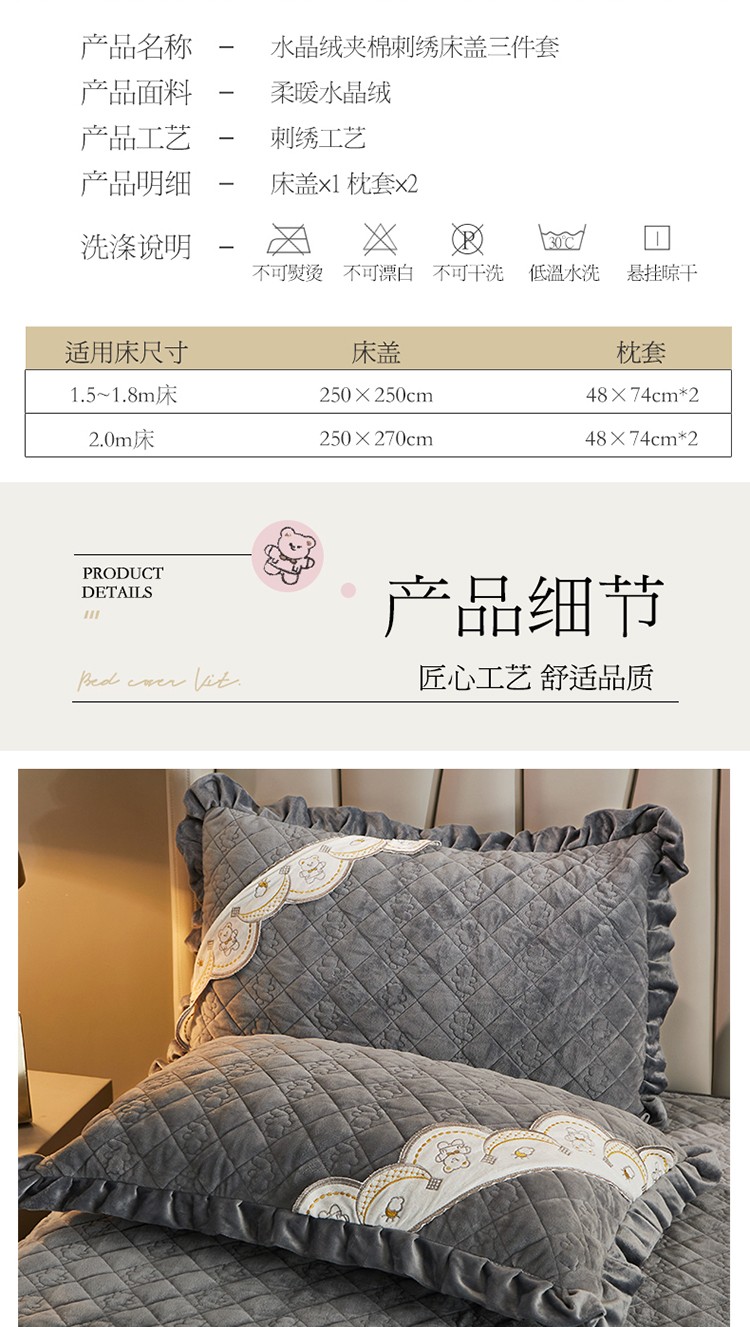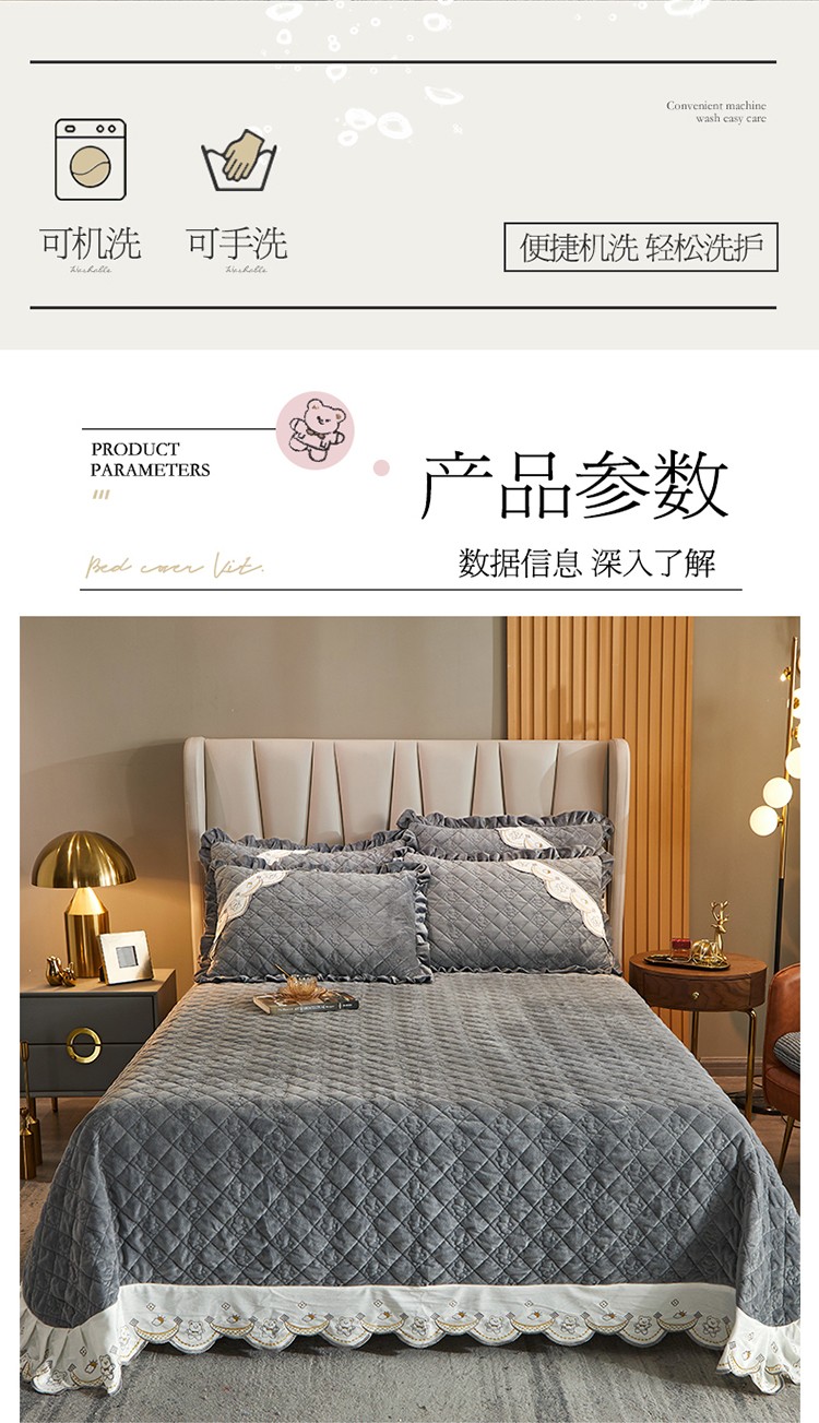 商品名称:宜凡家纺 2021新款水晶绒夹棉绗缝床盖三件套快乐小熊-海灰