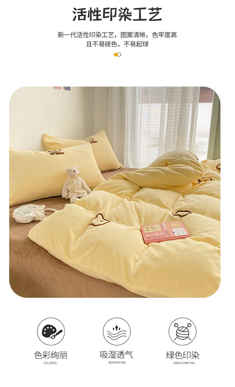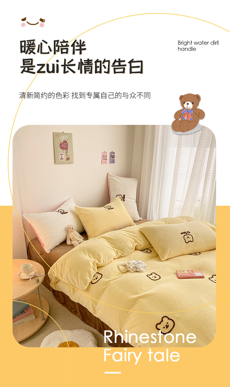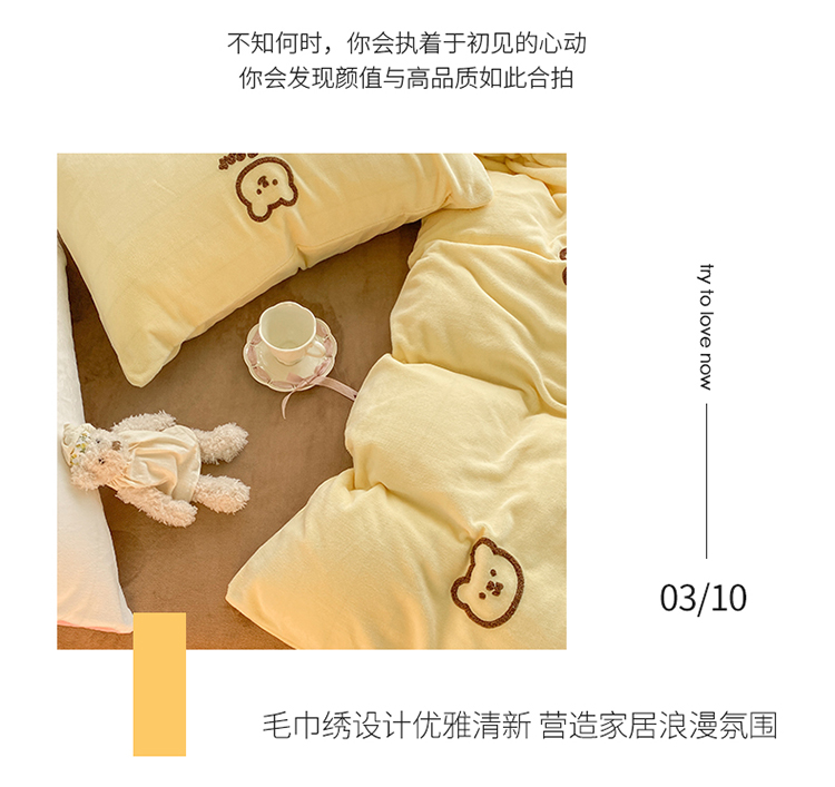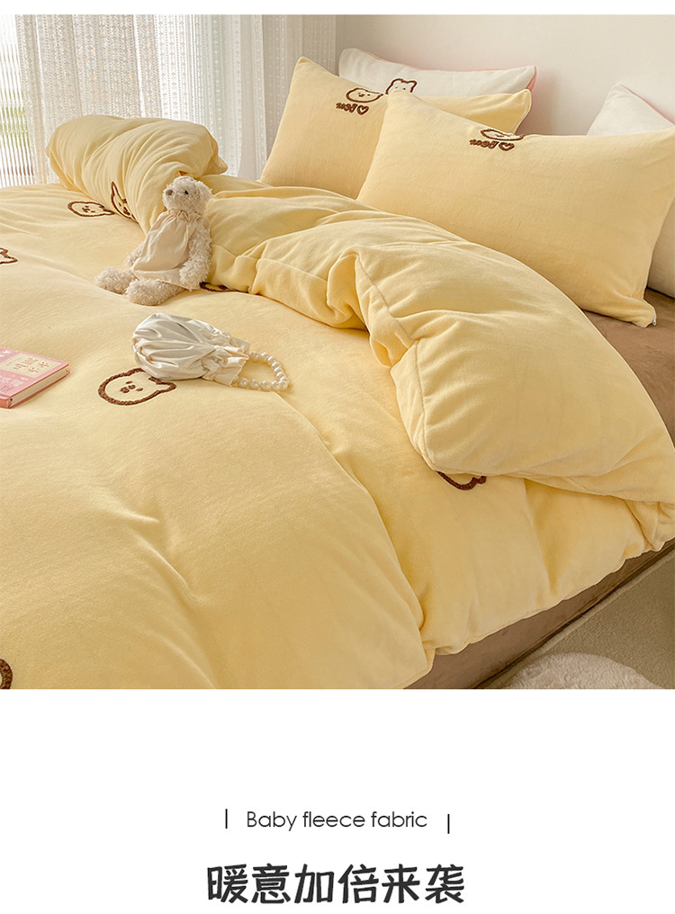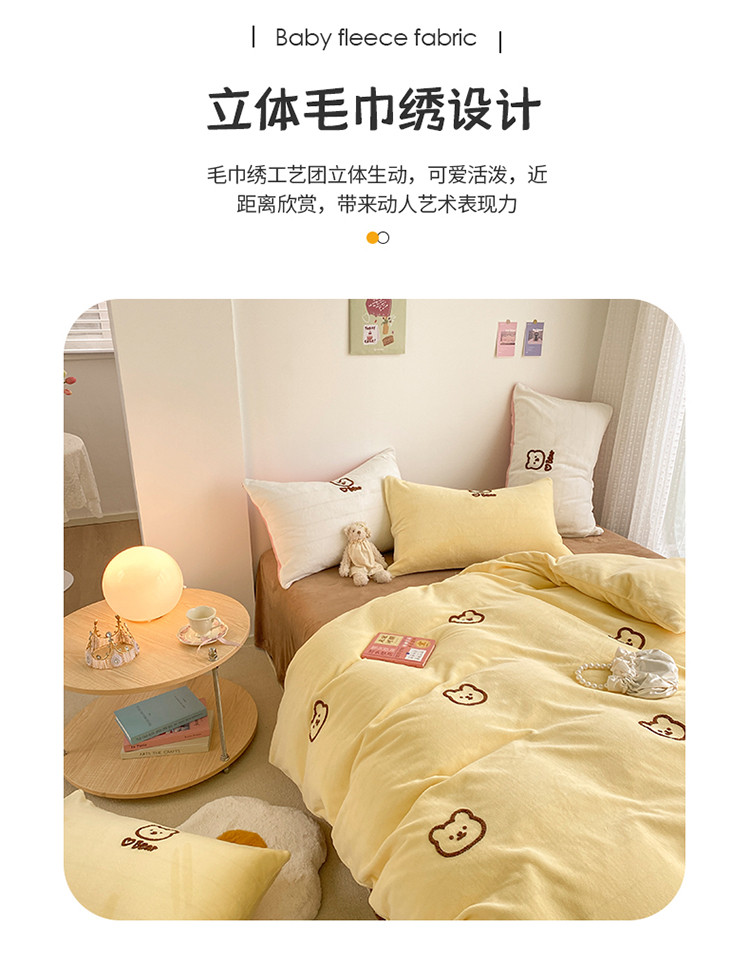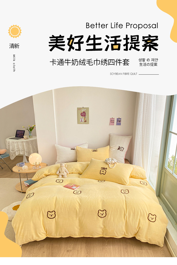 商品名称:雅居纺 2022新款牛奶绒毛巾绣四件套拍摄风格2 可爱熊-黄咖