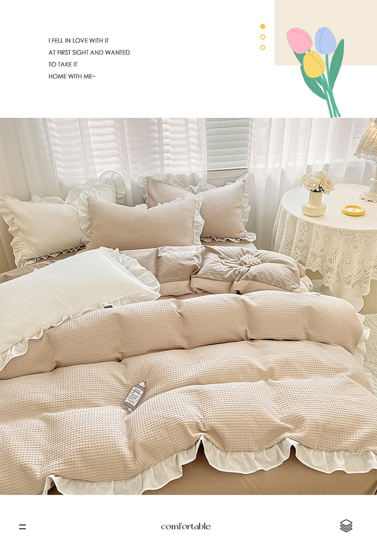 雅居纺家纺 2022新款华夫格花边款四件套 米咖