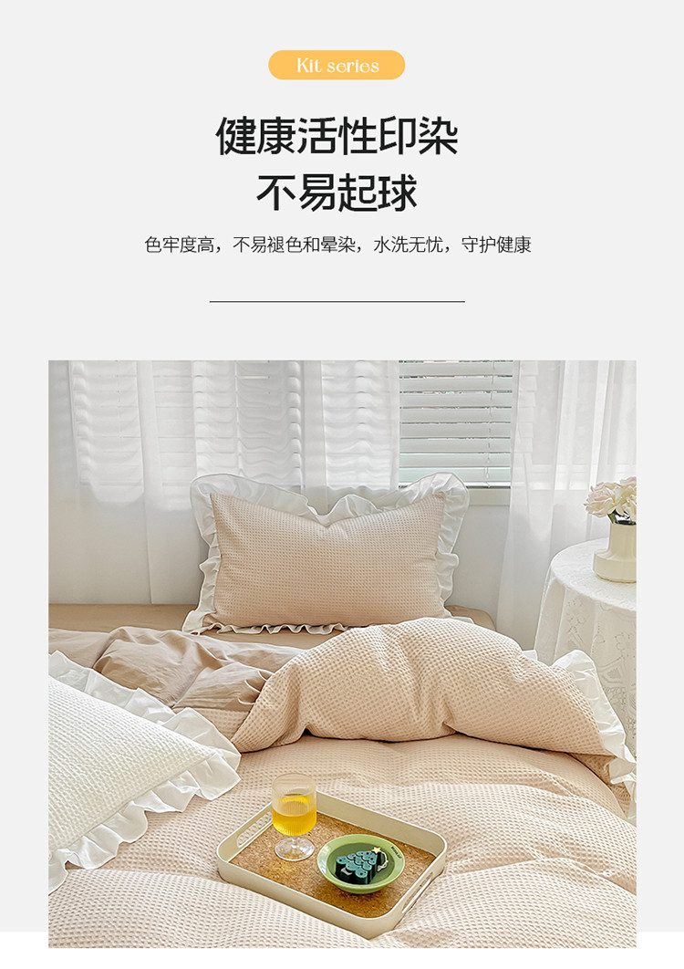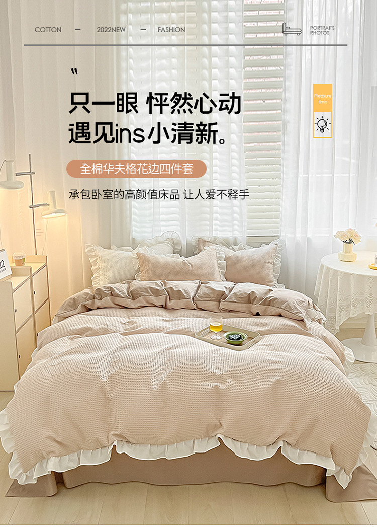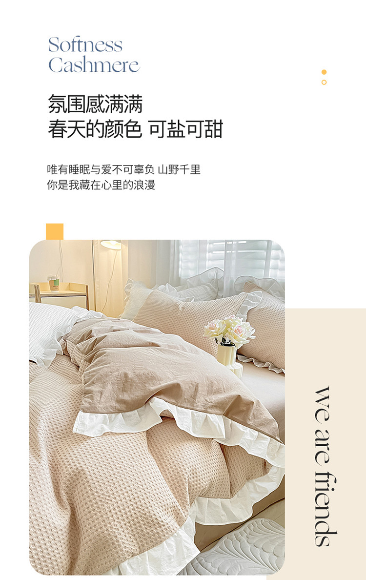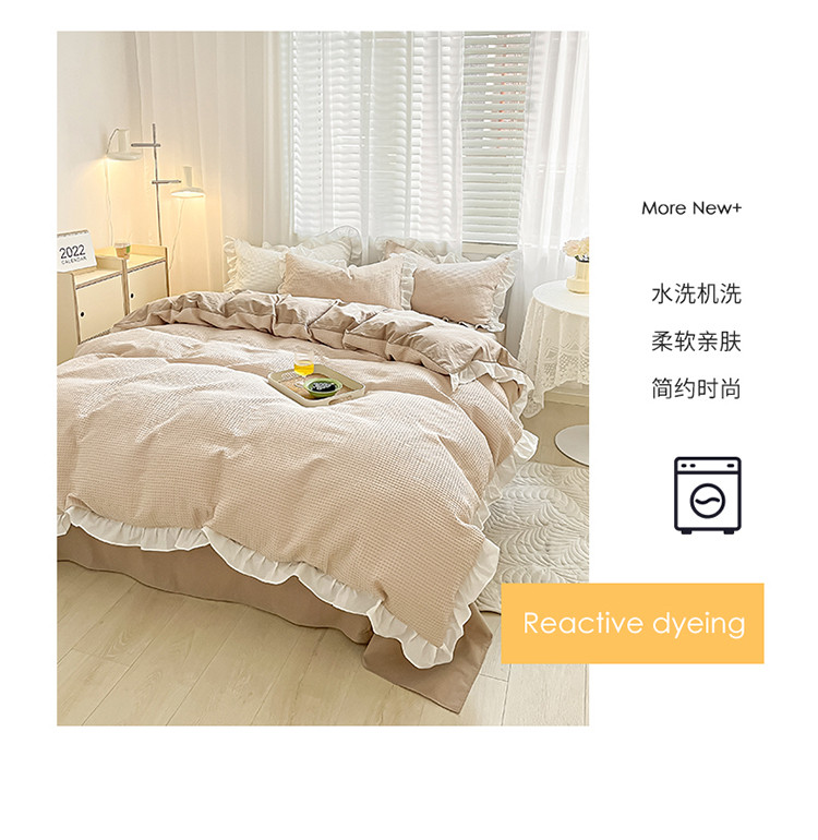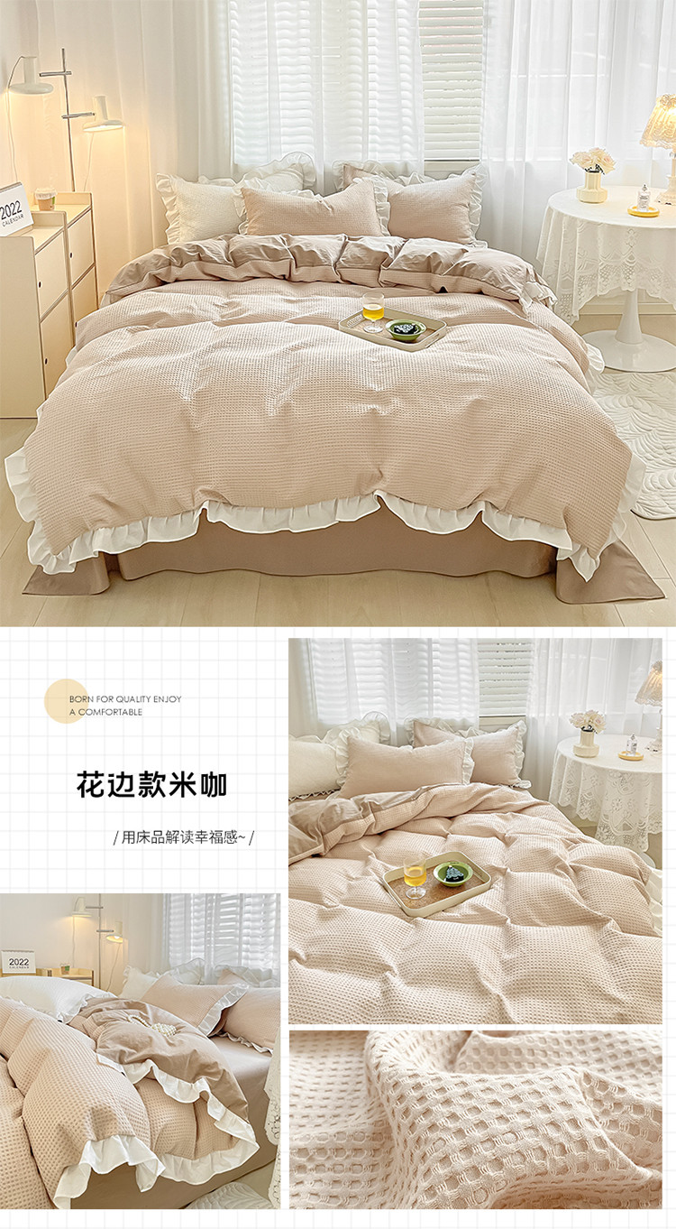 商品名称:雅居纺家纺 2022新款华夫格花边款四件套 米咖