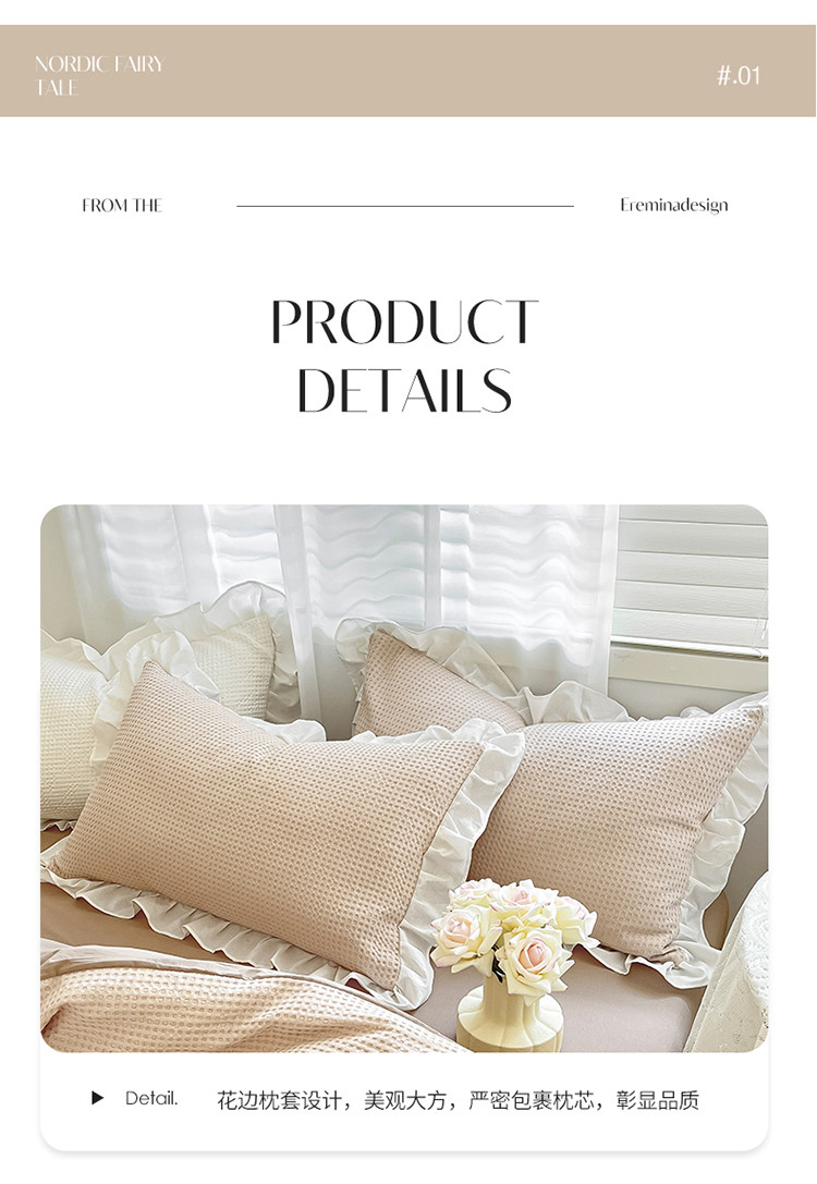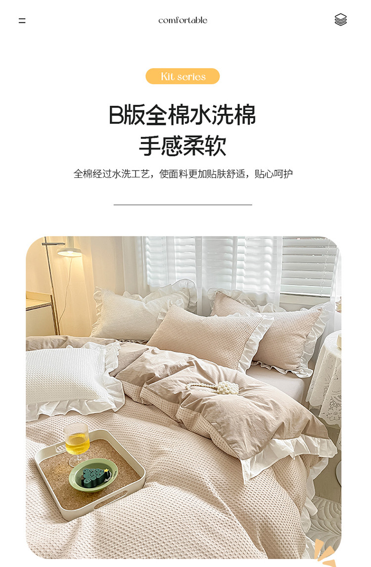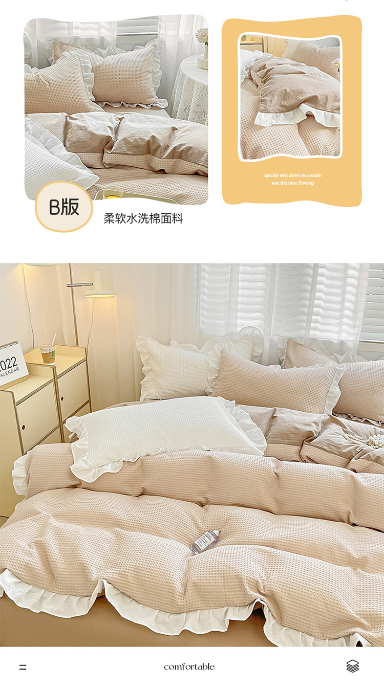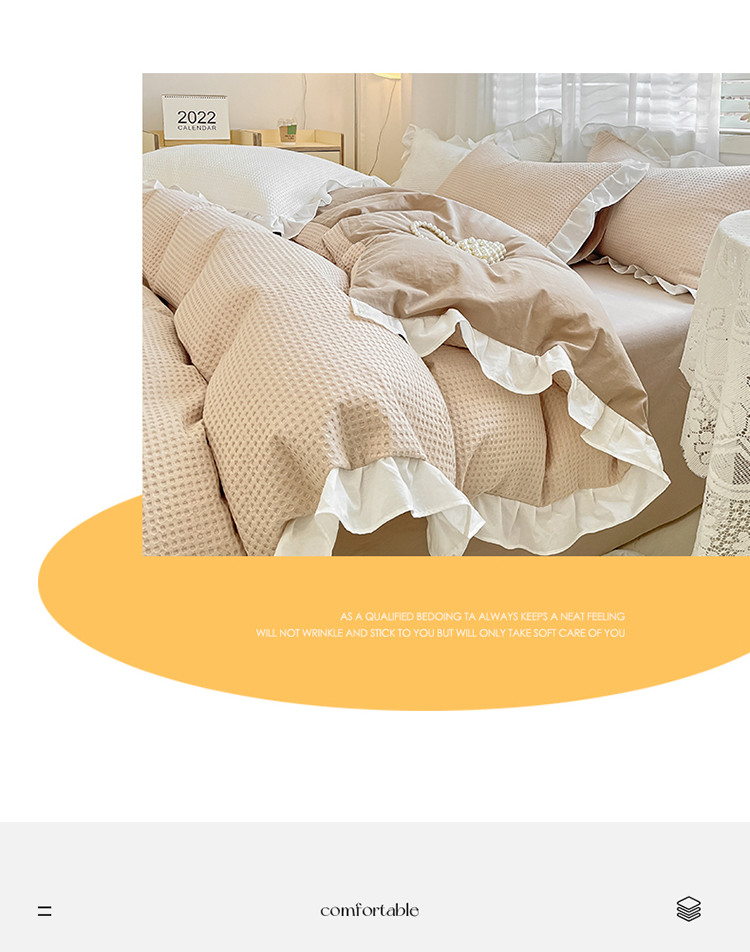 商品名称:雅居纺家纺 2022新款华夫格花边款四件套 米咖