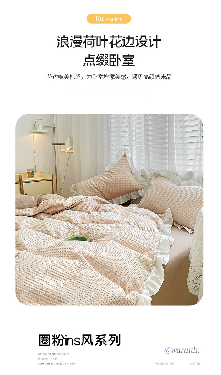 (总)雅居纺家纺 2022新款华夫格花边款四件套,梦幻蓝,橙色,纯白,米咖,浅粉,浅灰,优雅灰