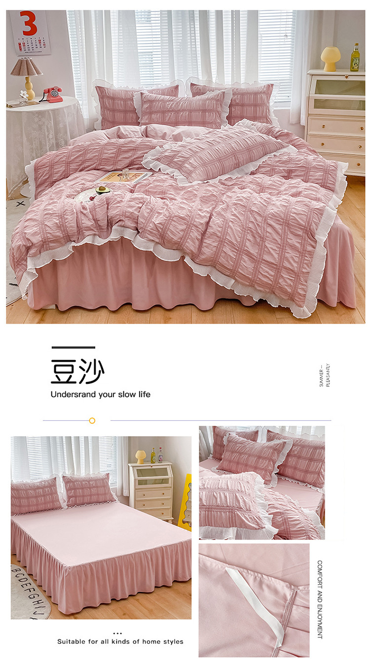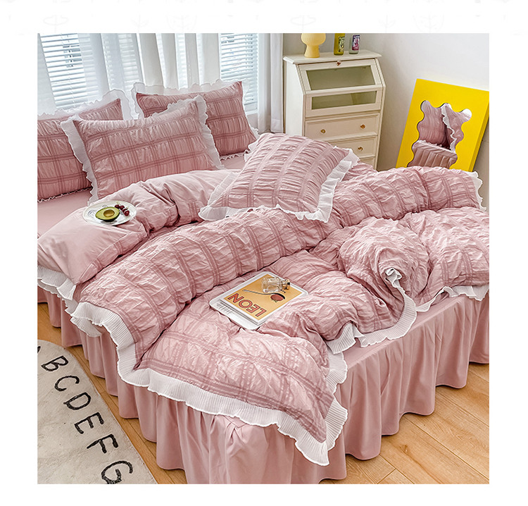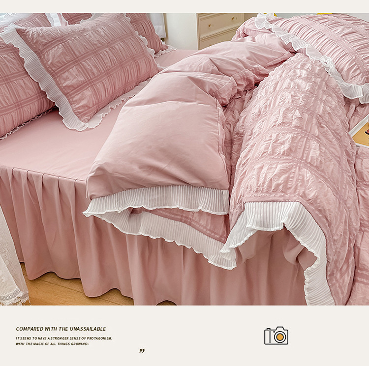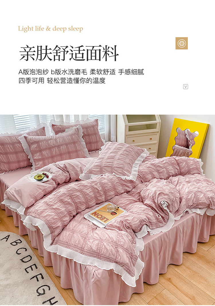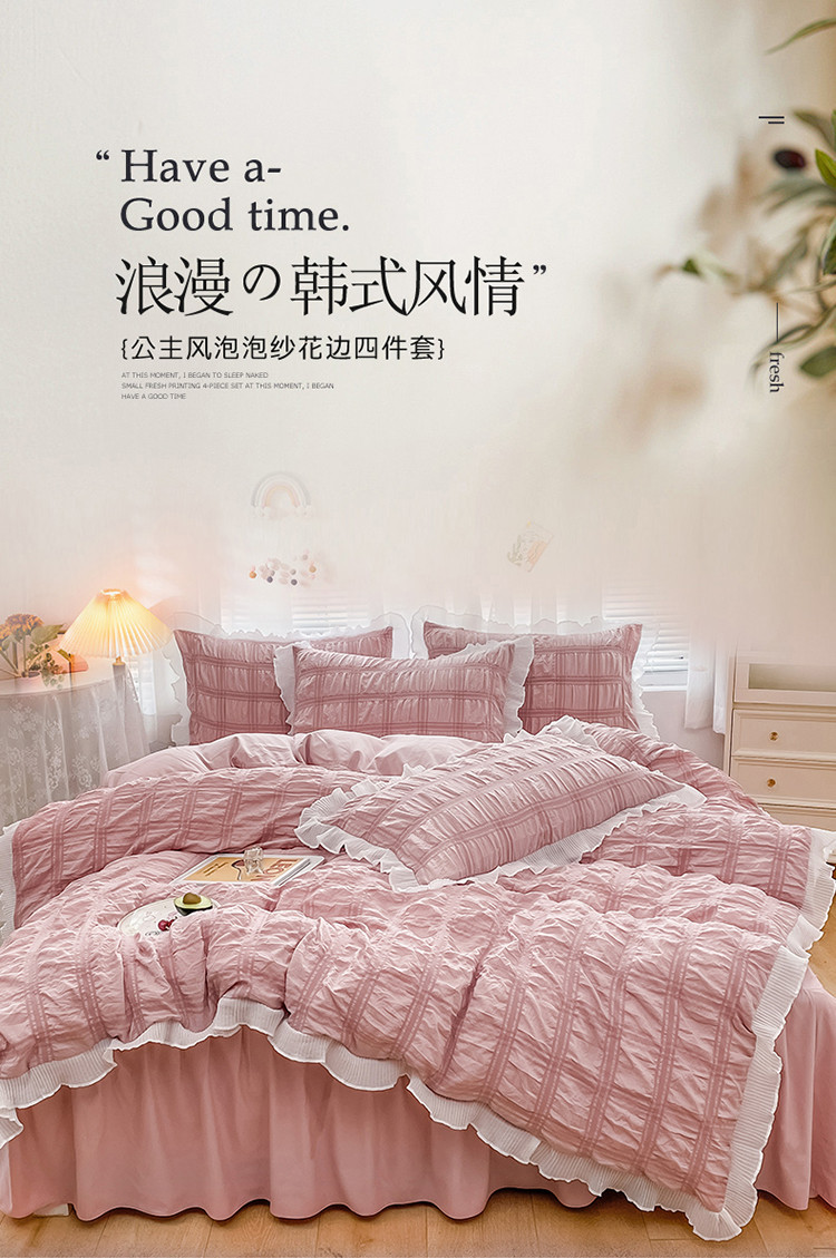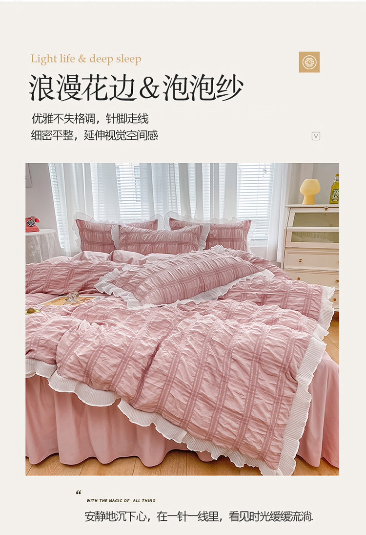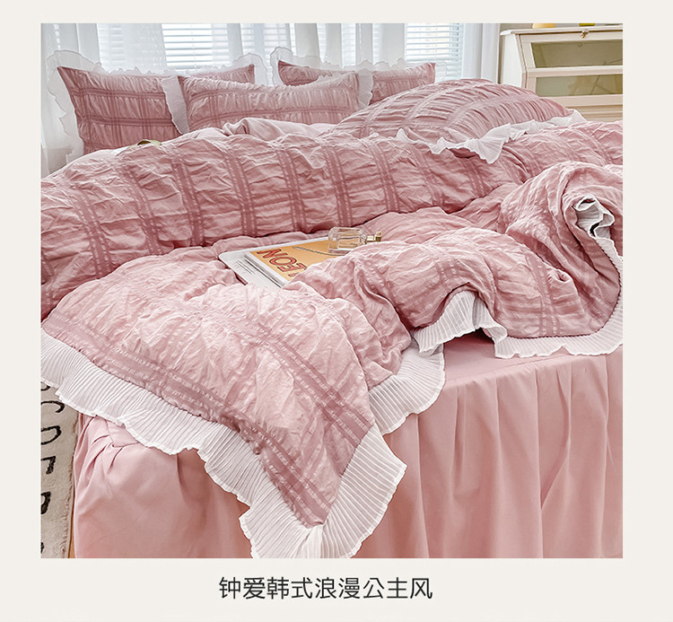 金米诺 新款韩版花边水洗棉泡泡纱四件套公主条四件套 褶皱-浅粉,褶皱-浅粉