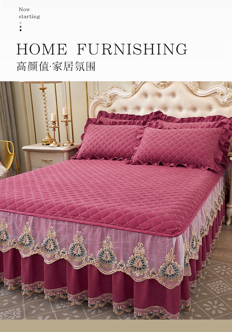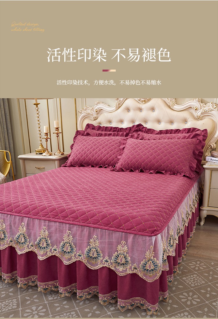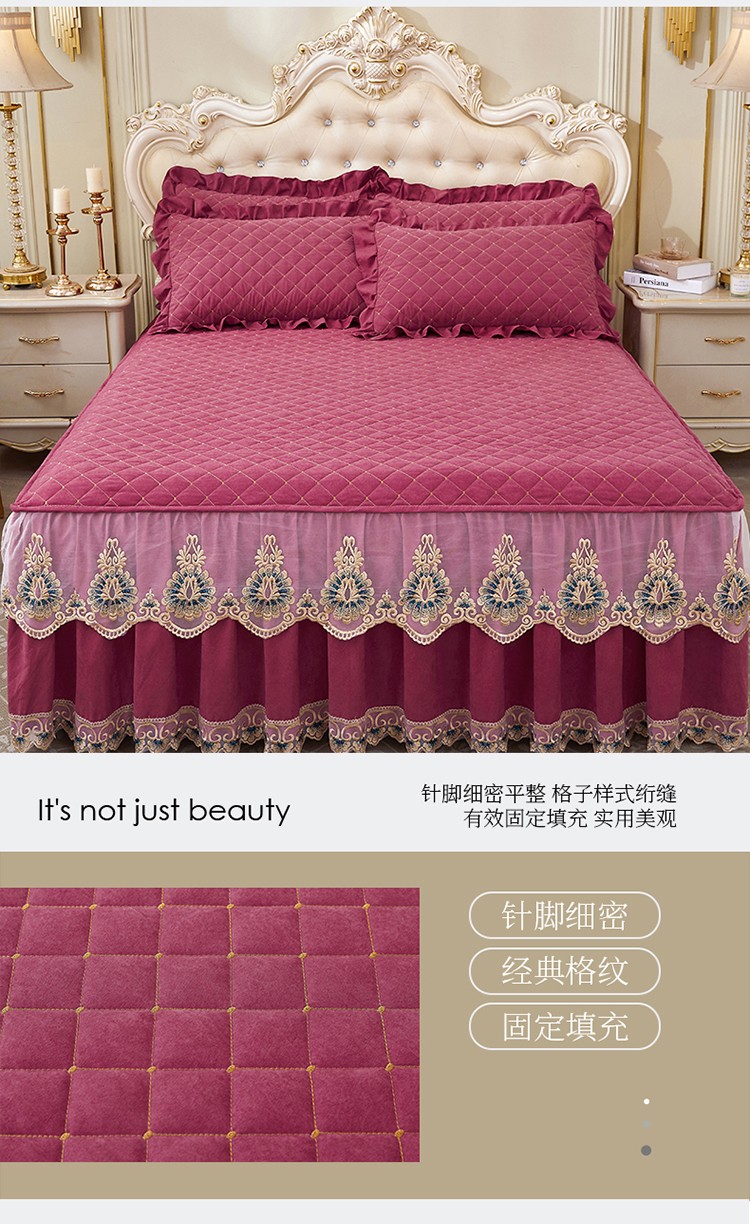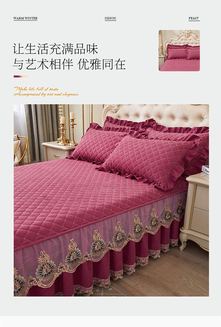 (总)屹成家纺2025新款水晶绒夹棉绗缝蕾丝床裙三件套(塞纳河畔)床裙单件起售价不低于105元,大红,豆沙,翡翠绿,粉玉,橄榄绿,蔚蓝,银灰