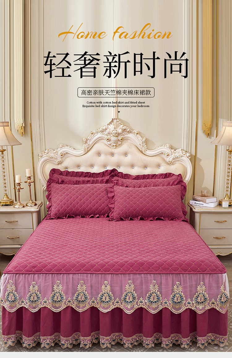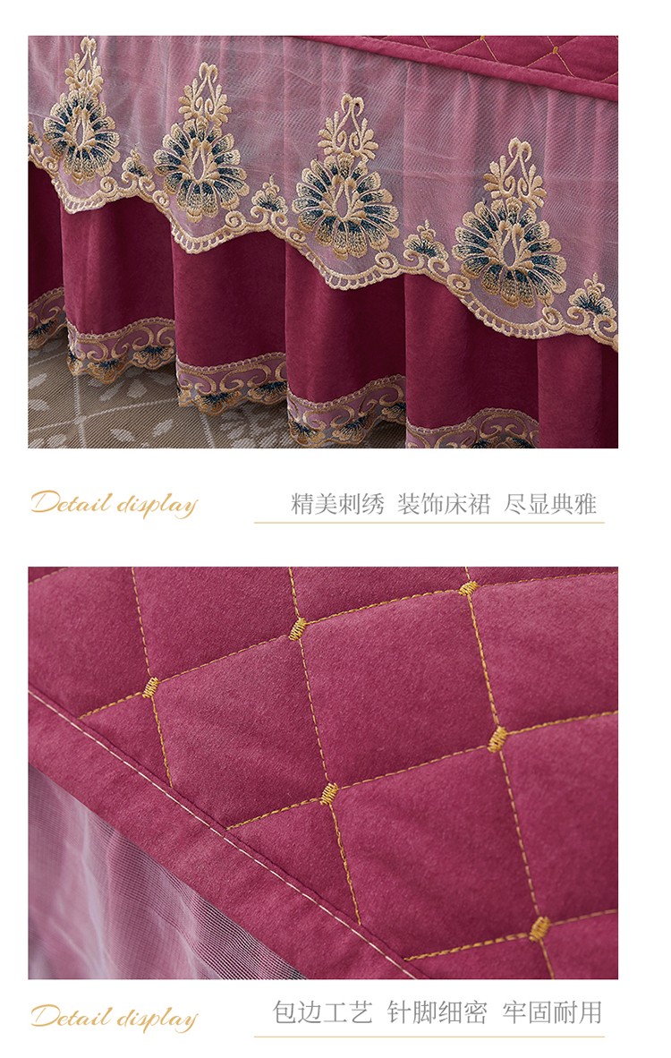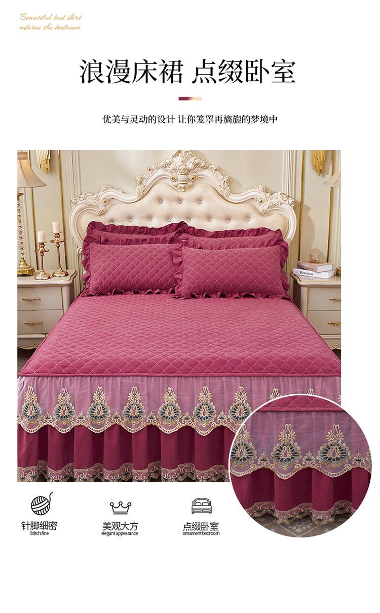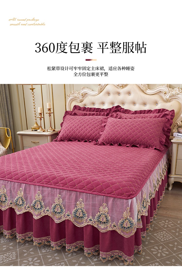 (总)屹成家纺2025新款水晶绒夹棉绗缝蕾丝床裙三件套(塞纳河畔)床裙单件起售价不低于105元,大红,豆沙,翡翠绿,粉玉,橄榄绿,蔚蓝,银灰