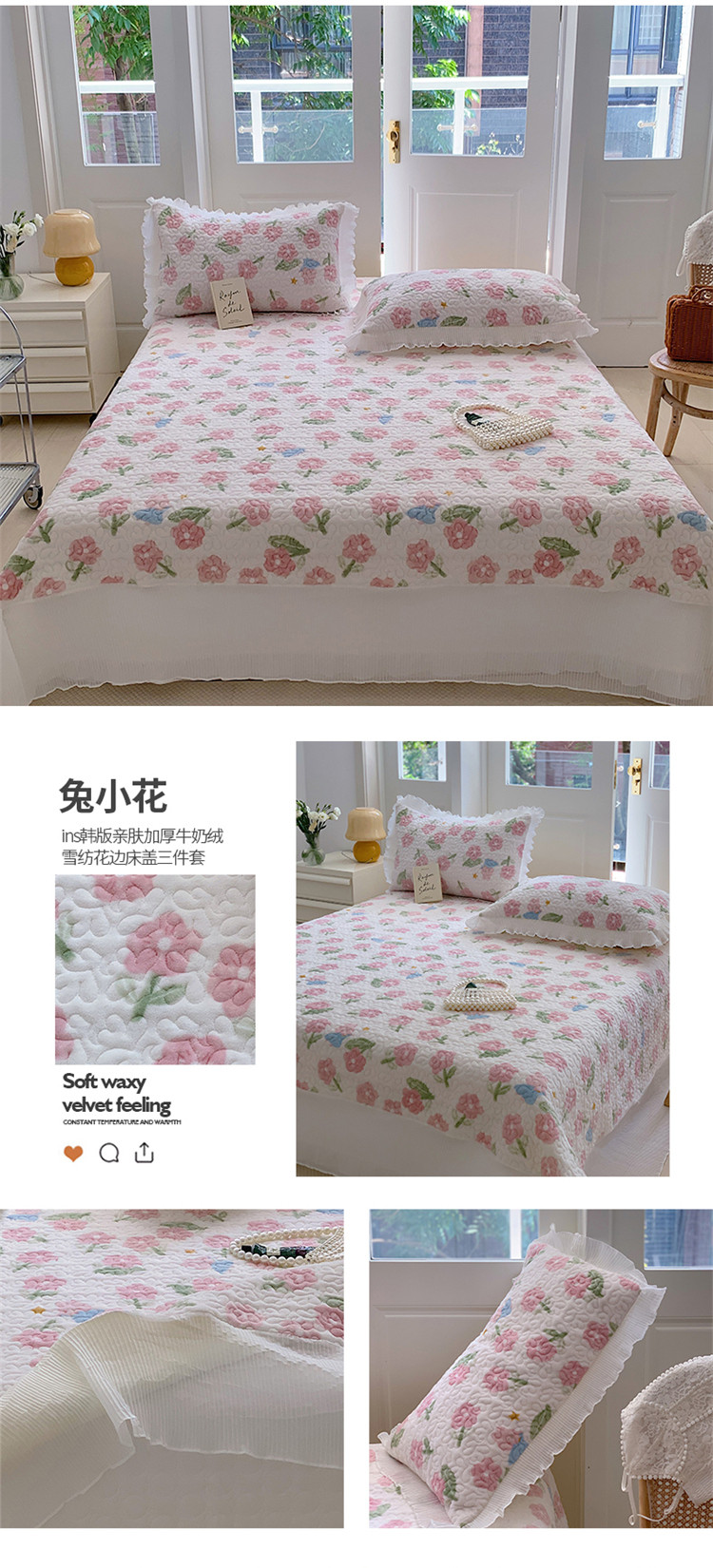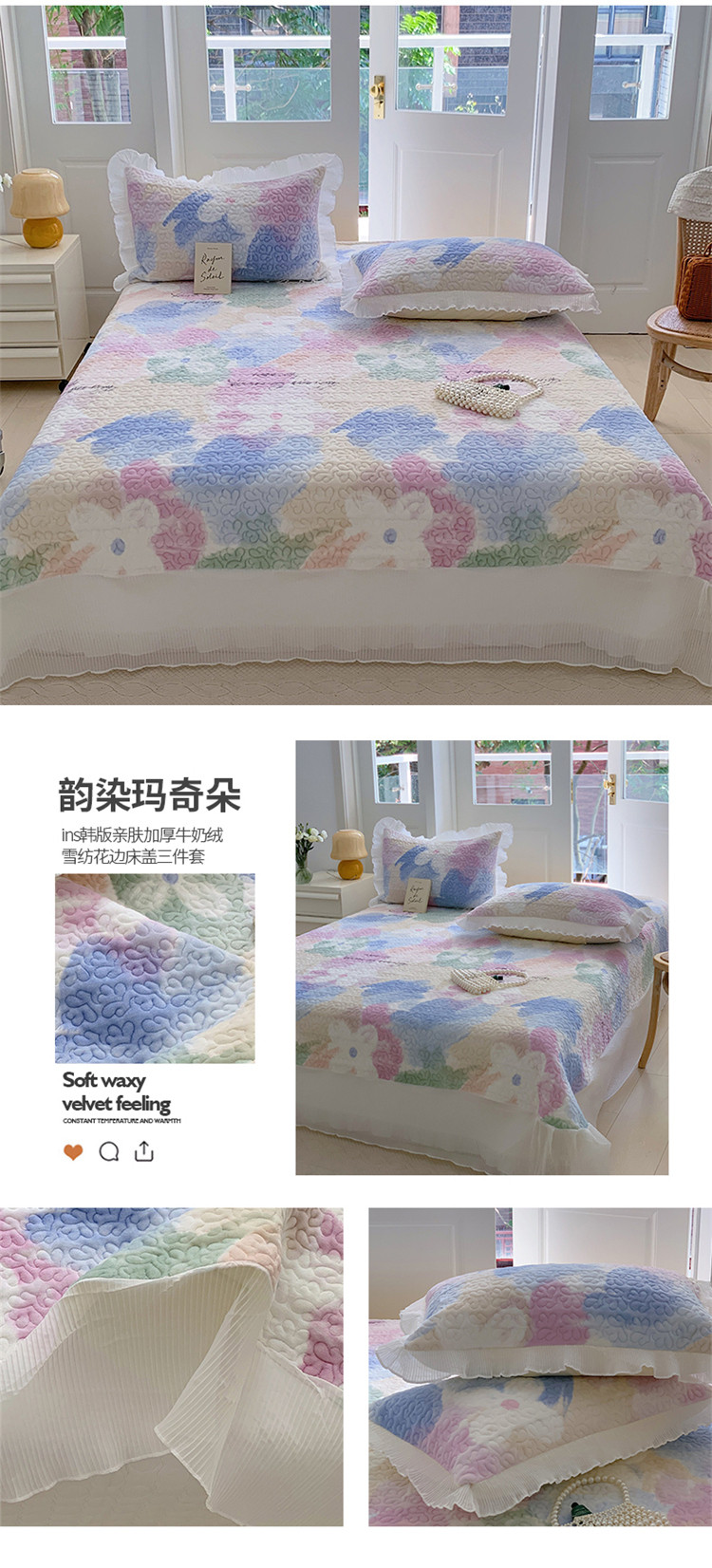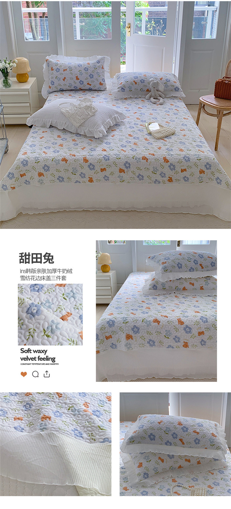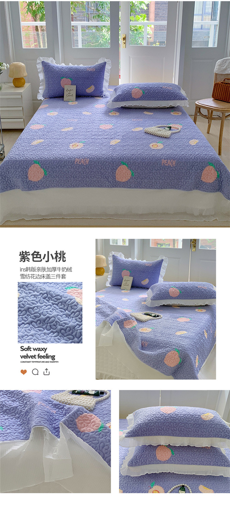 商品名称:(总)桃子新款ins韩版亲肤加厚牛奶绒雪纺花边床盖三件套