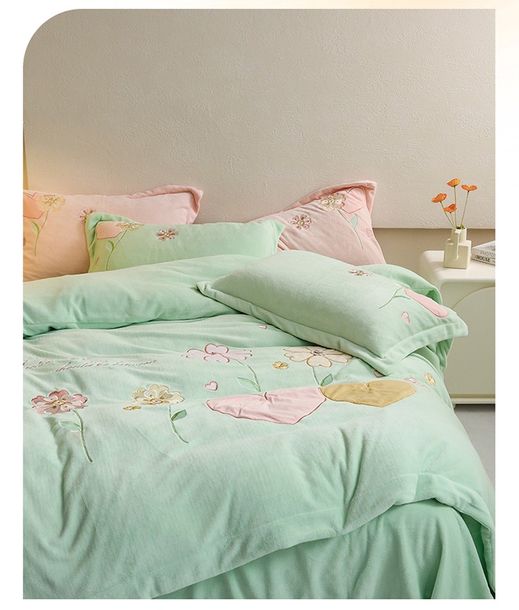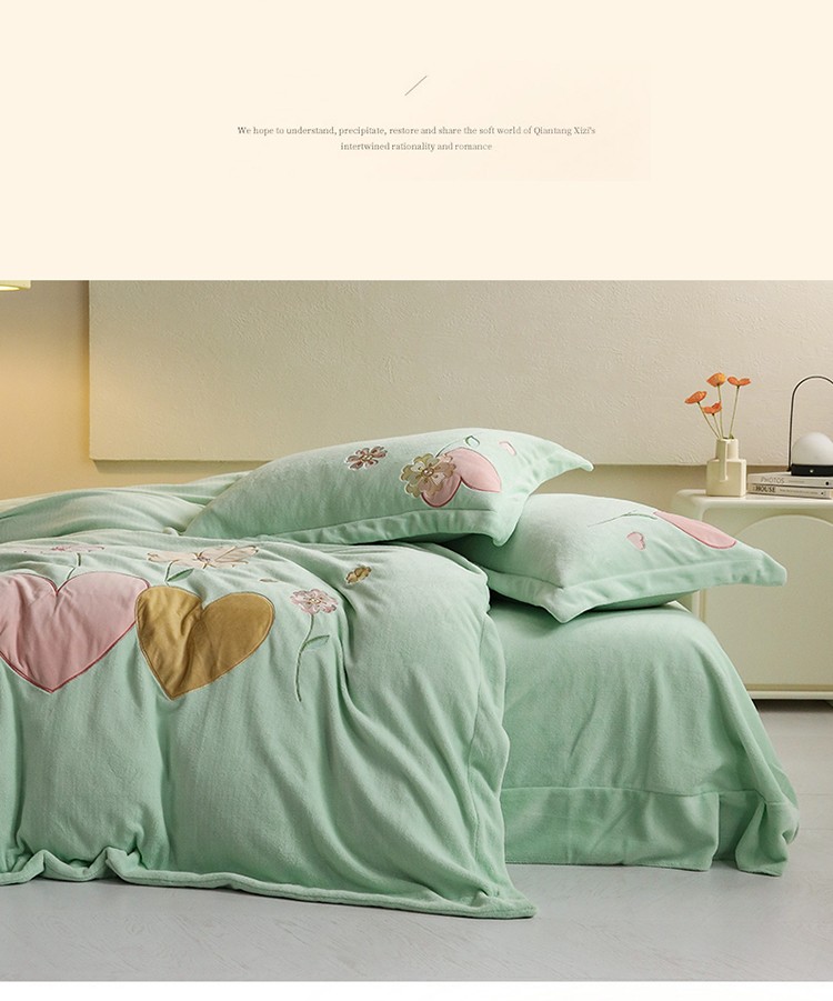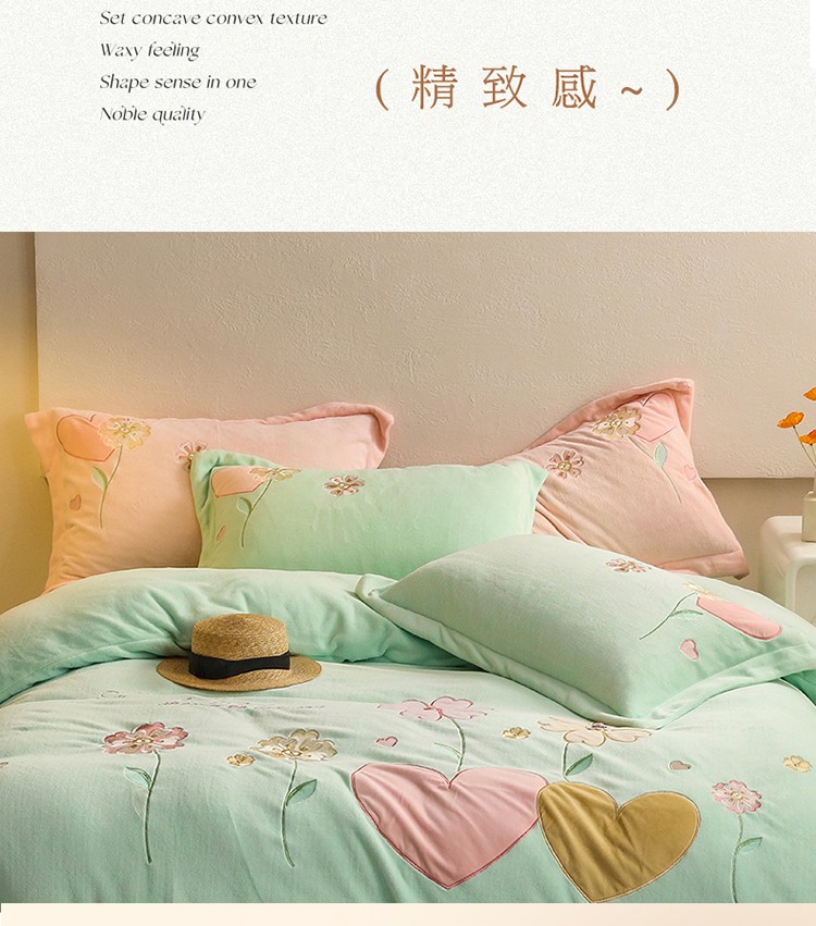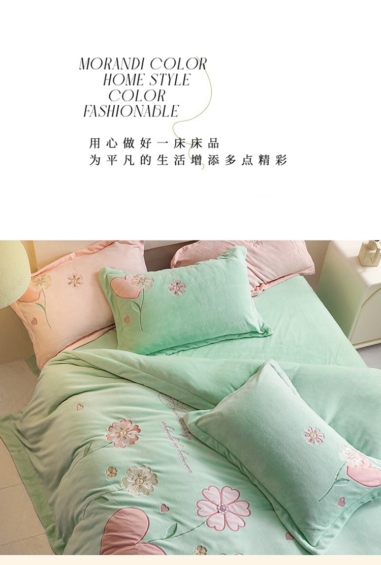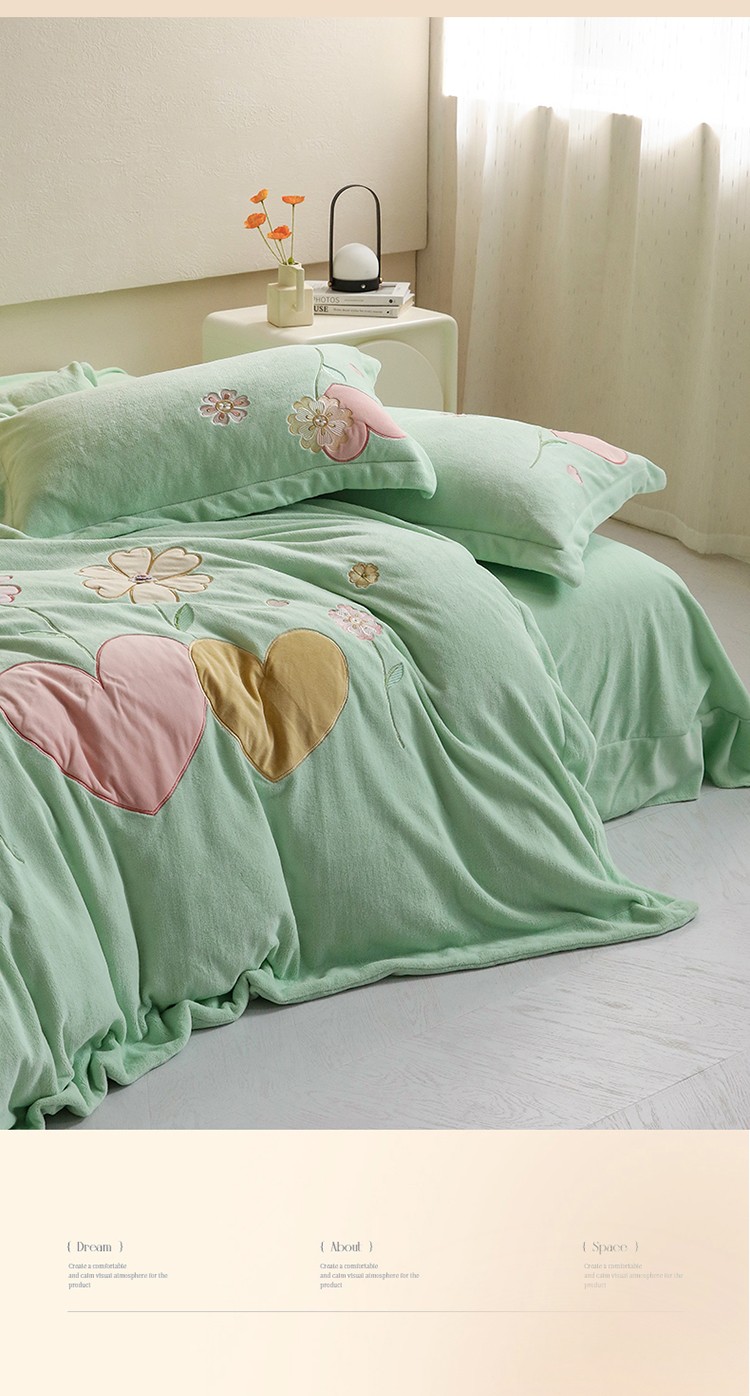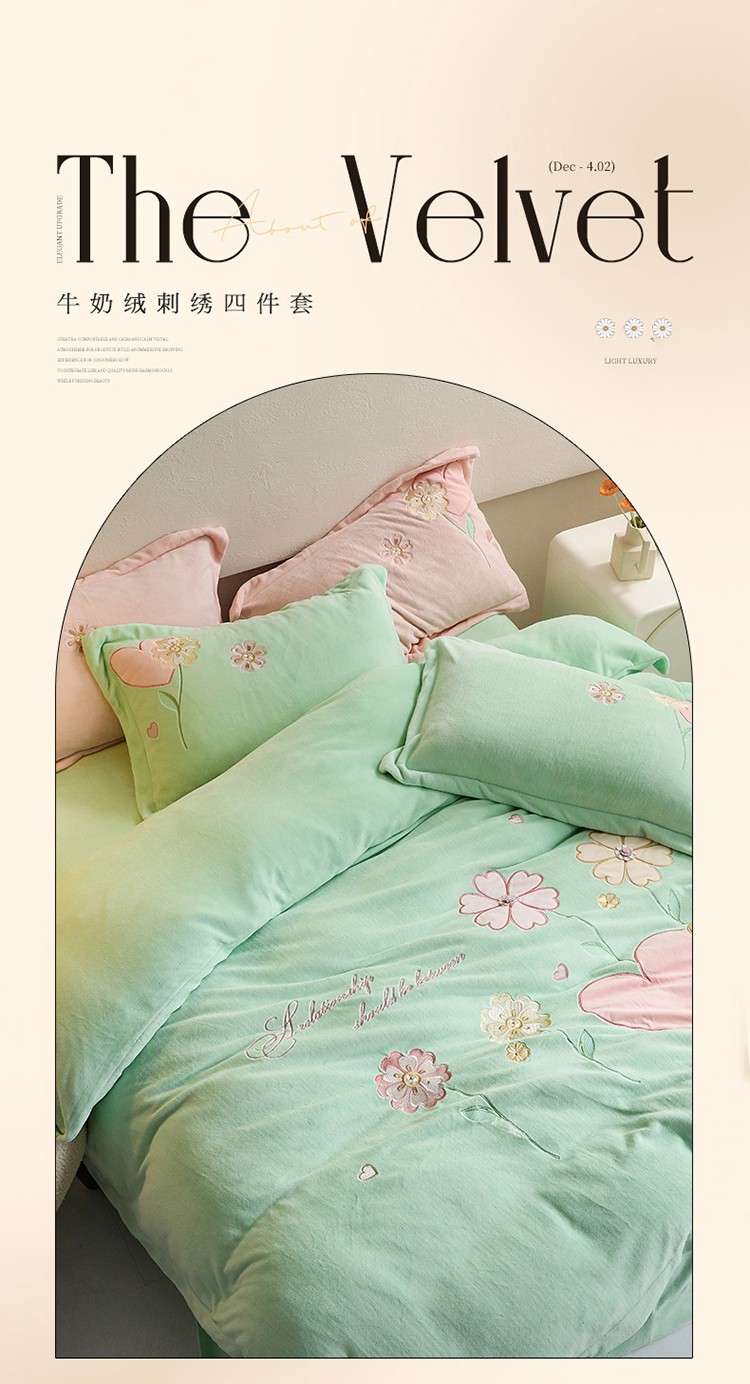 商品名称:名品优仓2022新款大贴布绣刺绣牛奶绒230克四件套彩色甜心 清脆绿