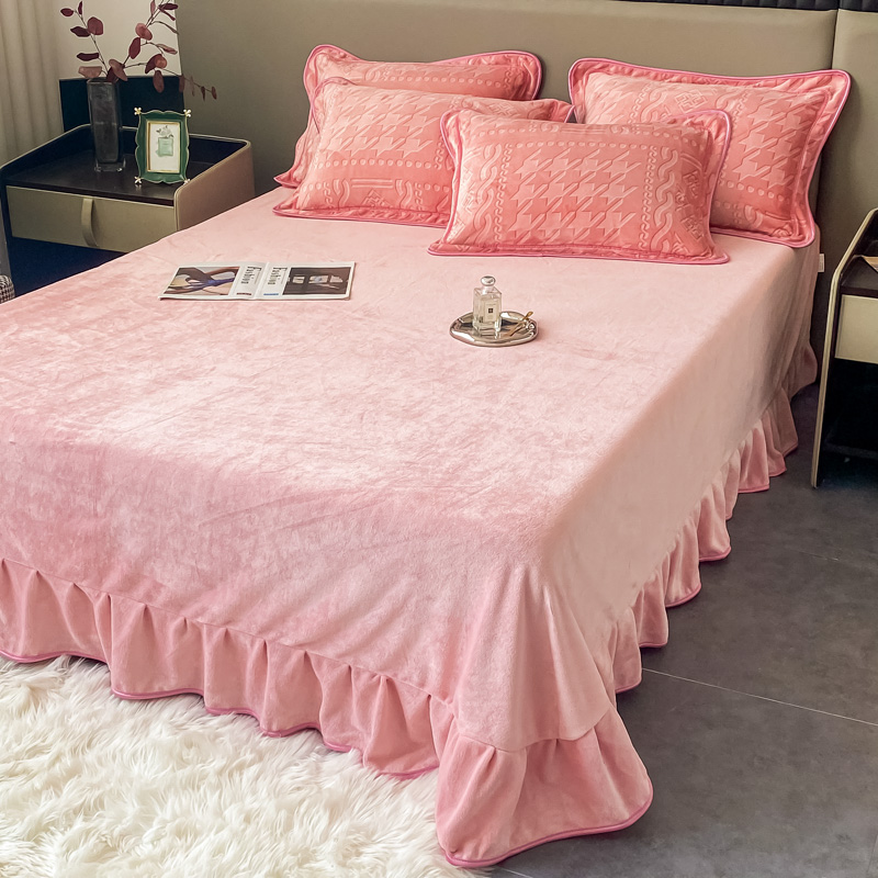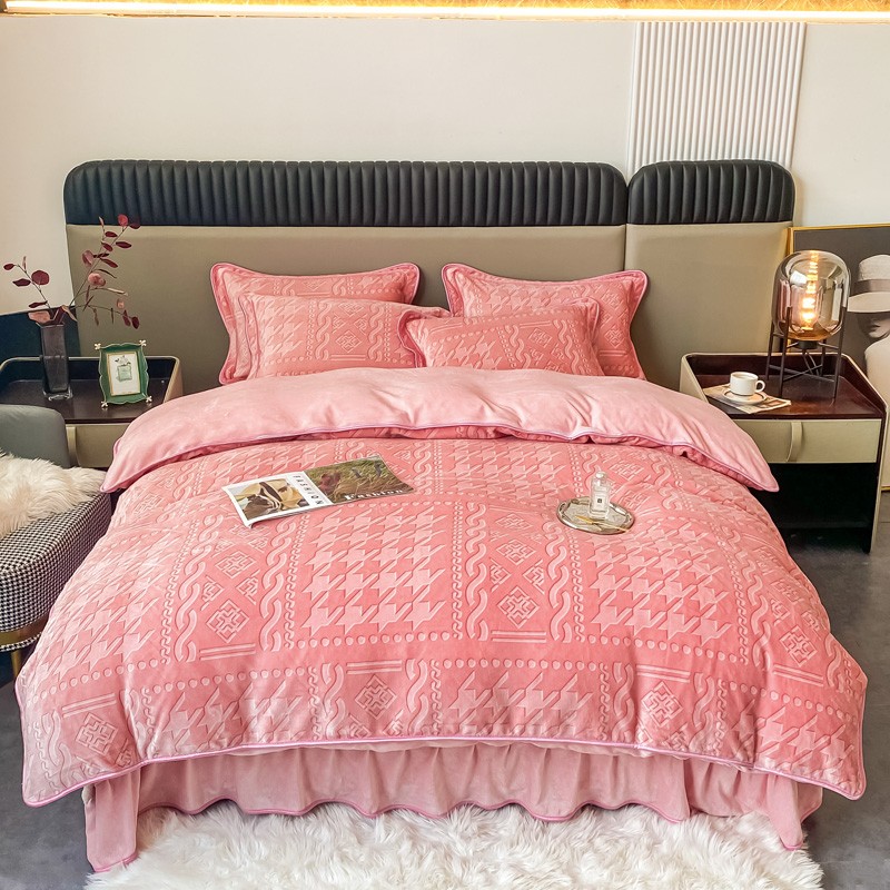 首选家纺 2023新款AB版床裙款牛绒四件套 千鸟格-粉