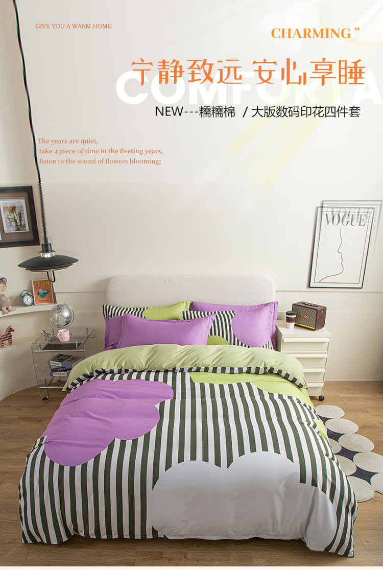 商品名称:宏源 2023新款大版数码印花糯糯棉四件套 三色花