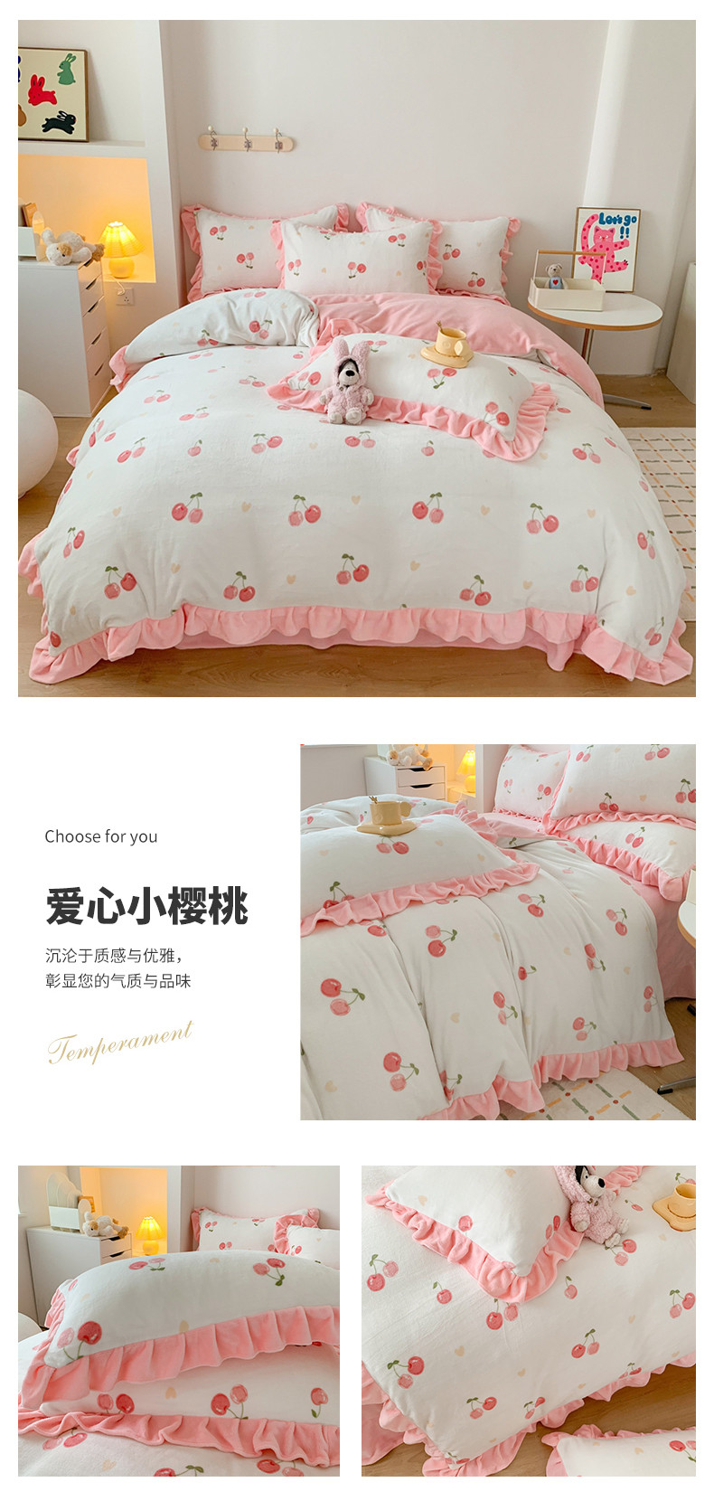 商品名称:吾欢心 2024新款韩版花边牛奶绒四件套 爱心小樱桃