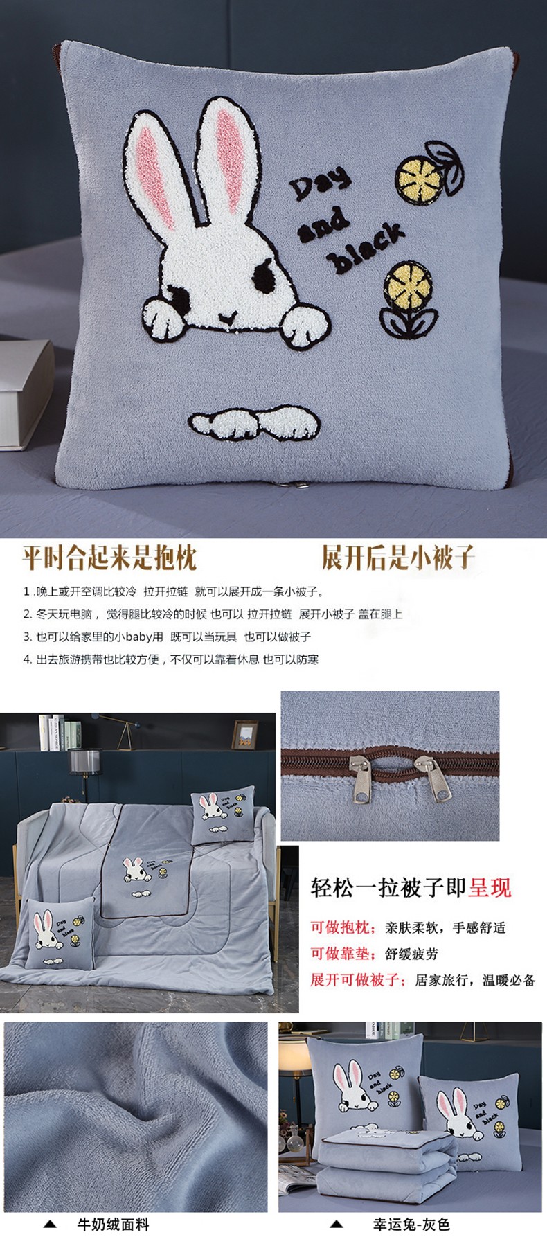 商品名称:伊可爱抱枕被 2023新款牛奶绒绣花抱枕被 幸运兔-灰色