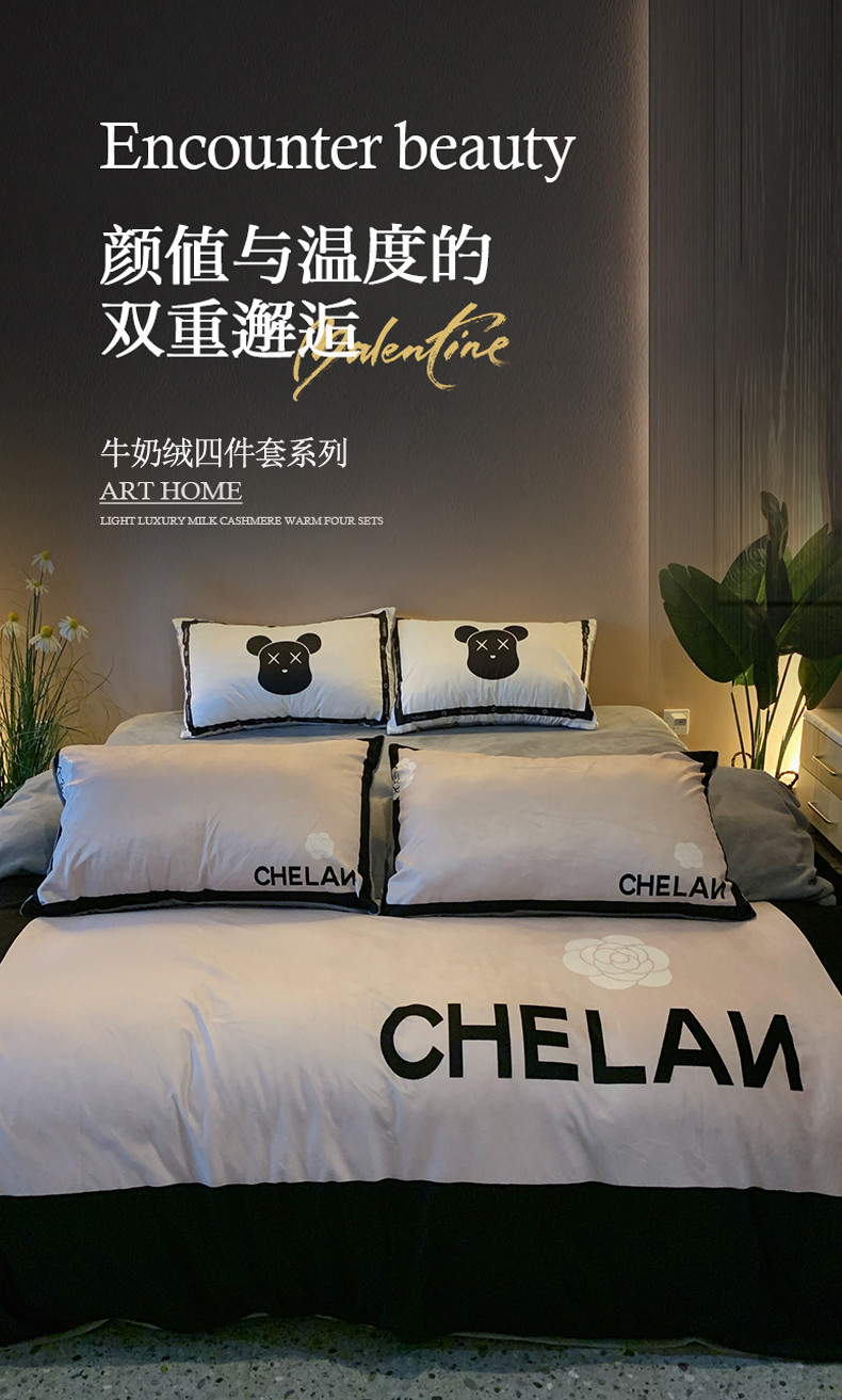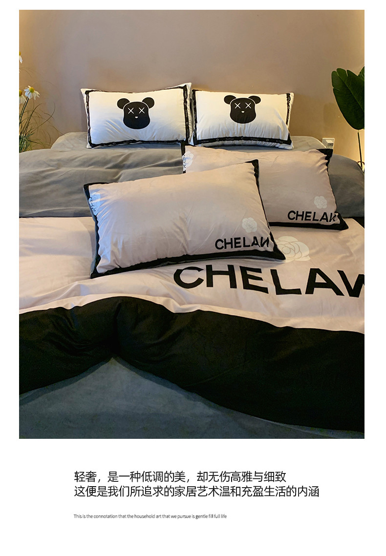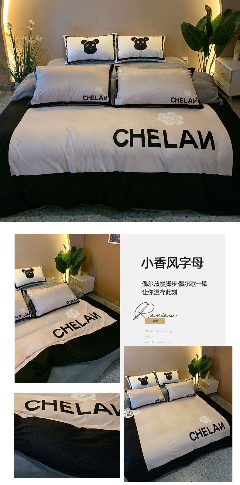商品名称:色鬼布艺 2023新款活性数码印花牛奶绒四件套-场景二 小香风字母