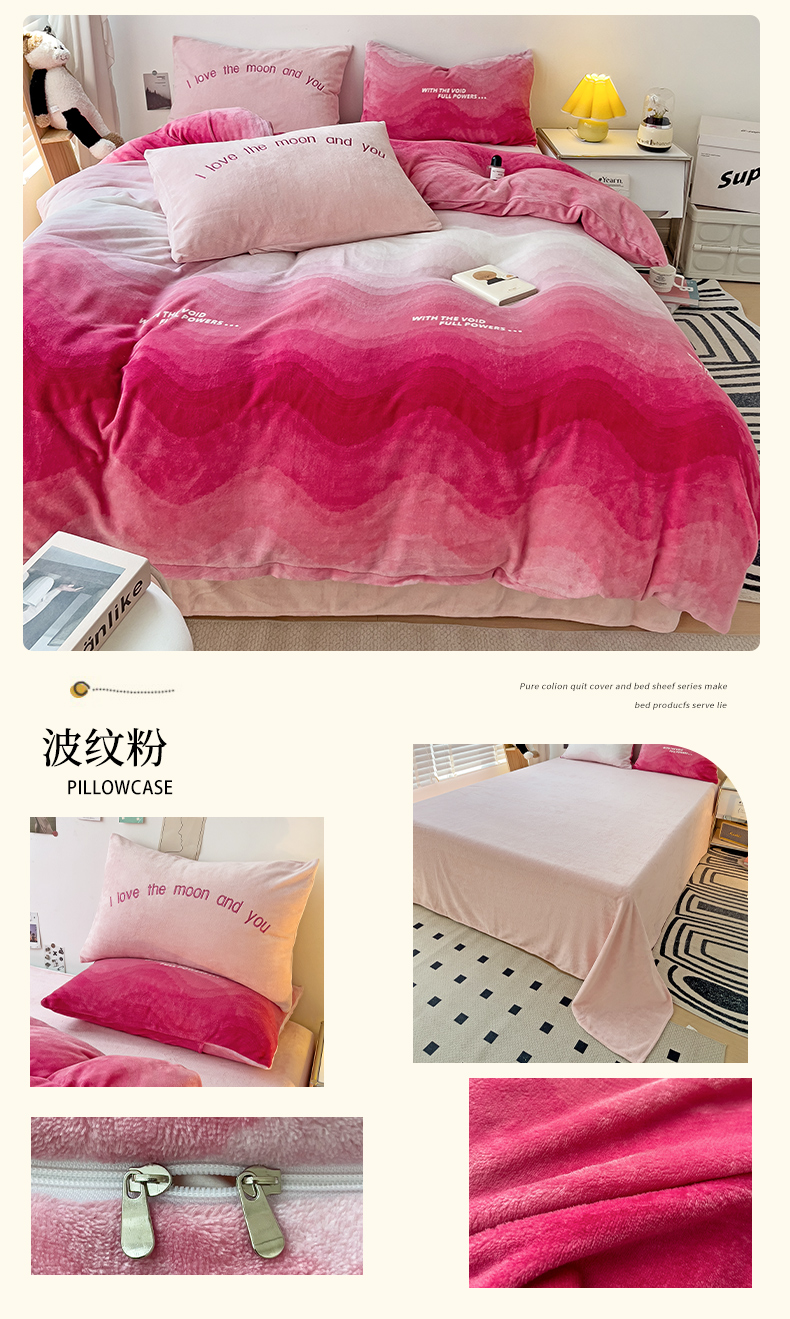 山茶家纺 2023新款高克重牛奶绒印花四件套 波纹 粉