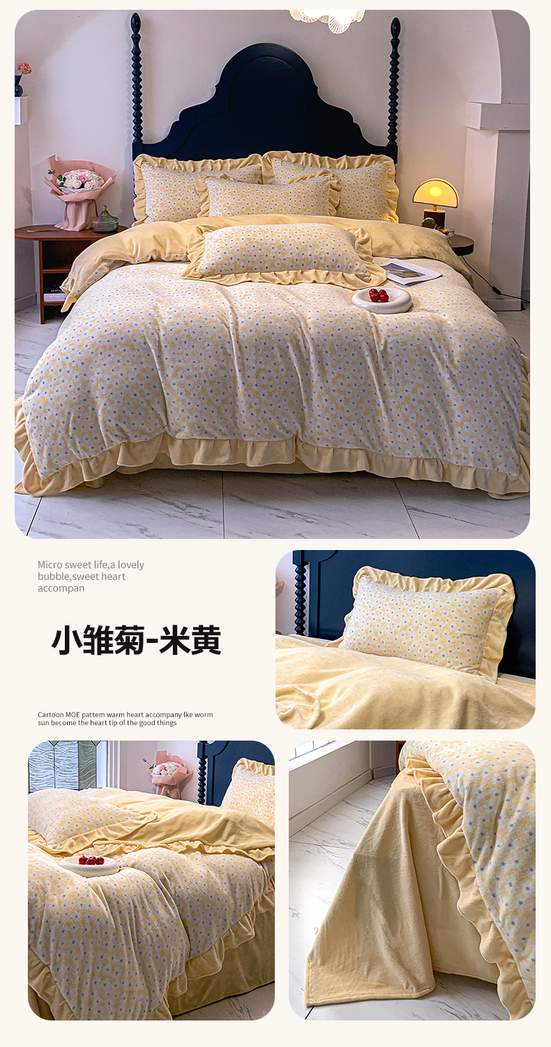 商品名称:春光里-2023新款高克重花边款直播热卖牛奶绒四件套 小雏菊-米黄