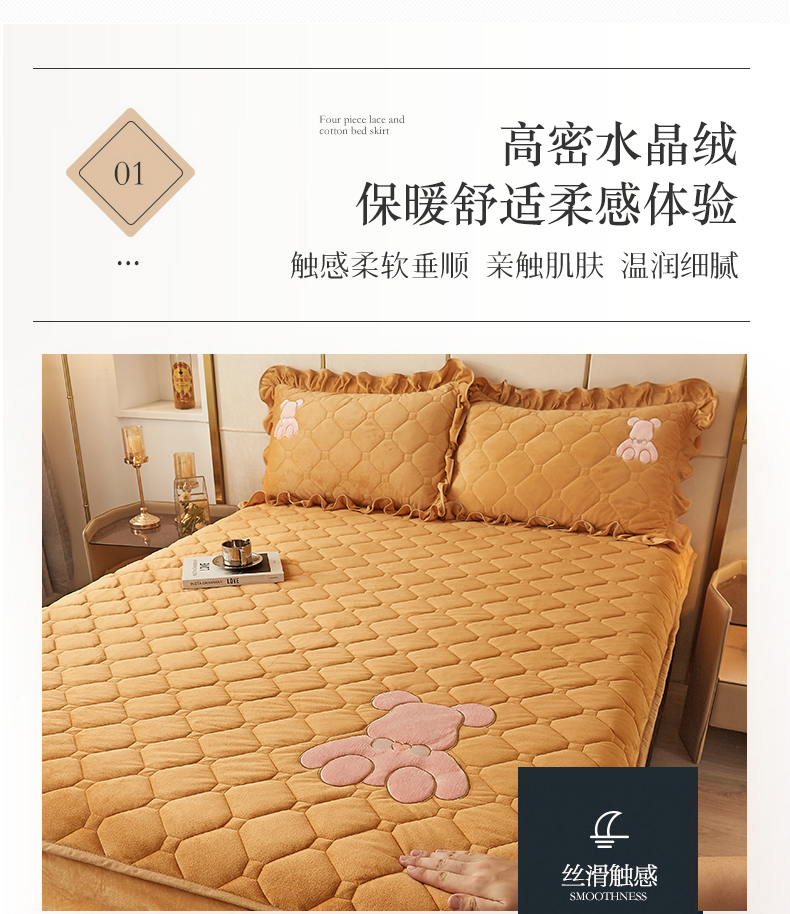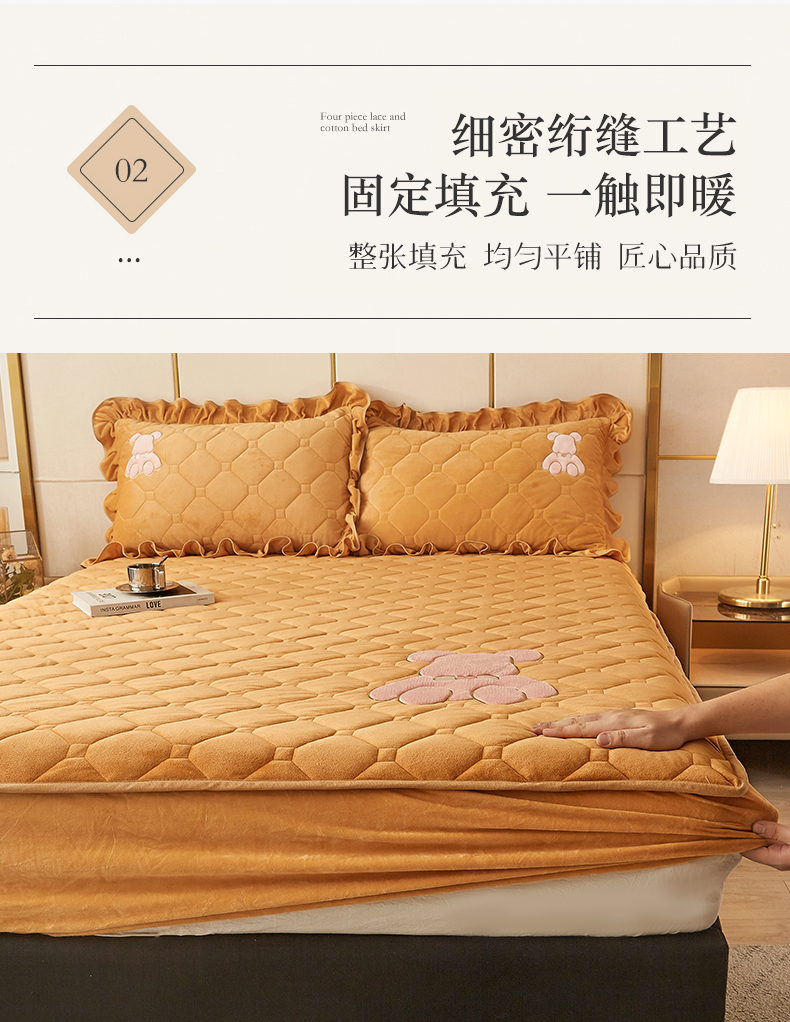 (总)屹成家纺2025新款水晶绒夹棉绗缝蕾丝床裙三件套(塞纳河畔)床裙单件起售价不低于105元,大红,豆沙,翡翠绿,粉玉,橄榄绿,蔚蓝,银灰