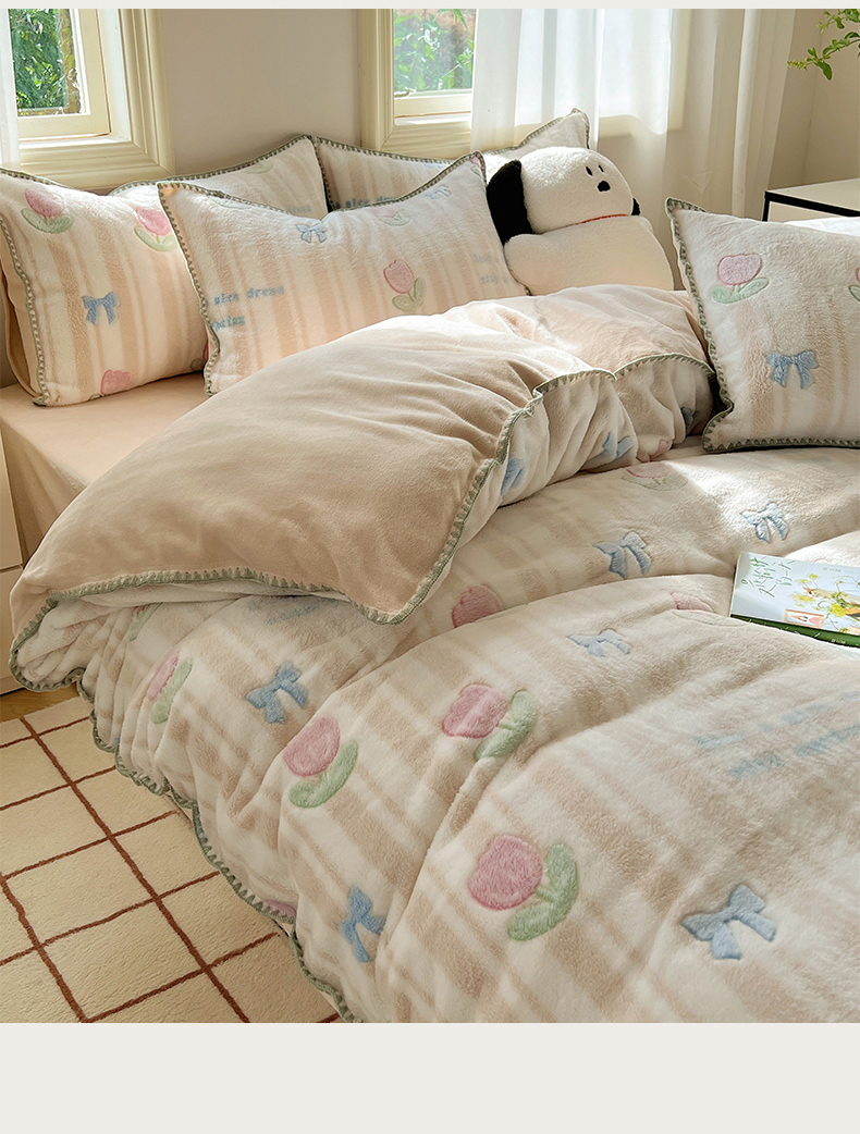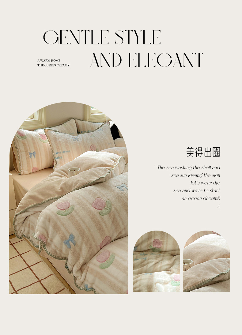 (总)三朵家纺 2025新款3D立体加厚雕花绒牛奶绒花边款四件套,花边宽条-灰色,花边宽条-蓝色,花边宽条-玉色,花边宽条-紫