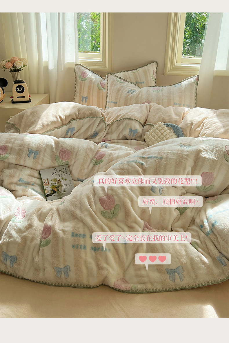三朵家纺 2023新款高克重雪花绒绒混搭系列四件套 蝴蝶结草莓
