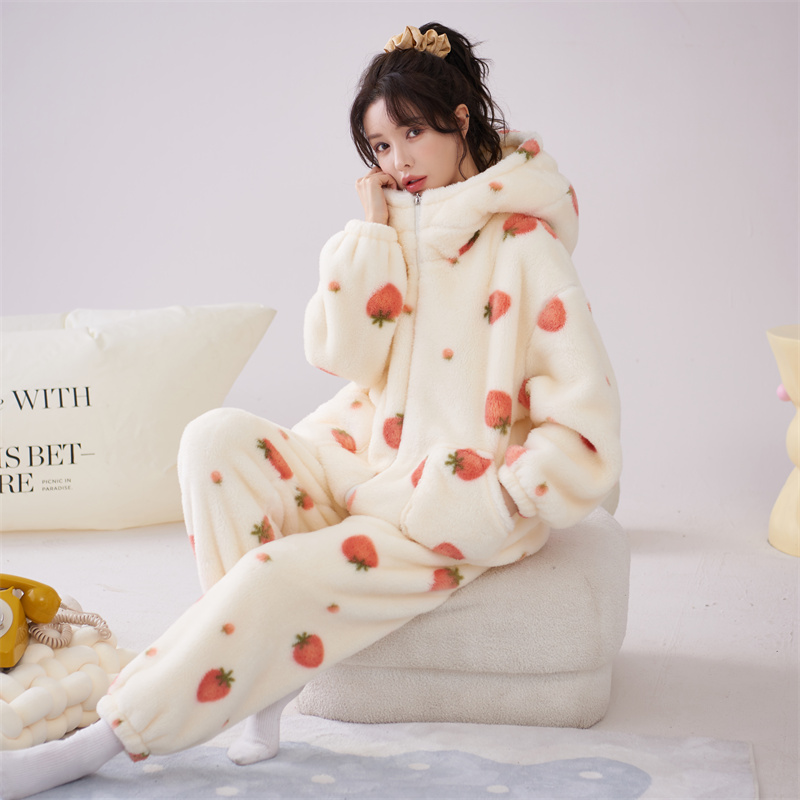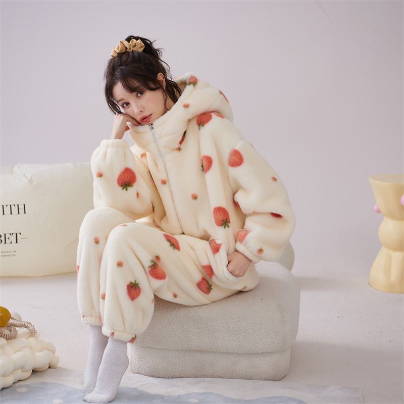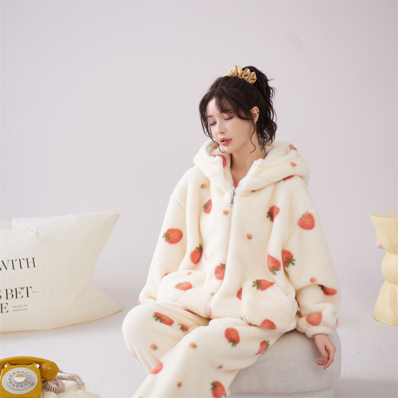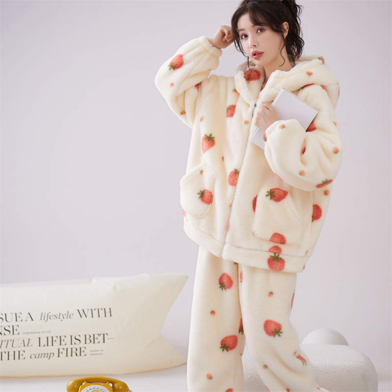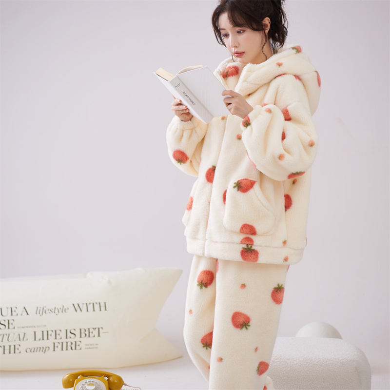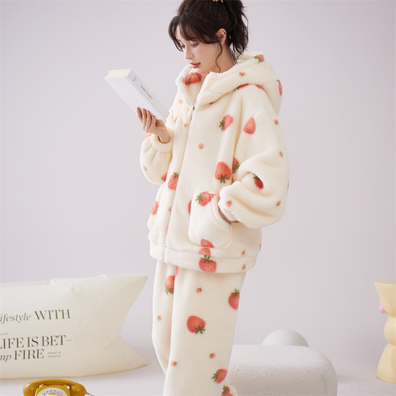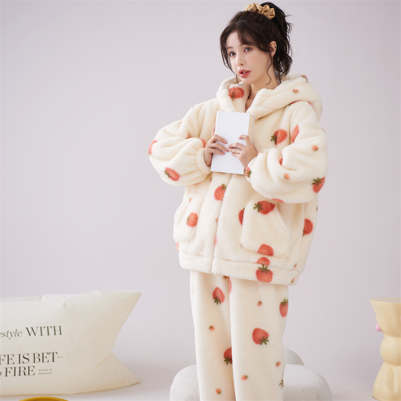 (总)洛兰沙家居馆 2024新款清新睡衣女秋冬三层夹棉珊瑚绒加厚保暖两件套女士可外穿加绒家居服,粉色,灰色,白色,玉色