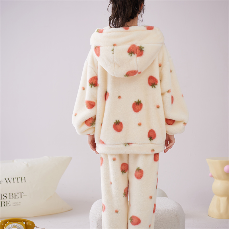 (总)洛兰沙家居馆 2024新款秋冬季清新款睡衣女三层夹棉珊瑚绒加厚保暖两件套女士可外穿加绒家居服,白色