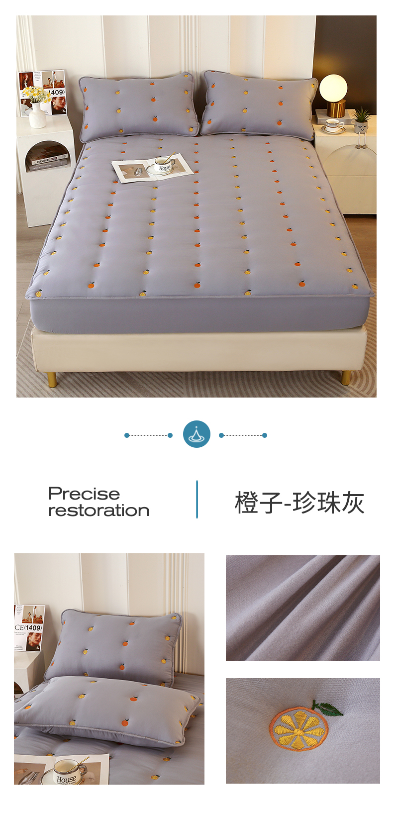 商品名称:贝拉梦家纺 2024直播新款A类刺绣水洗棉床褥式大豆夹棉床笠 橙子-珍珠灰