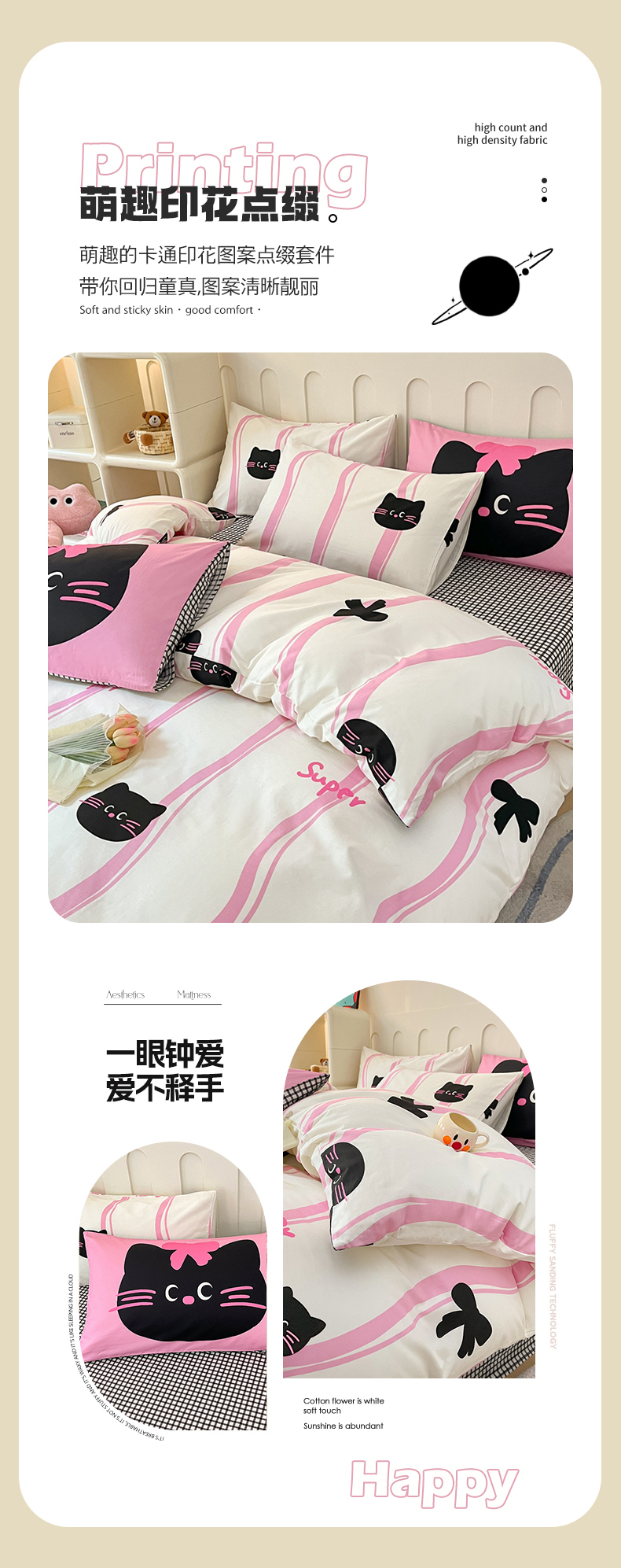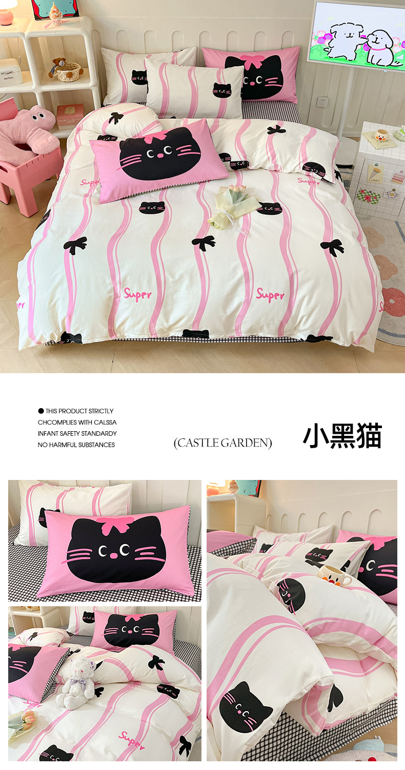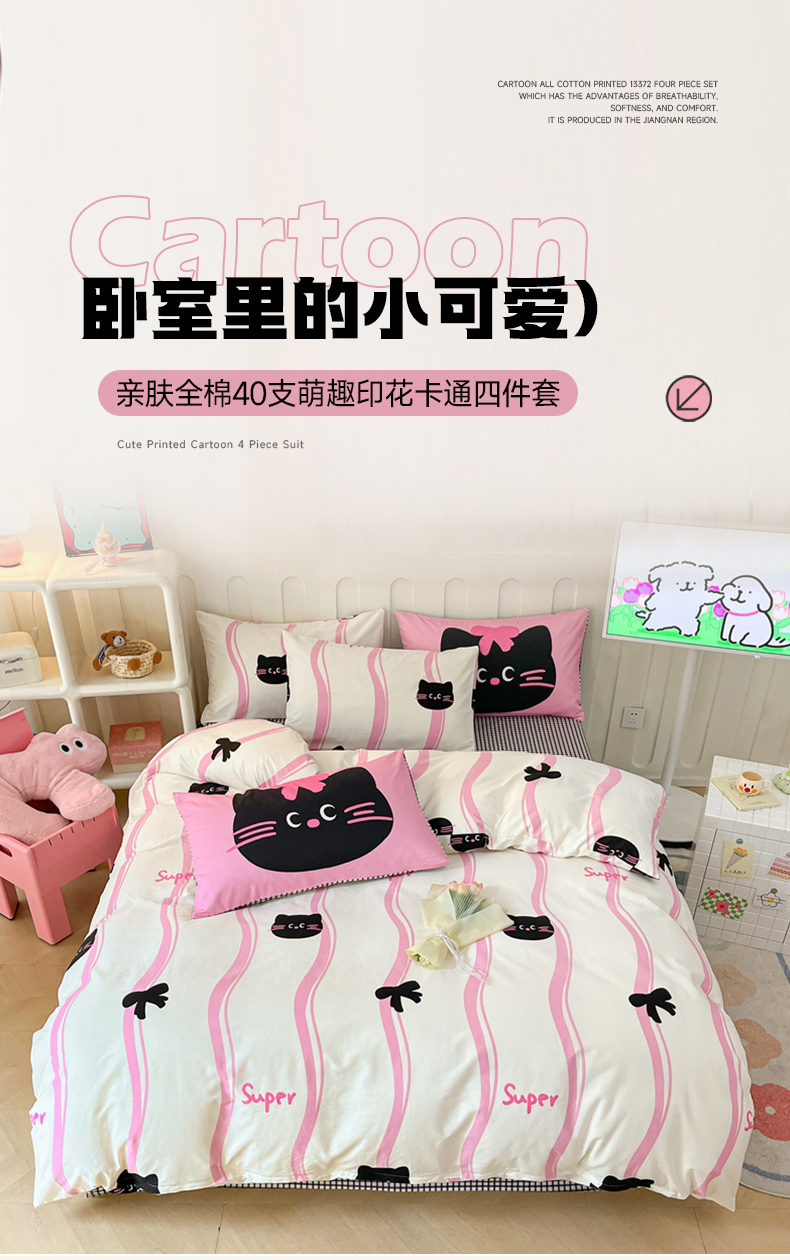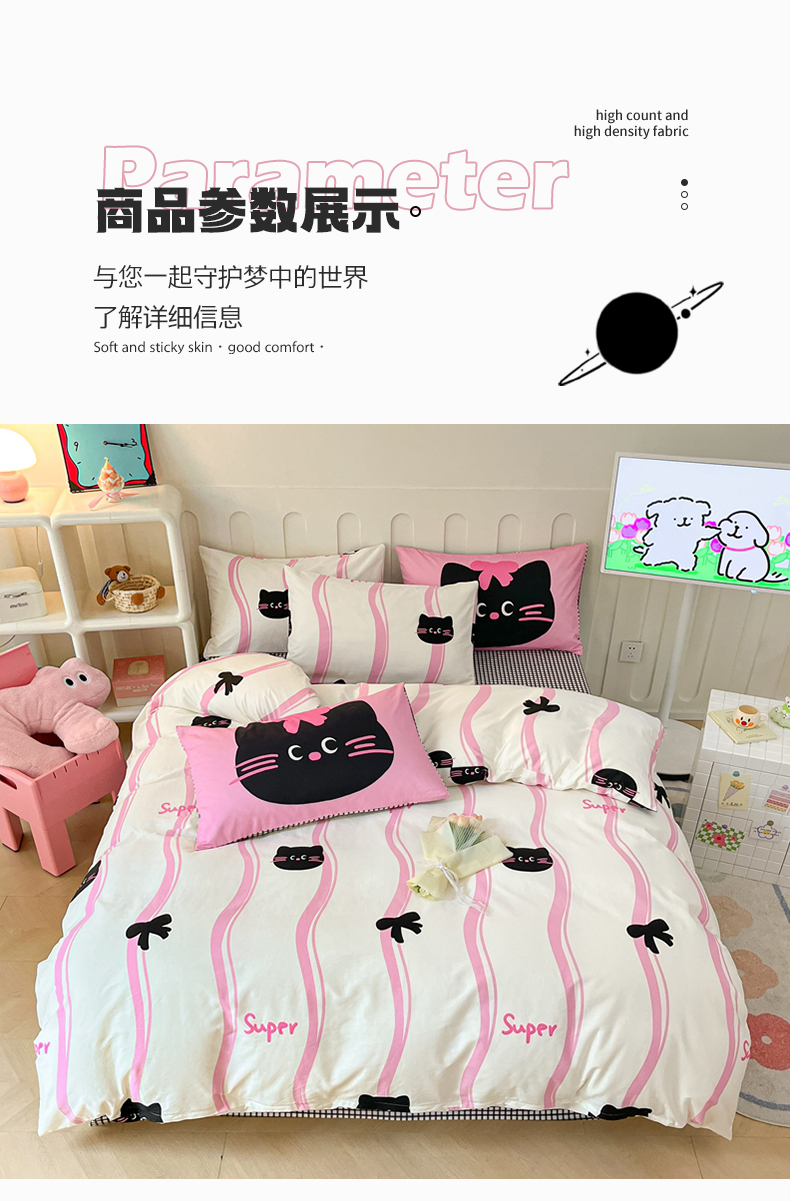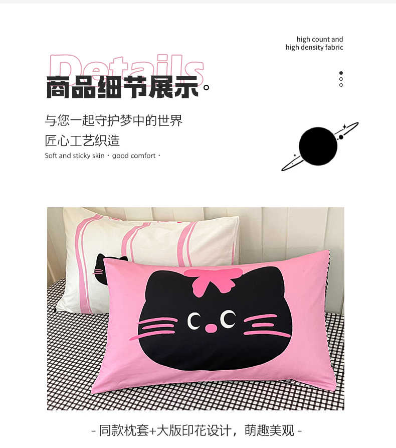 商品名称:呗旺鹿 2024新款舒适亲肤全棉40支大平网定位枕萌趣印花卡通四件套 小黑猫