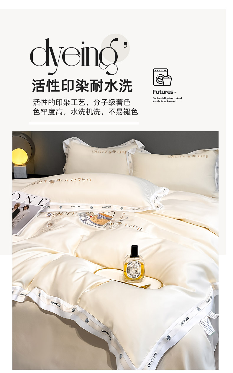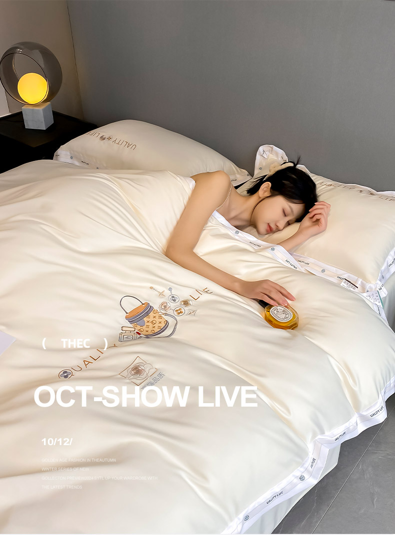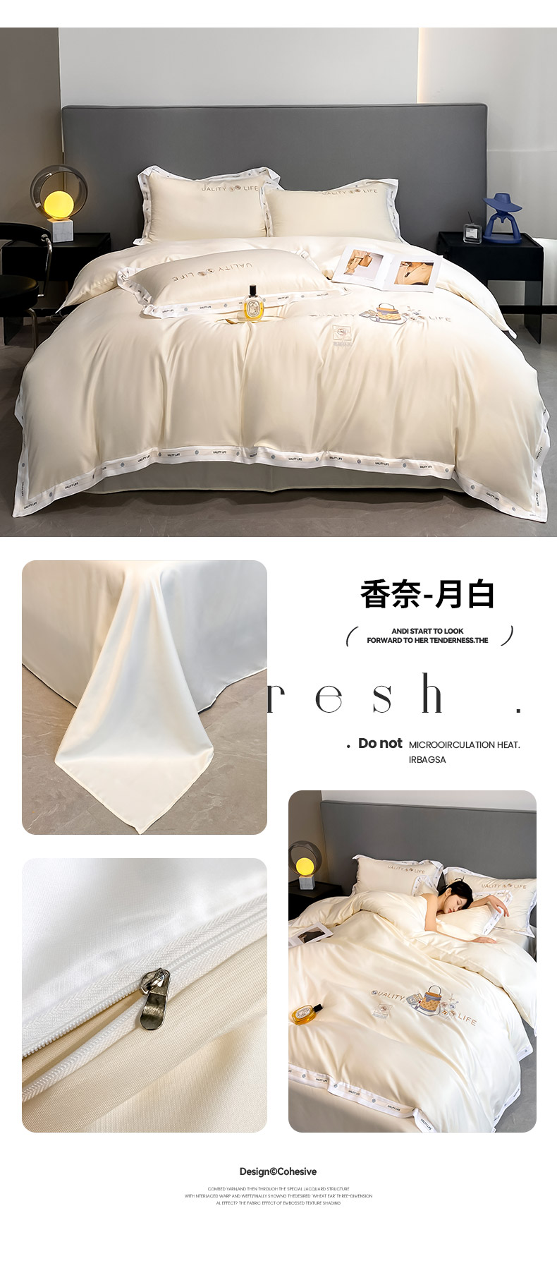 丝印良品 2024新款大牌风60S水洗真丝刺绣床笠被套四件套香奈系列 香奈-月白