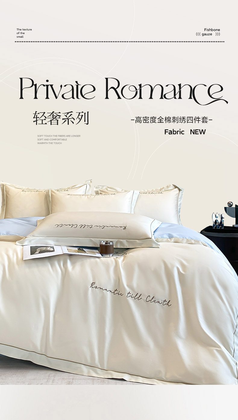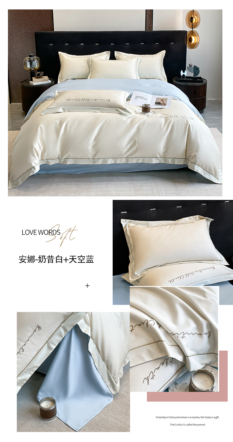 当前位置: 91家纺网 > 商品网购 > 床品套件 > 四件套 > 全棉普通四件套 > 拼社家纺 2024 全棉长绒棉纯棉四件套刺绣轻奢床上用品-安娜系列 安娜-奶昔白+天空蓝