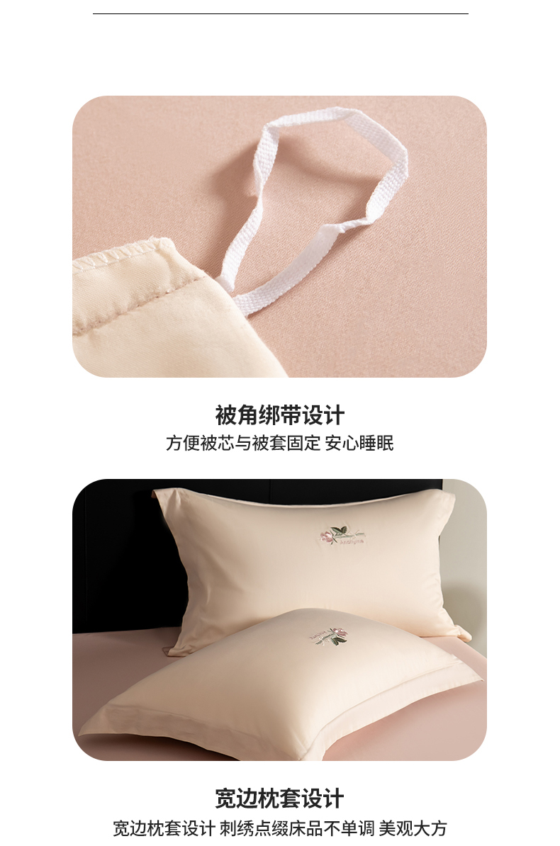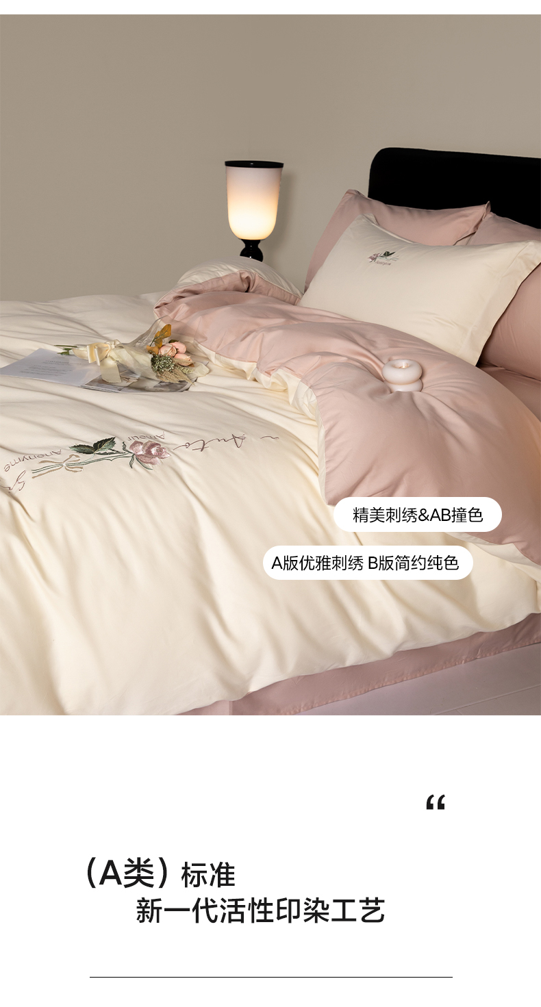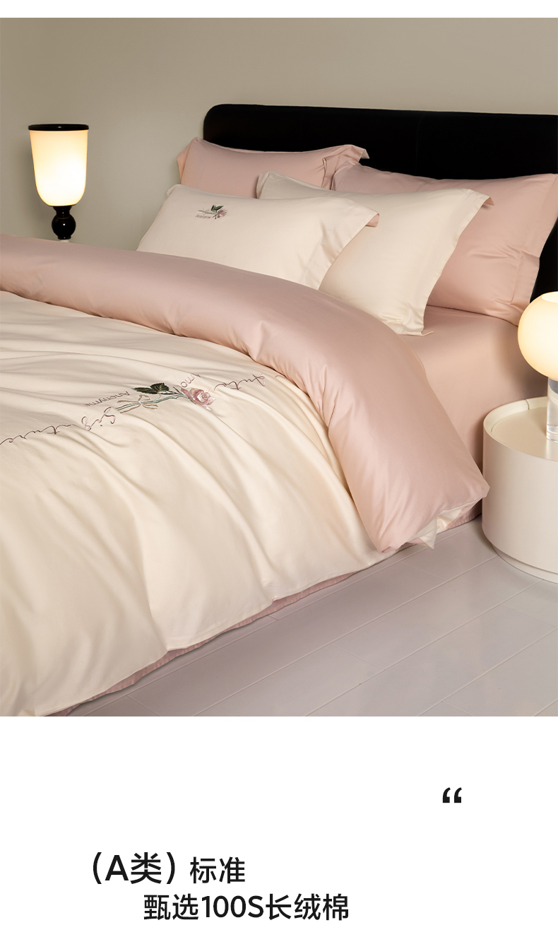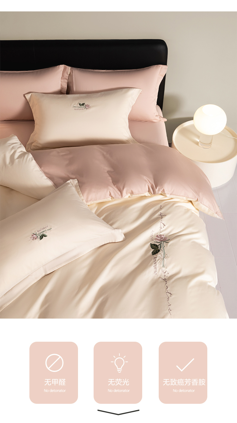 商品名称:秀色家纺 2025新款轻奢60支贡缎长绒纯棉四件套全棉简约清新刺绣花被套床单高级感 唤醒-奶昔白+茱萸粉