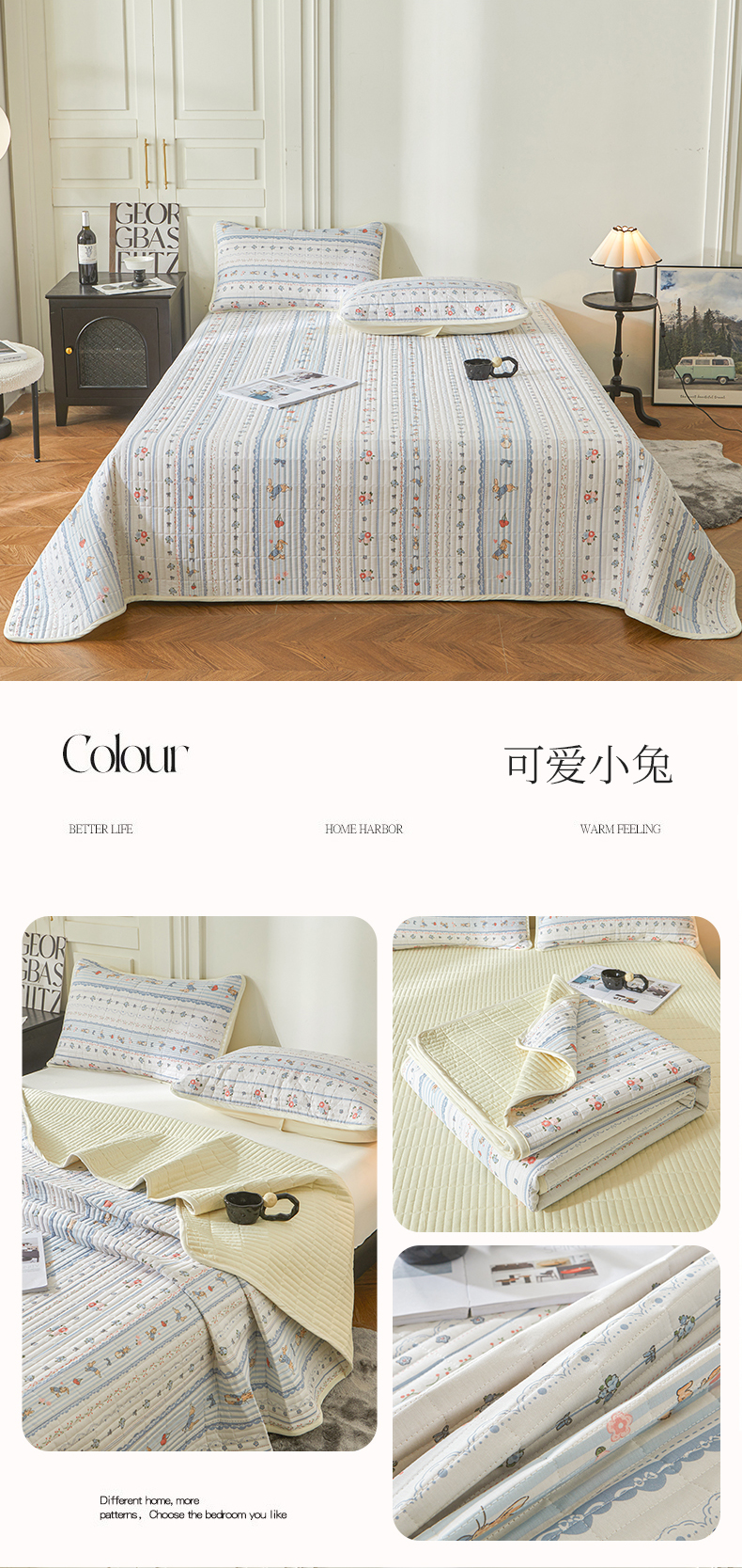 • 91家纺网 家纺一手货源 找家纺 雅萱家纺 2024新款全棉碎花床盖系列 可爱小兔