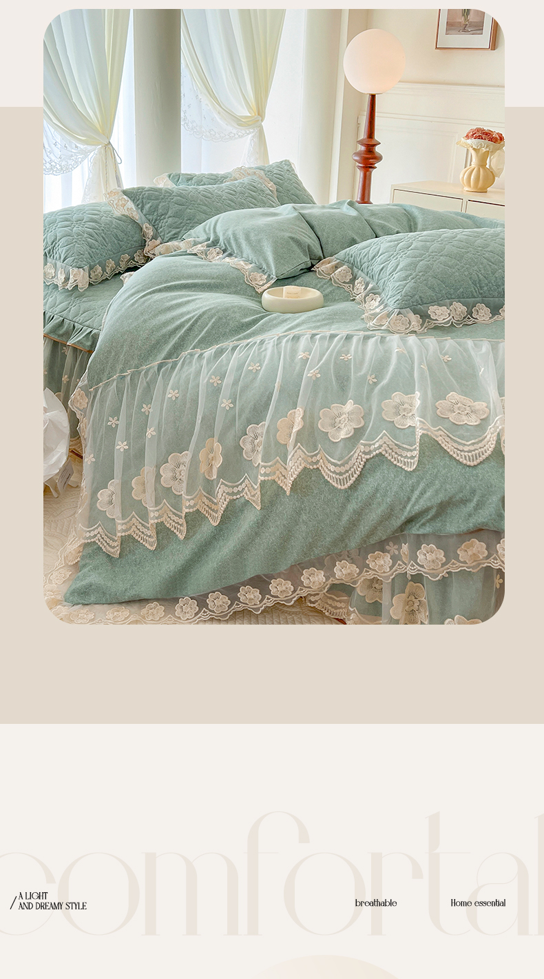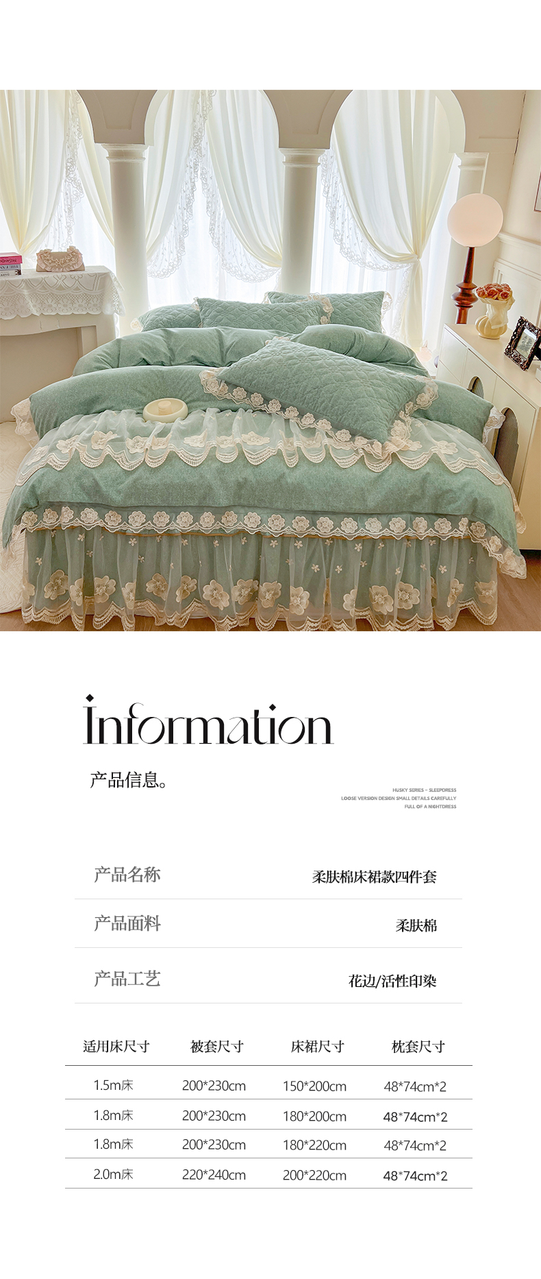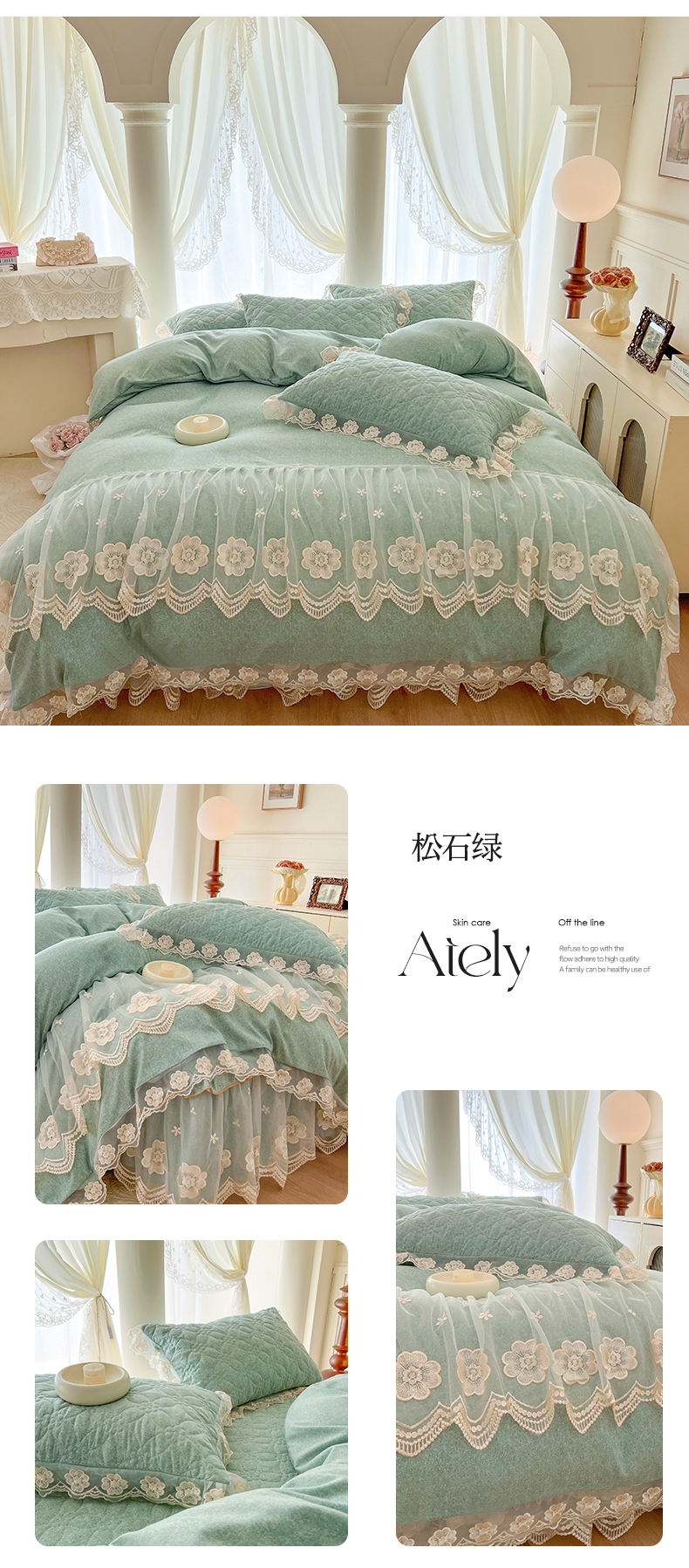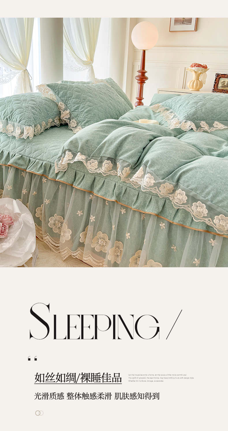 当前位置: 91家纺网 > 商品网购 > 床品套件 > 四件套 > 化纤普通四件套 > 网红馆 2025新款柔肤棉四件套床裙花边款艾丽莎系列 松石绿