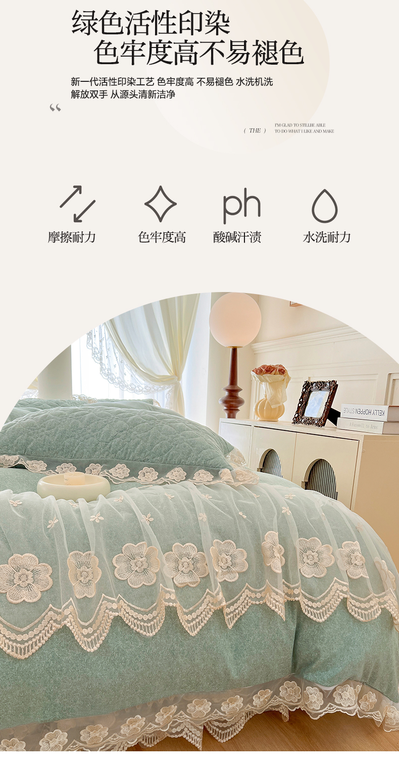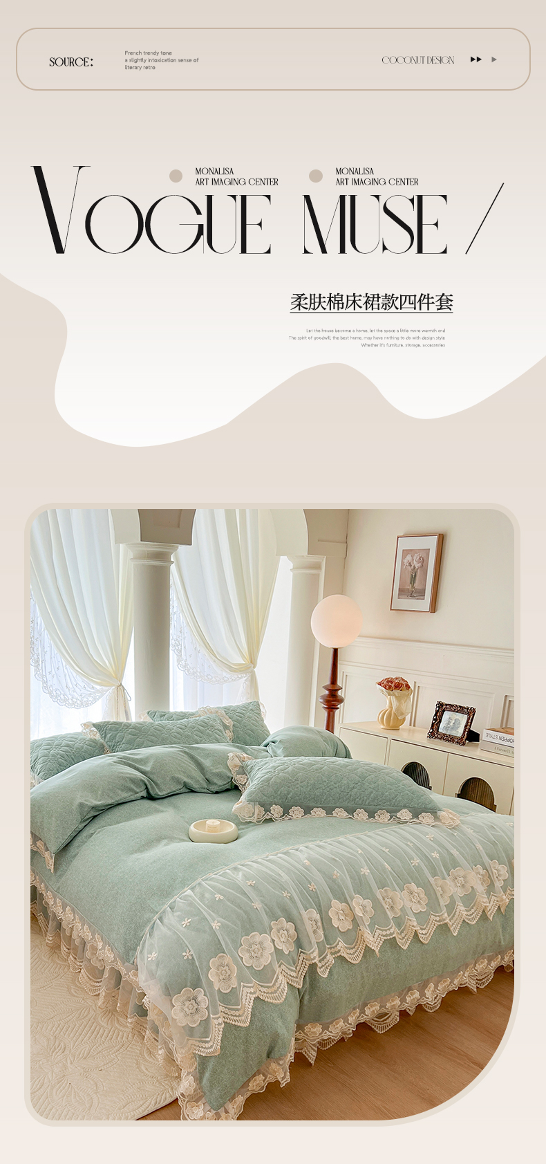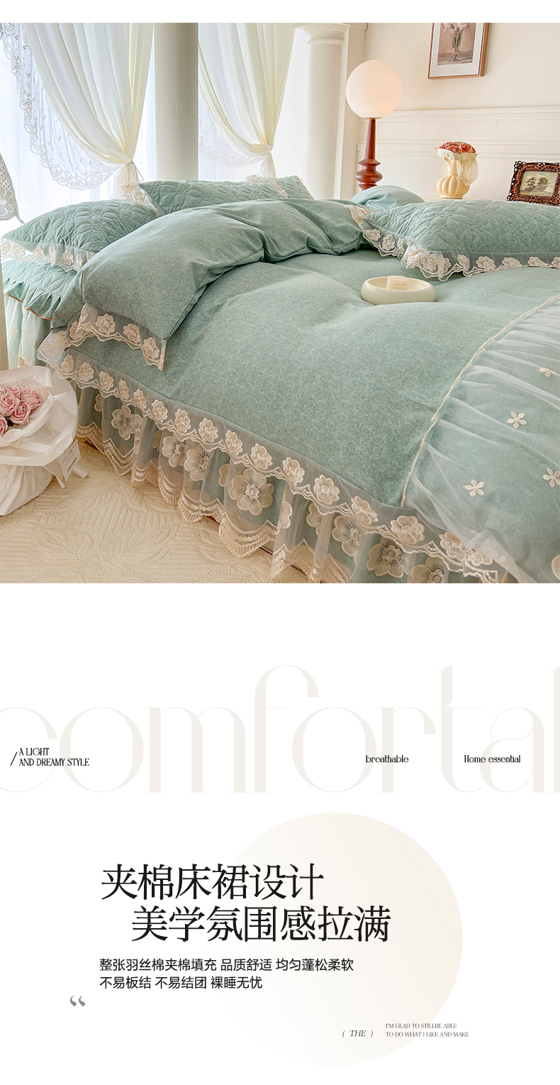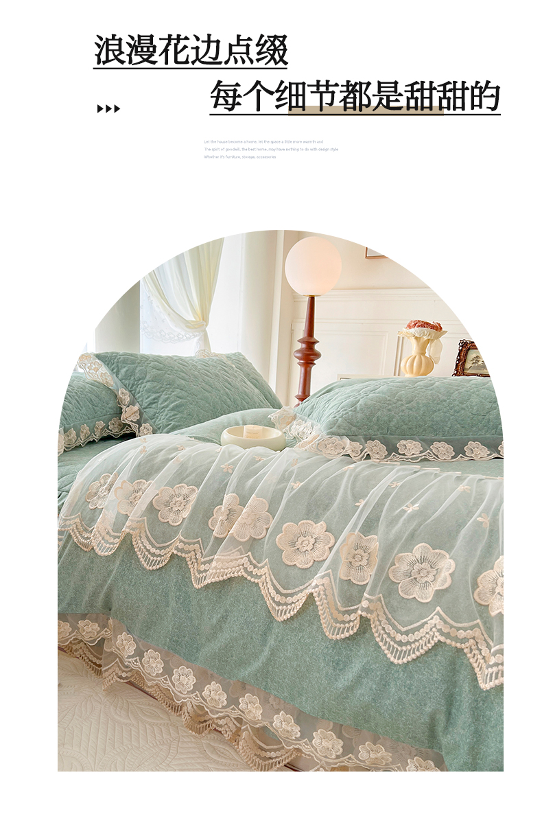 当前位置: 91家纺网 > 商品网购 > 床品套件 > 四件套 > 化纤普通四件套 > 网红馆 2025新款柔肤棉四件套床裙花边款艾丽莎系列 松石绿